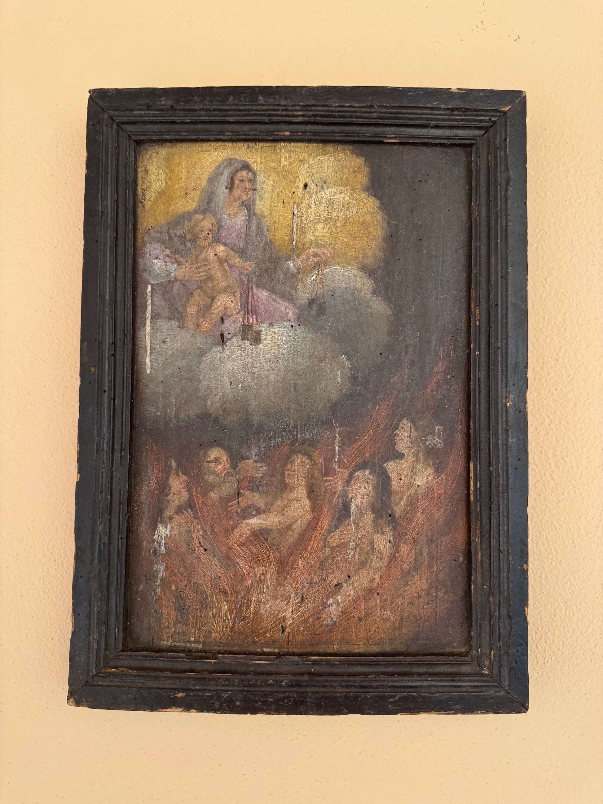 About the image: Roman Catholic and Orthodox Christians maintain that rather than dying Mary either fell asleep (known as the "dormition") or ascended (her "assumption") into heaven. But despite not dying herself, there are several different ancient texts that describe Mary descending into hell. There, she gets to witness the tortures and torments of those who lied, stole from the poor, committed adultery, and so forth. The earliest of these is the Book of Mary's Repose (Liber Requiei Marieae), which might have been written as early as the second or third centuries A.D. In the stories about her descent to hell, Mary is distressed by the agonies suffered by the damned and tries to intercede for them in order to alleviate their suffering.