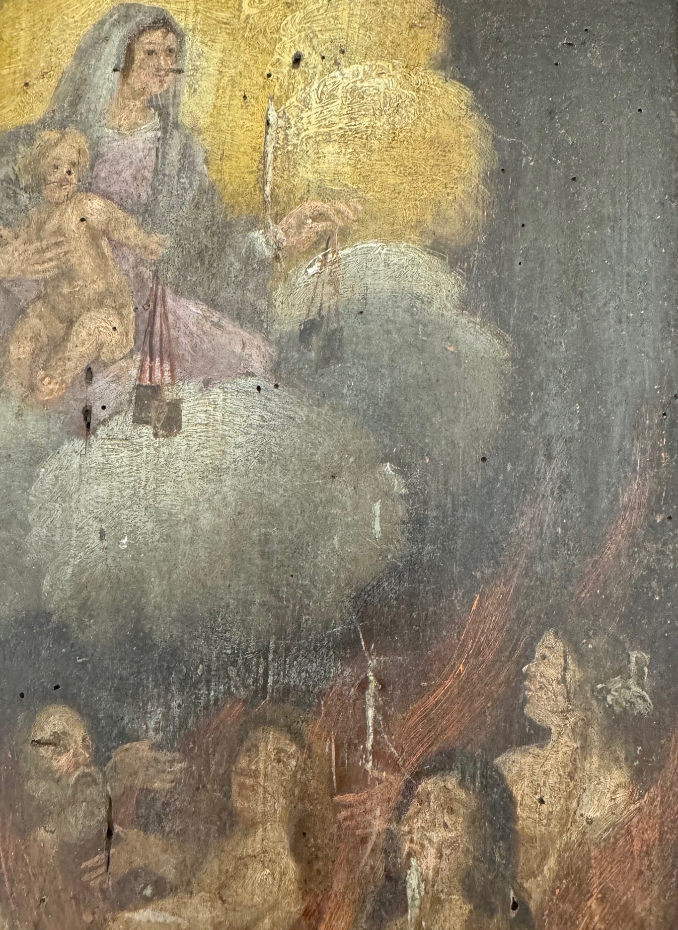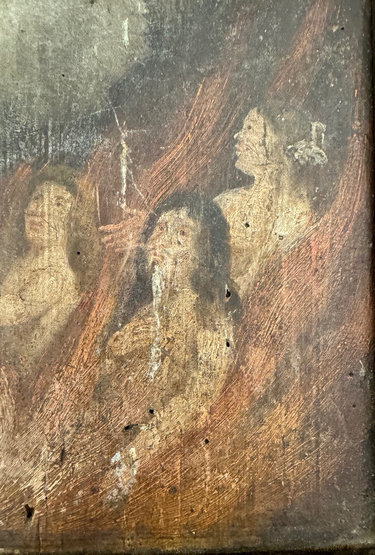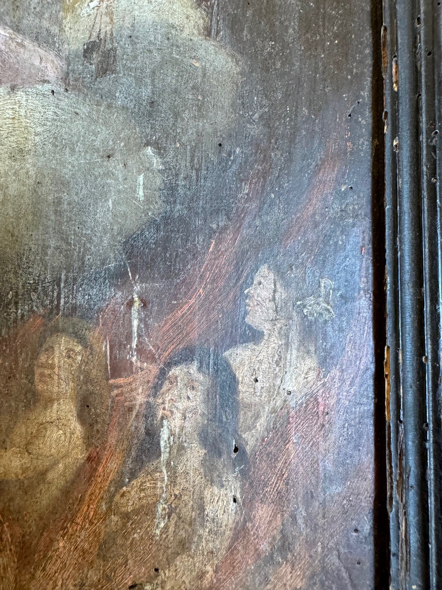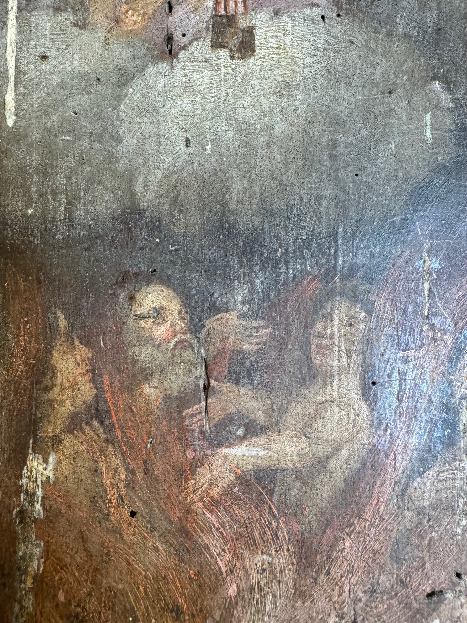 This painting is a quite crude 16th-century oil on panel with some major condition problems, but it is rare as such. There is extensive worming to the frame and panel, but both are holding very well, and the worm is not active. The painting needs a good clean.