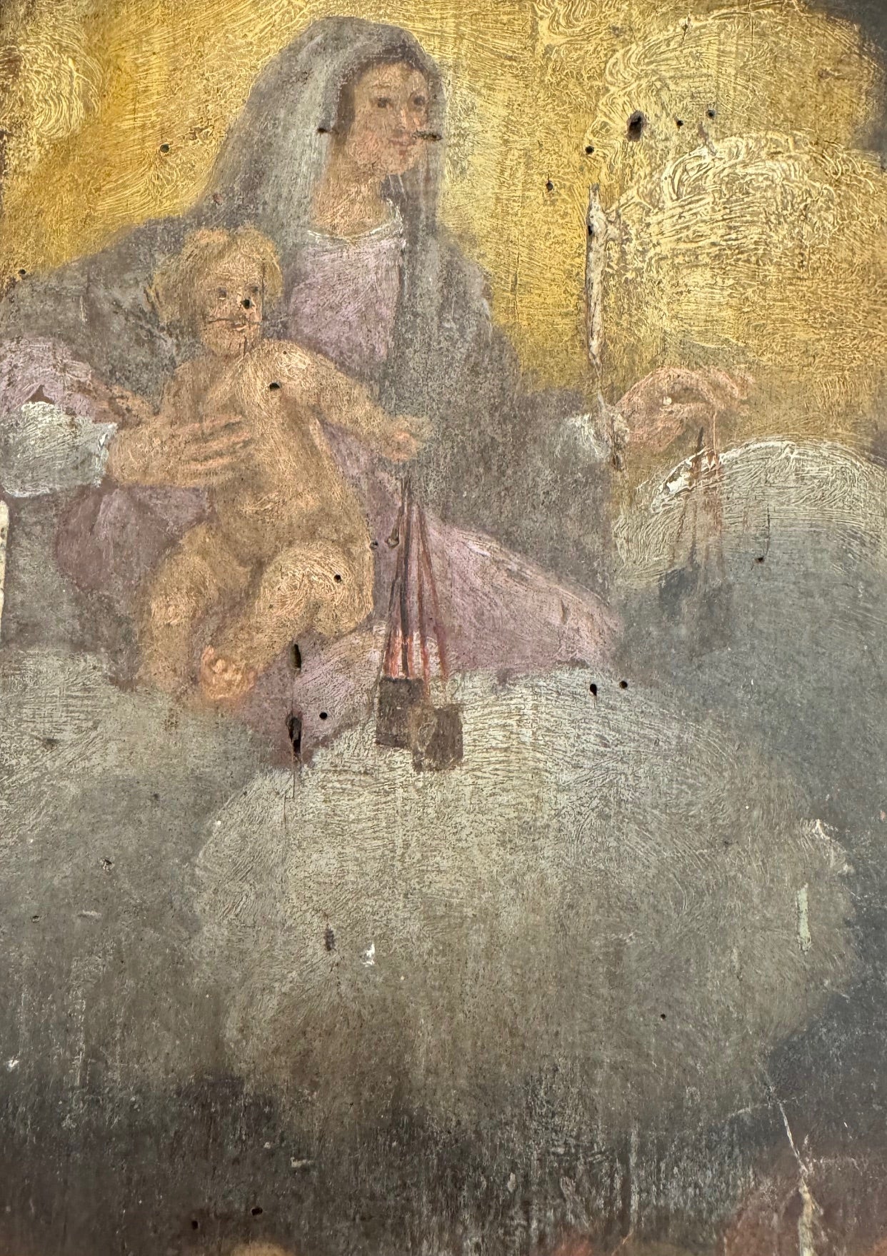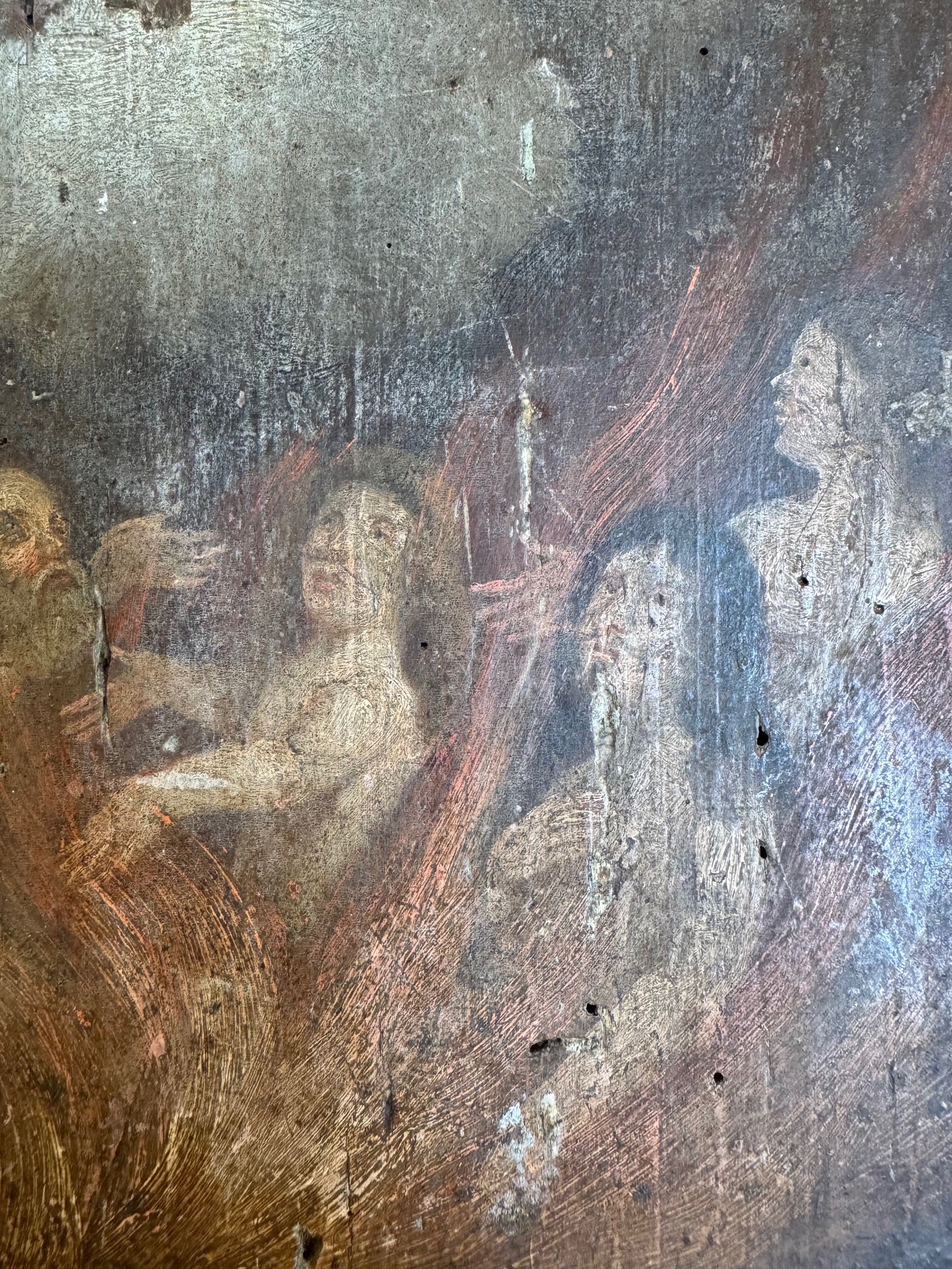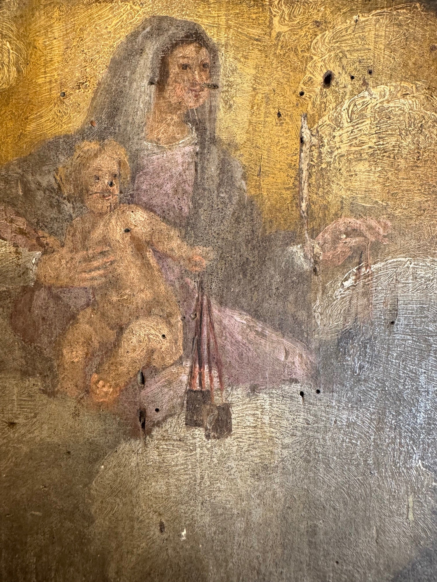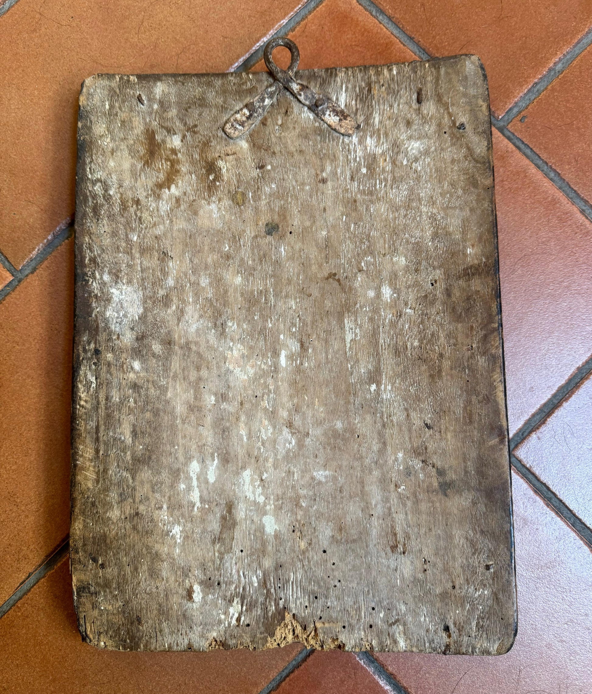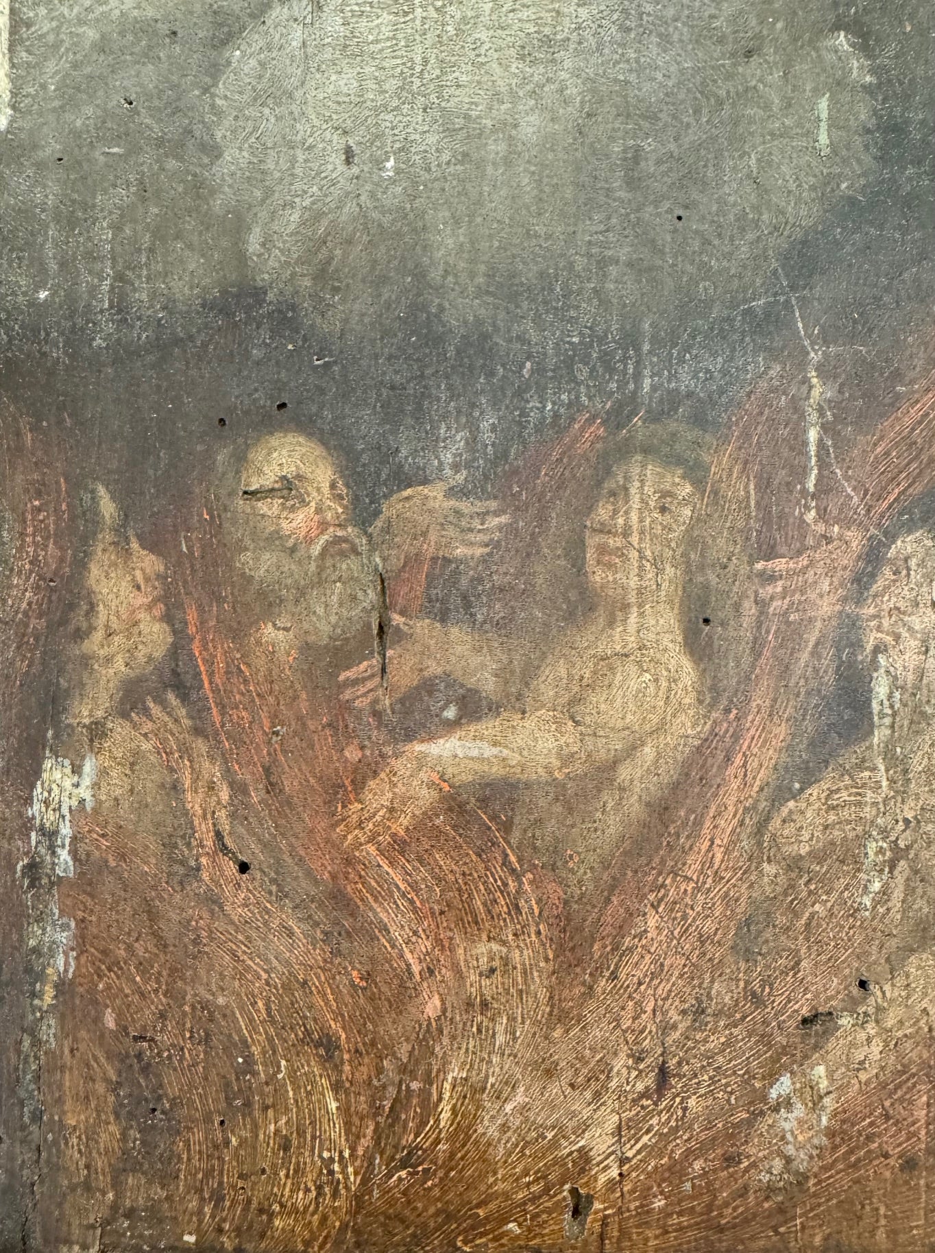 This painting is a quite crude 16th-century oil on panel with some major condition problems, but it is rare as such. There is extensive worming to the frame and panel, but both are holding very well, and the worm is not active. The painting needs a good clean.