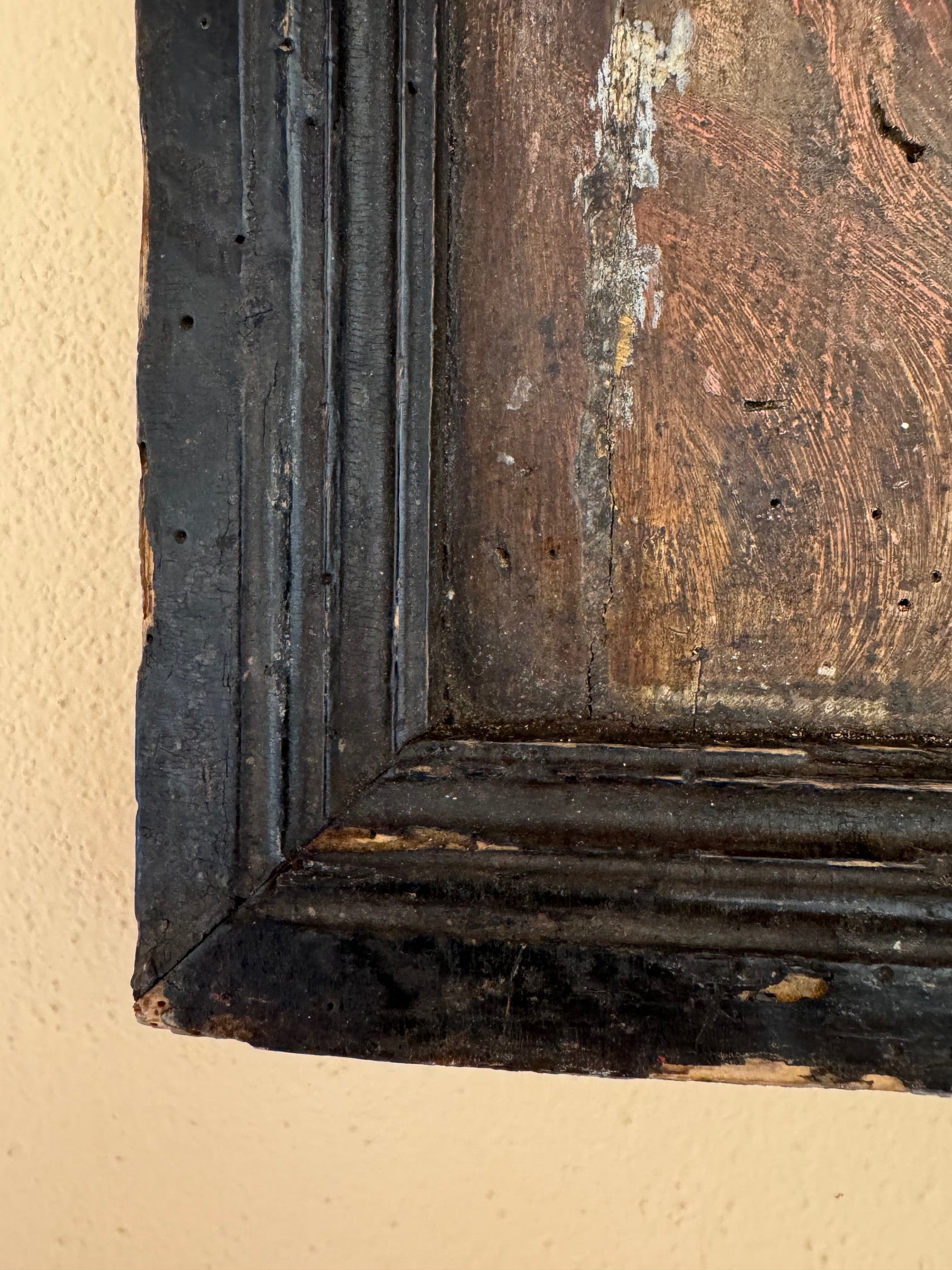 It is housed in what appears to be a 17th-century p[lain black frame but could be 16th-century.