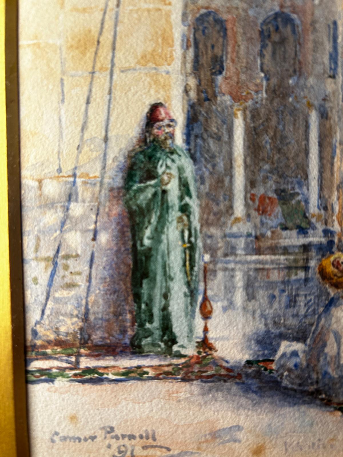 A high-quality watercolour depicting figures in a fez and turban, and what appears to be a woman sitting. We believe this is the Tooloon Mosque, Cairo.