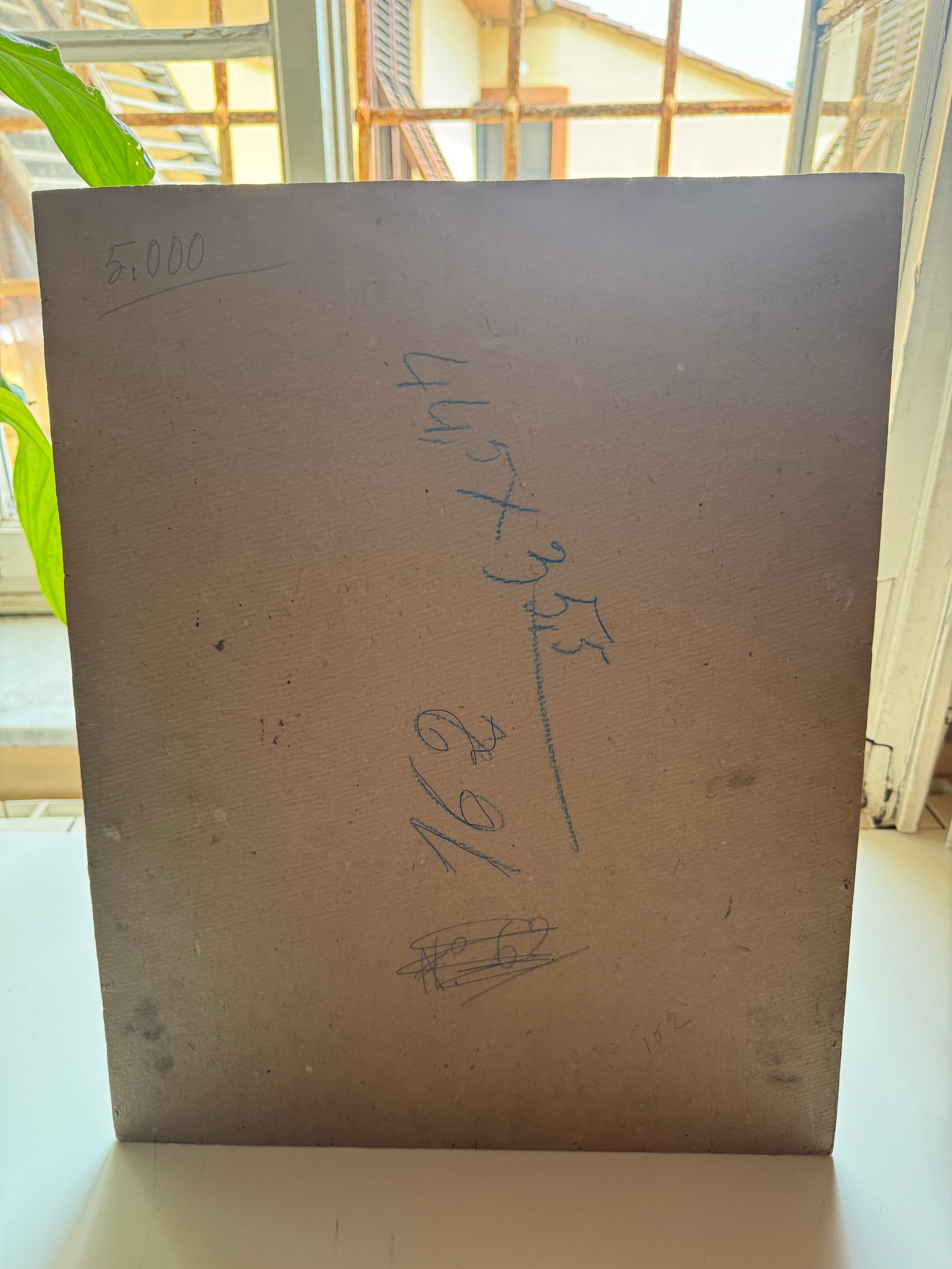 The condition is good. There are some pin marks to the left and right-hand sides where the artist pinned it for painting. It c