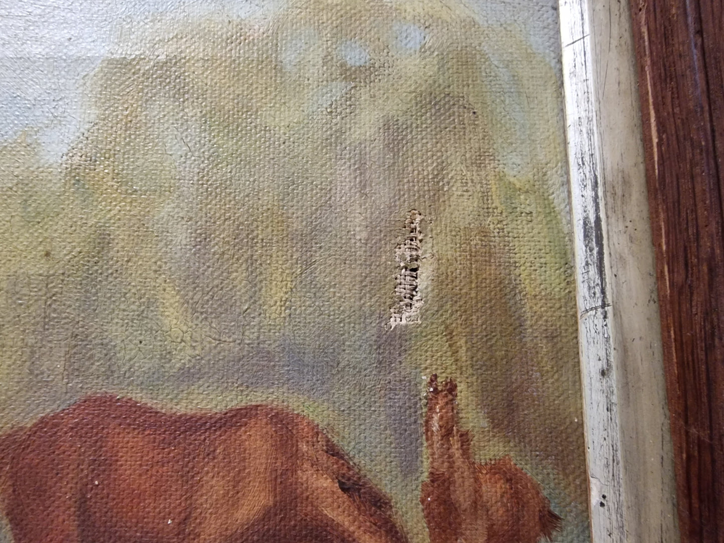 Olio su tela dell'inizio del XX secolo Cavalla e puledro al pascolo in un pascolo idilliaco con anatre