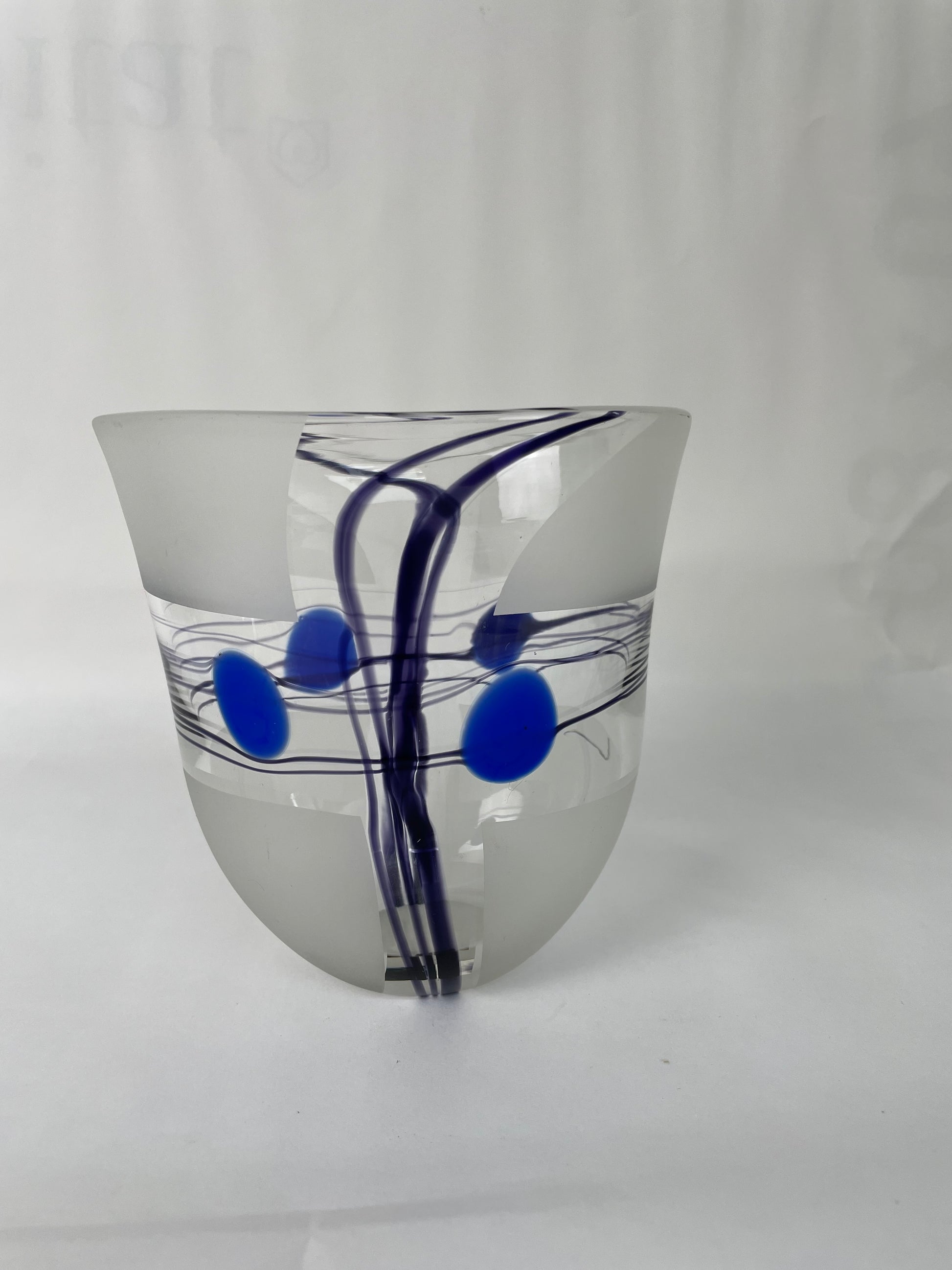 Vetro trasparente e satinato combinato con un motivo vorticoso blu e nero.