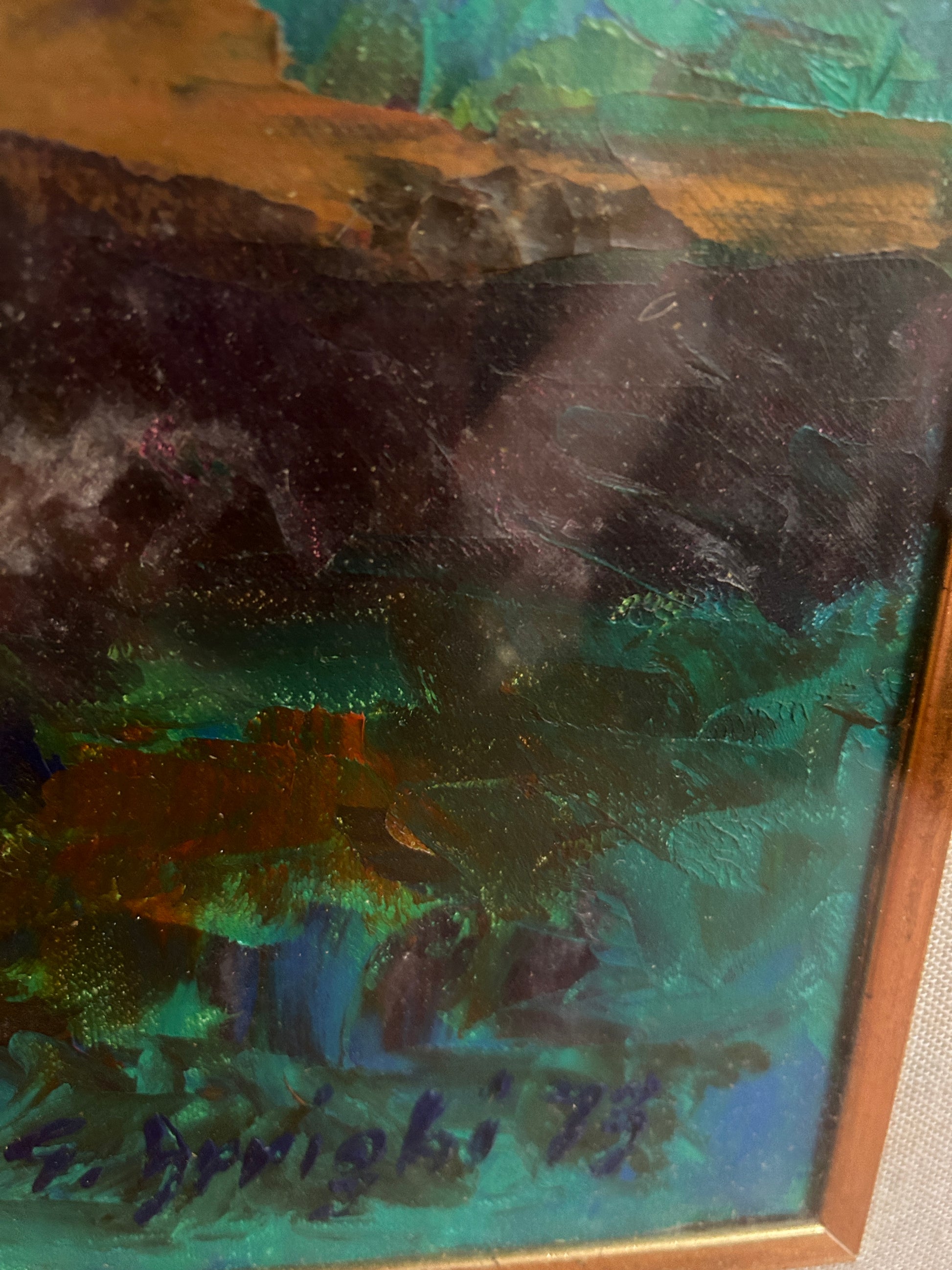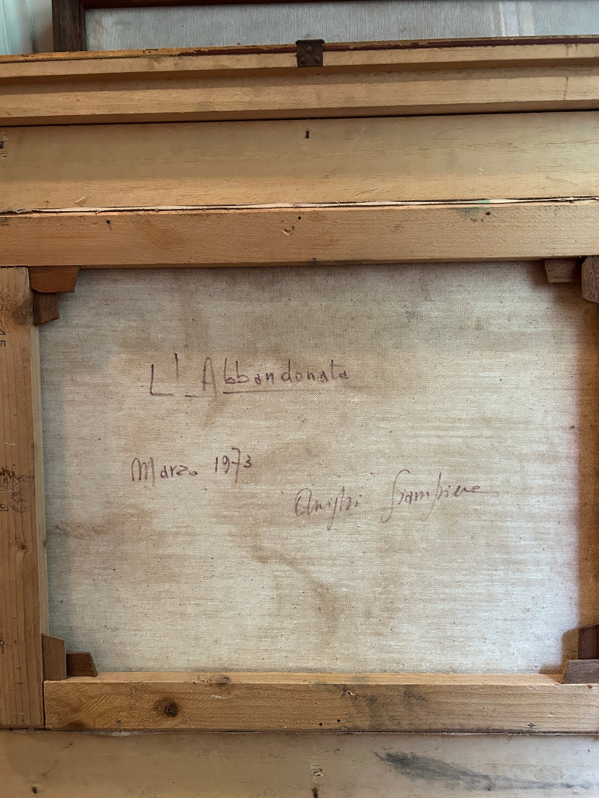 Olio su tela incorniciato e firmato in basso a destra e datato (marzo 1972) firmato e titolato al verso.
