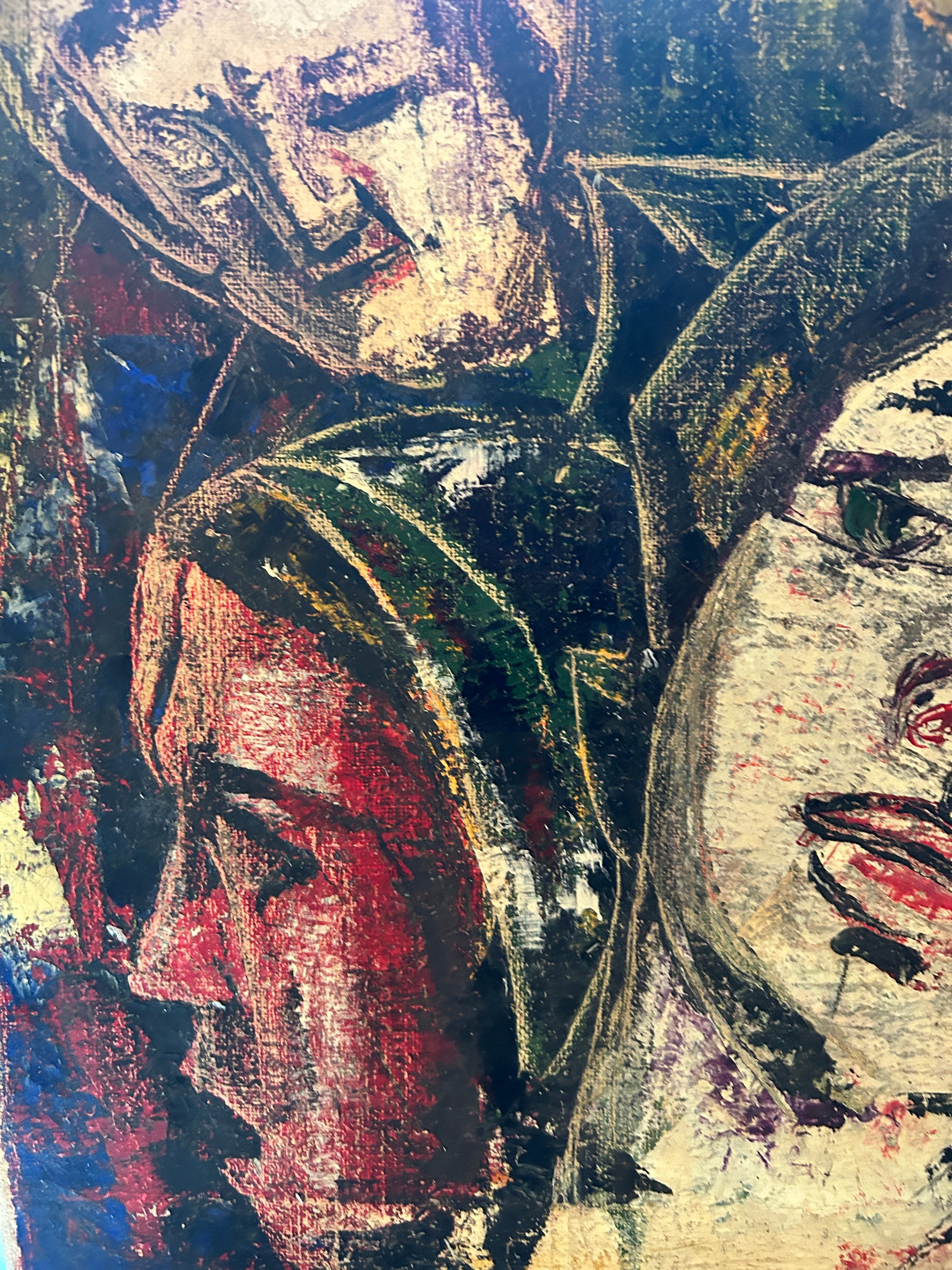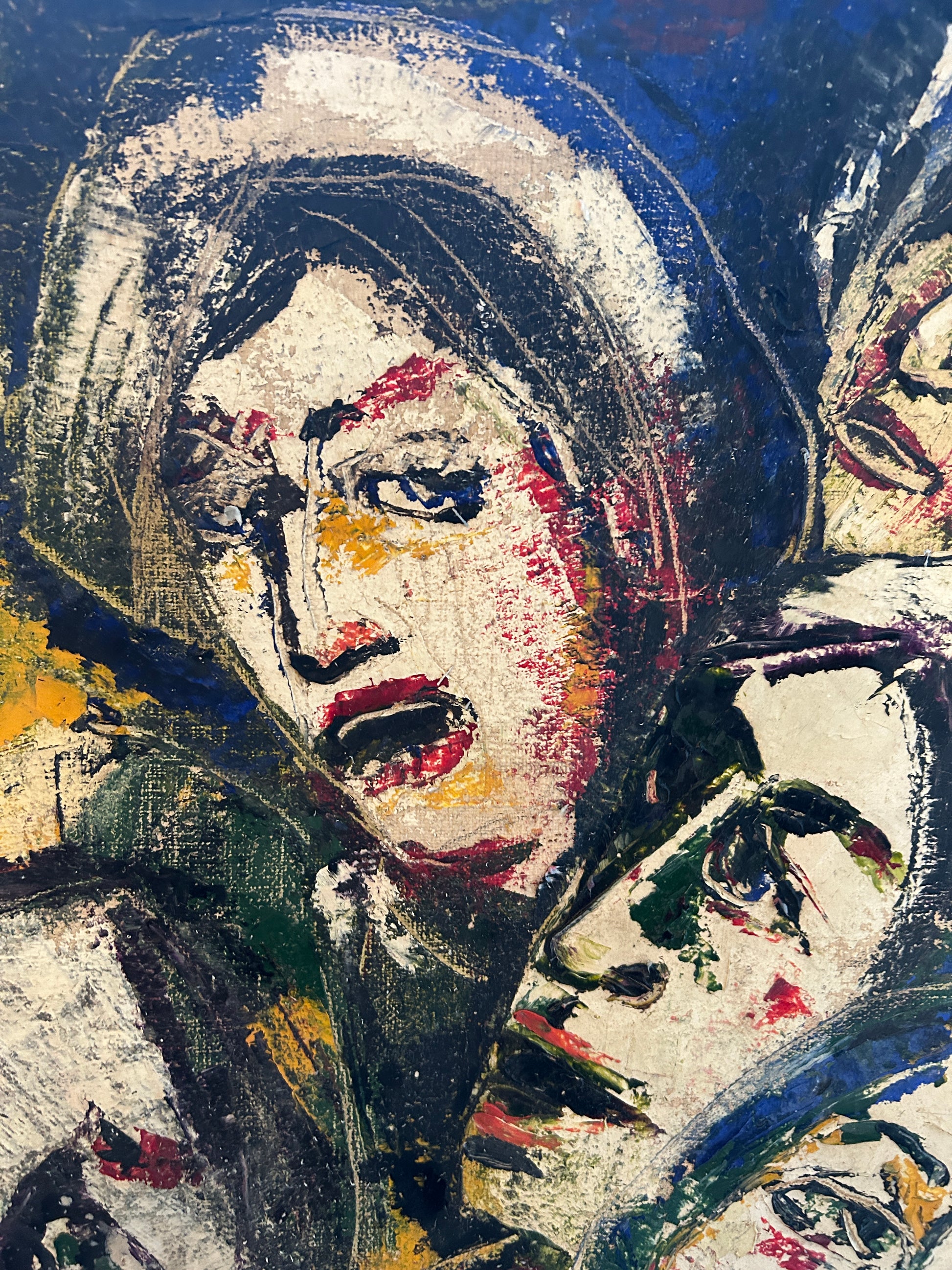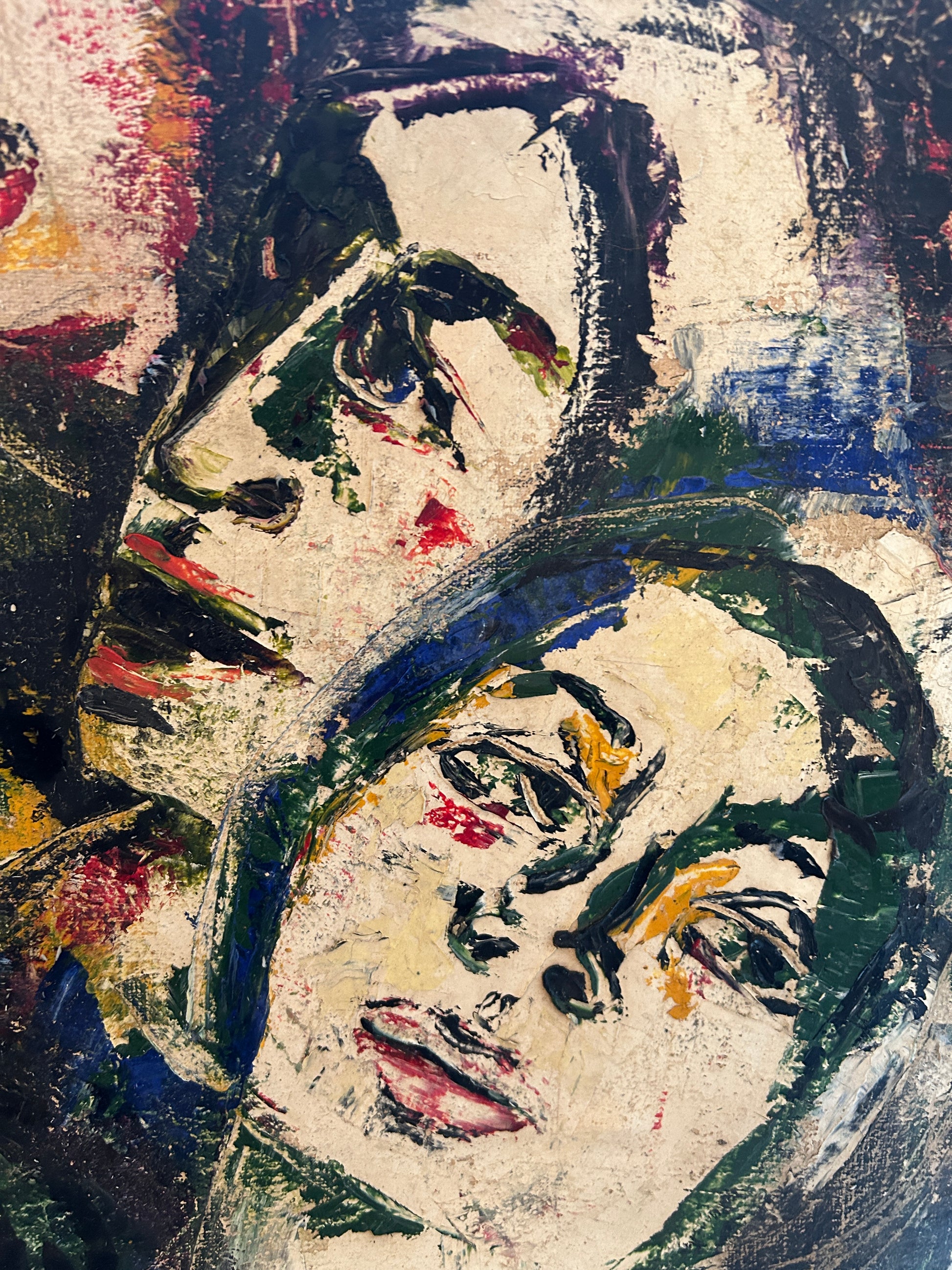 Un olio figurativo su tela coraggioso e audace degli anni '60. Firmato in basso a destra con firma indistinguibile datata 1965