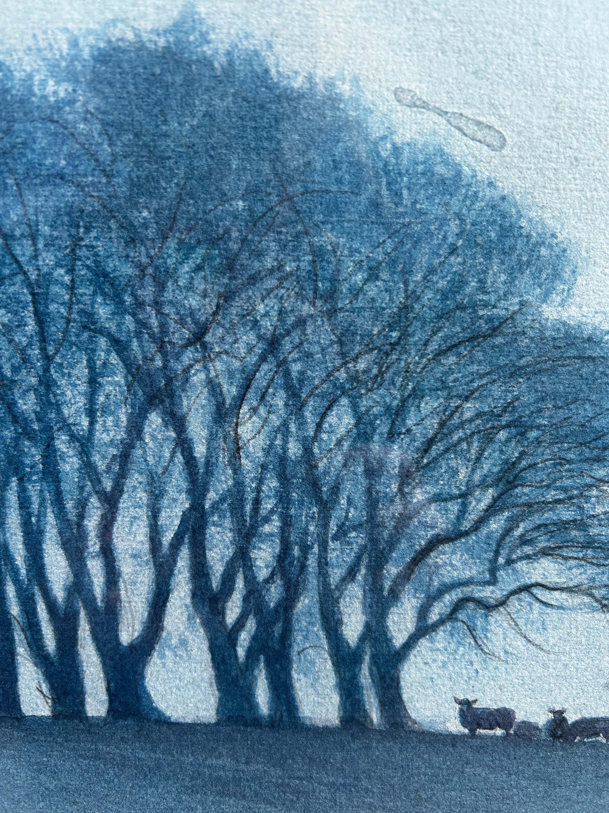 Unusual monochrome watercolour signed by the artist depicting a herd of sheep on a woodland hill with a full moon.