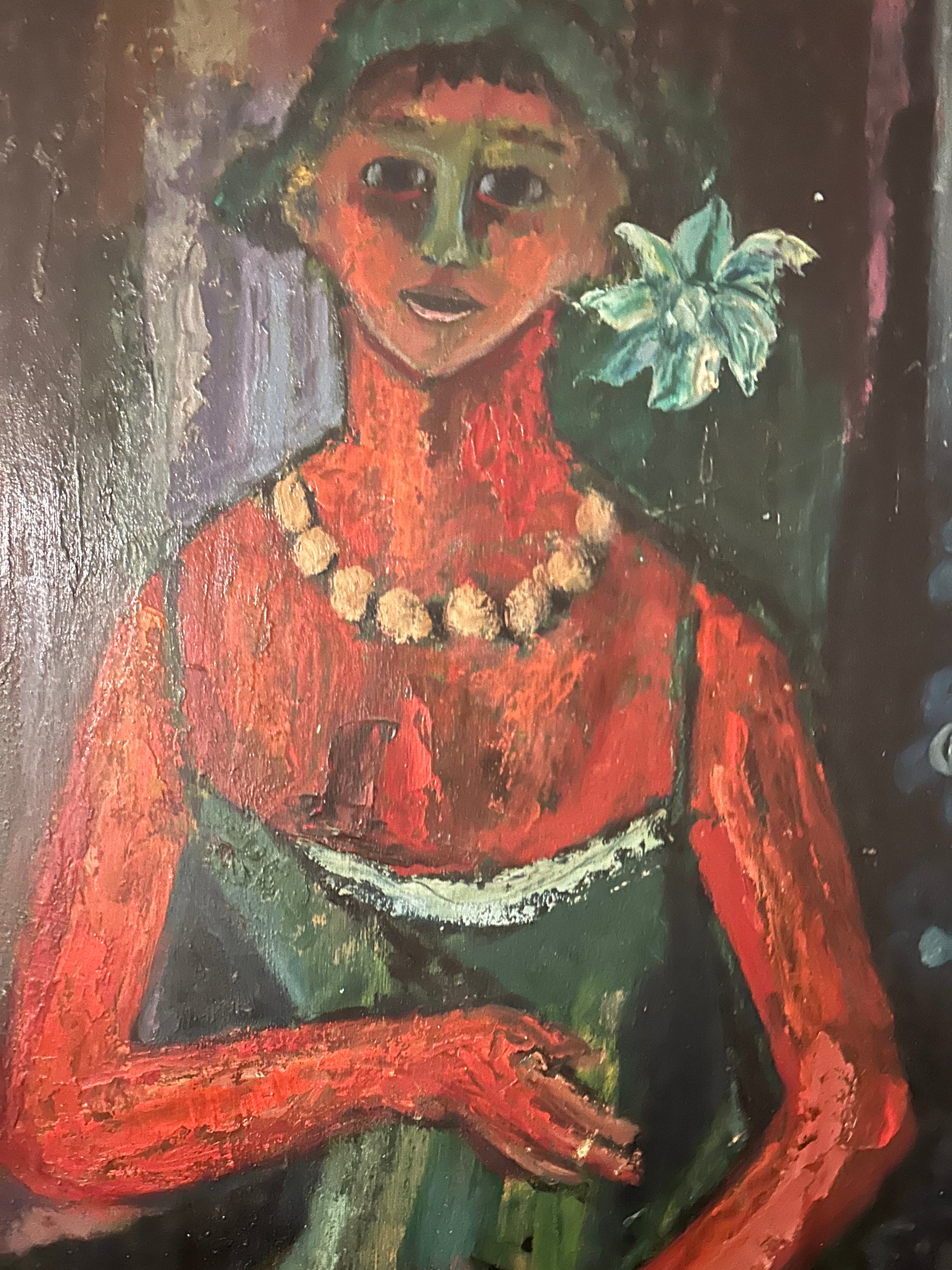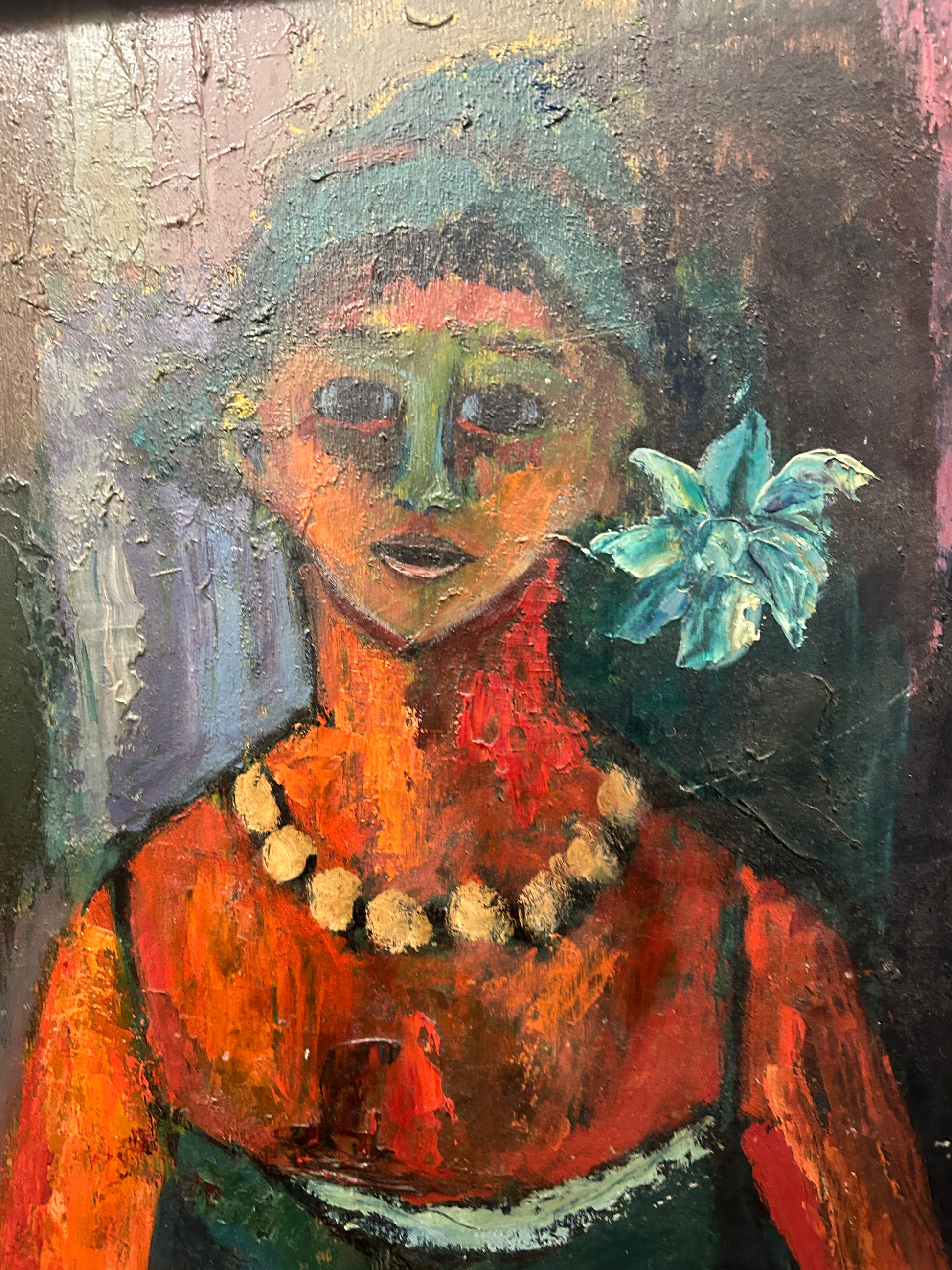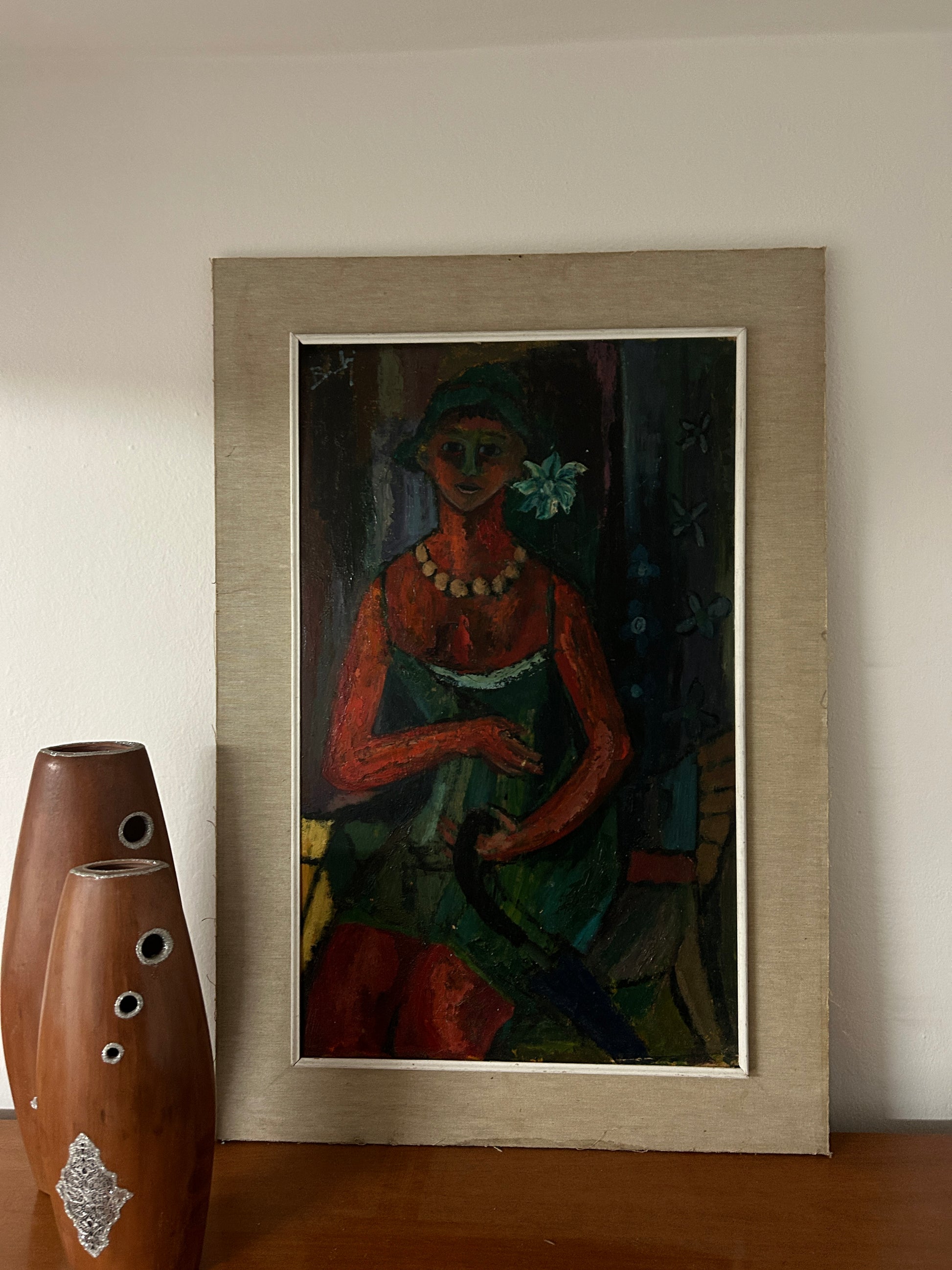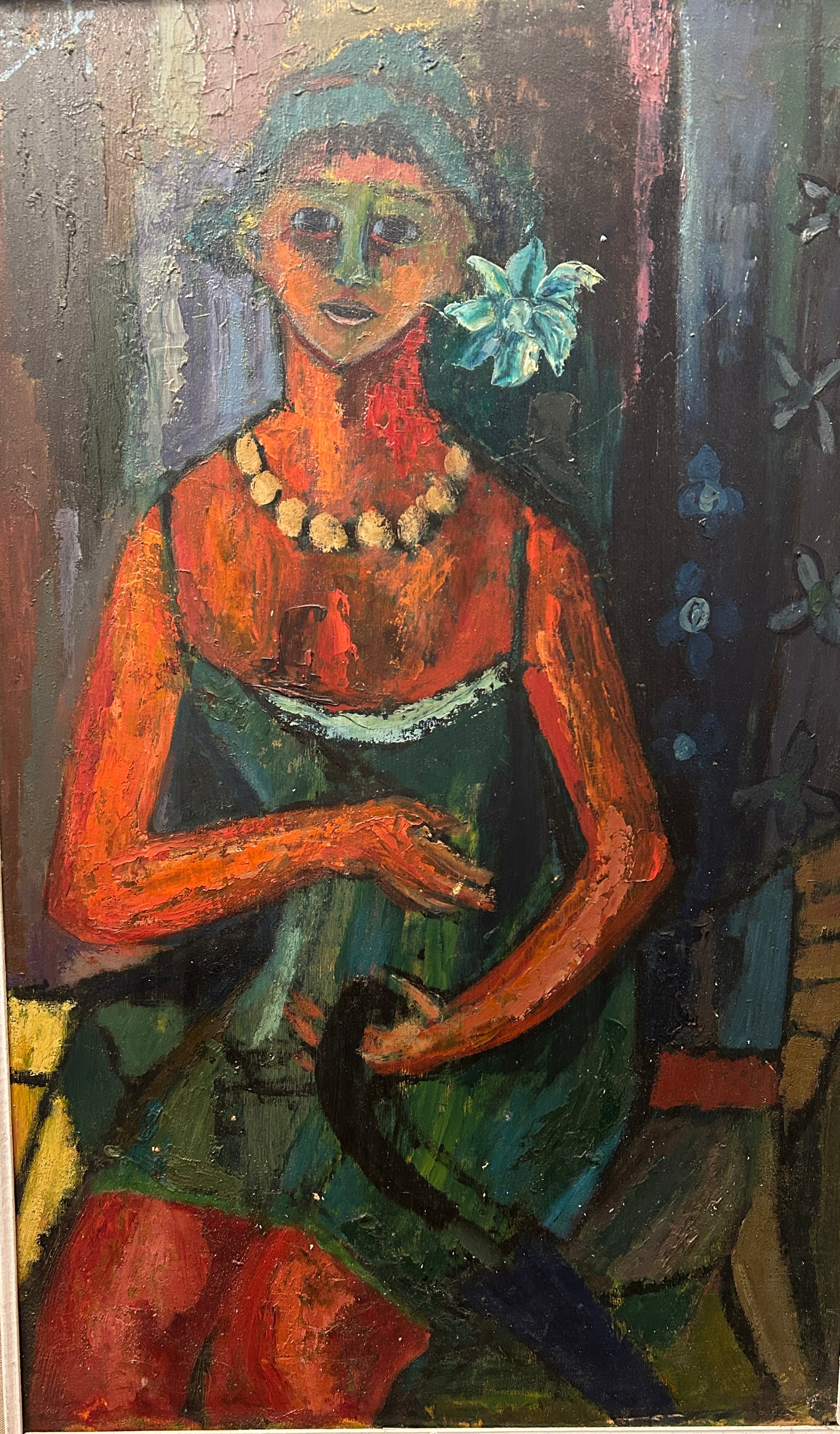 "La ragazza del circo" Ritratto femminile seduto a olio su tavola della metà del secolo