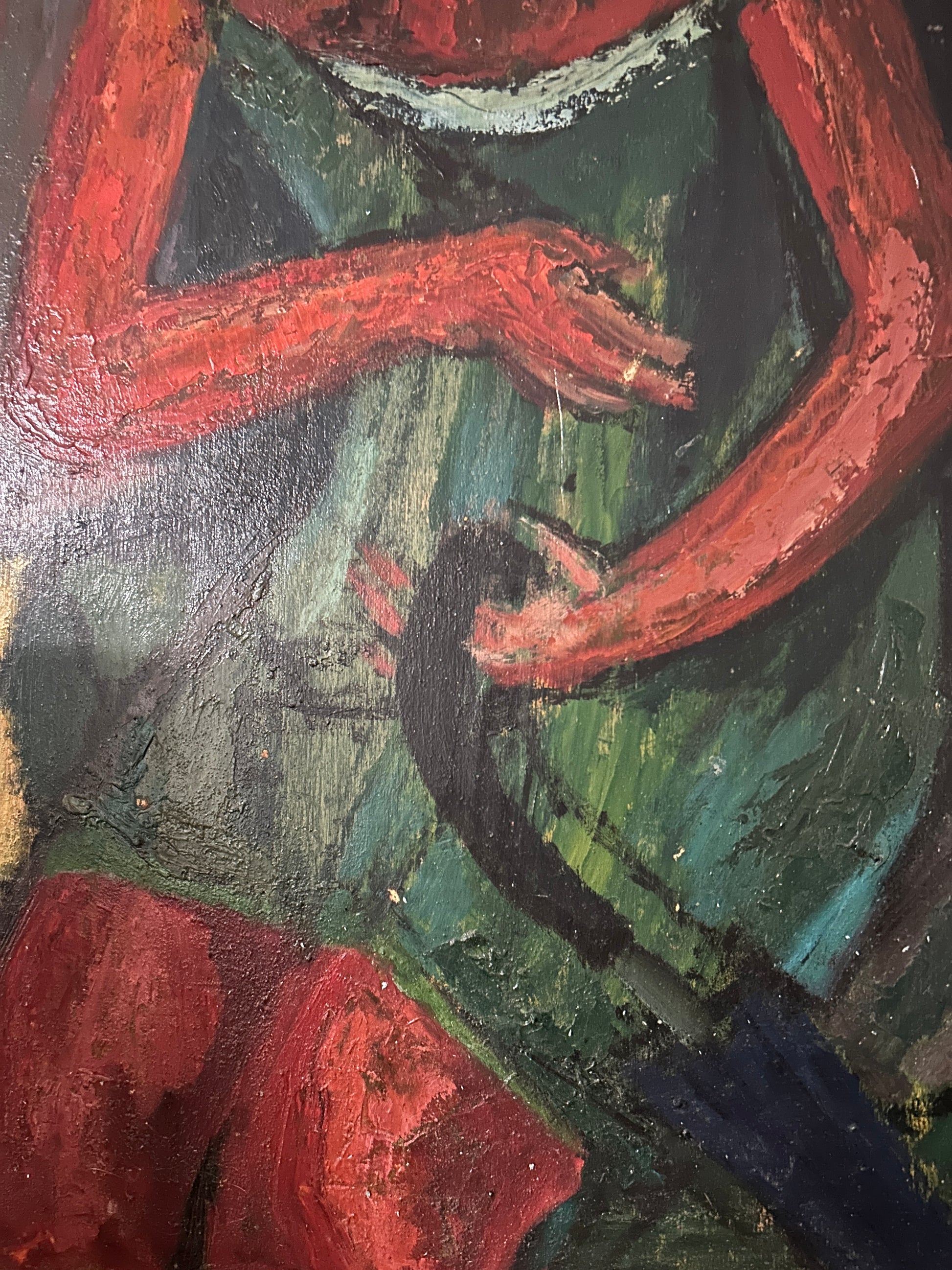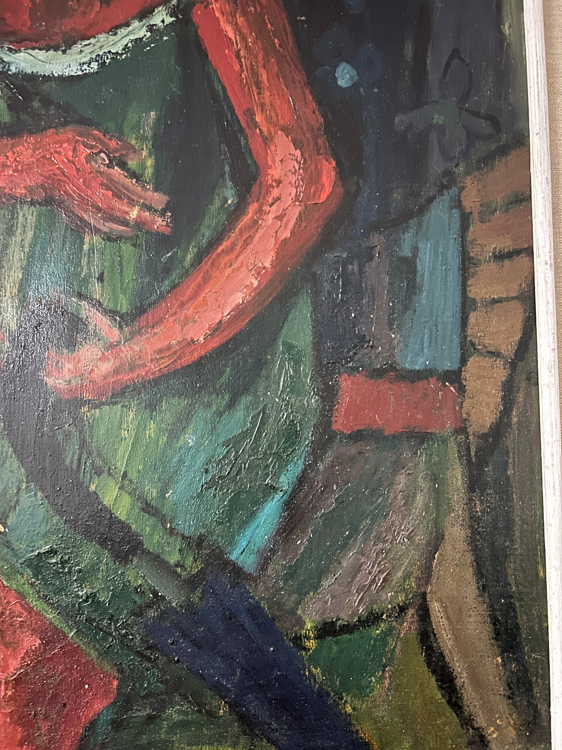 “La Ragazza del Circo”, sublime ritratto femminile seduto astratto olio su tavola della metà del secolo.