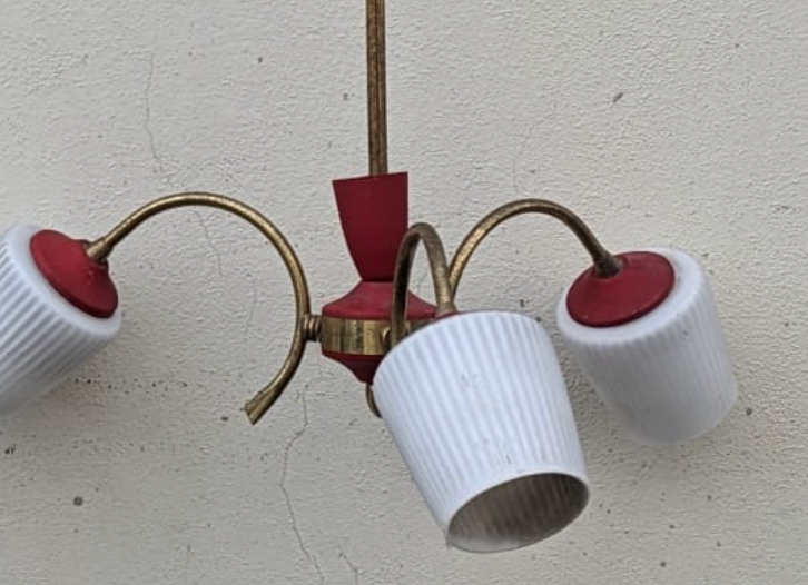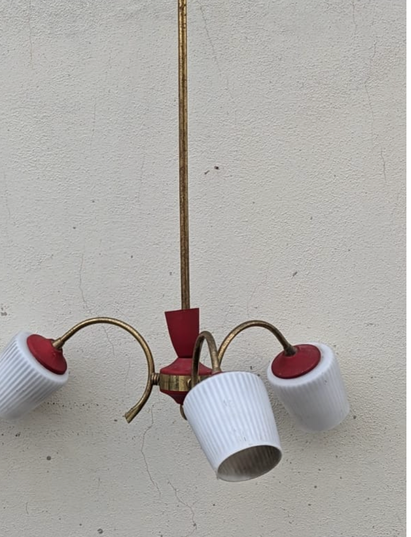 1950s Italian Chandelier Brass with Opaline Shades and red details.