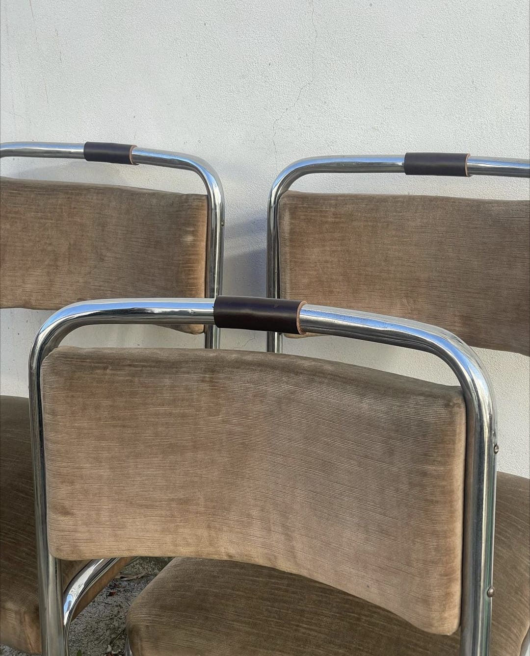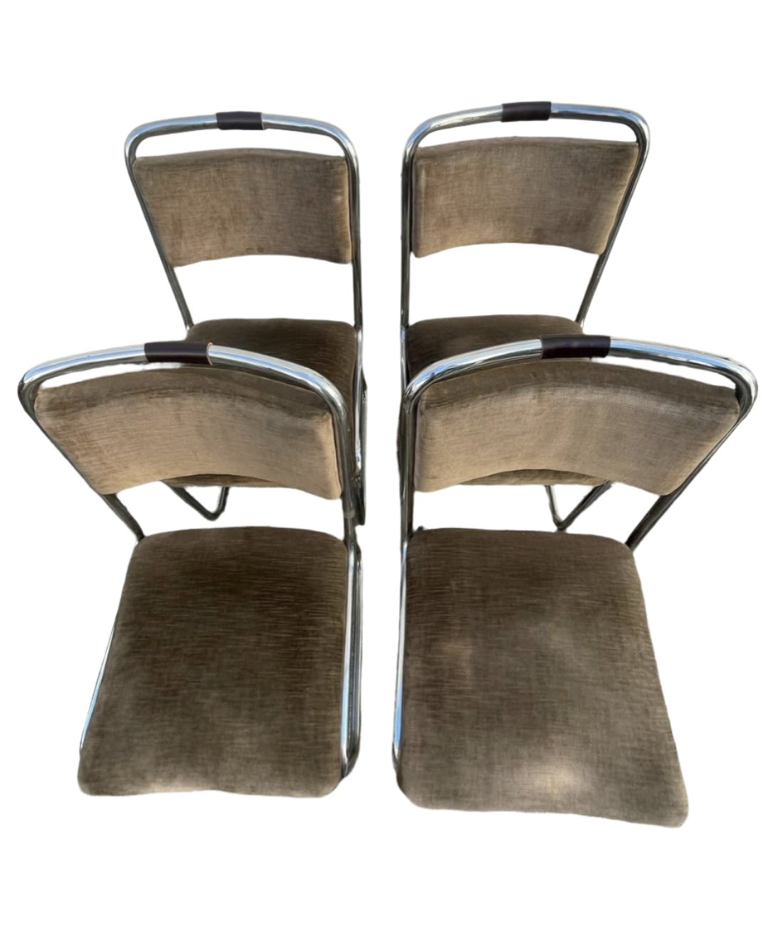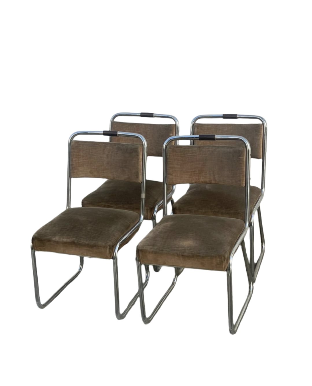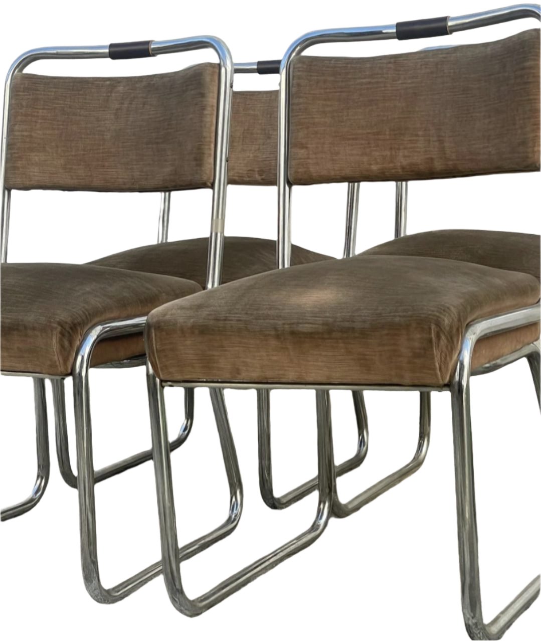 A set of four 1980's chrome and velour dining chairs in mole skin brown.