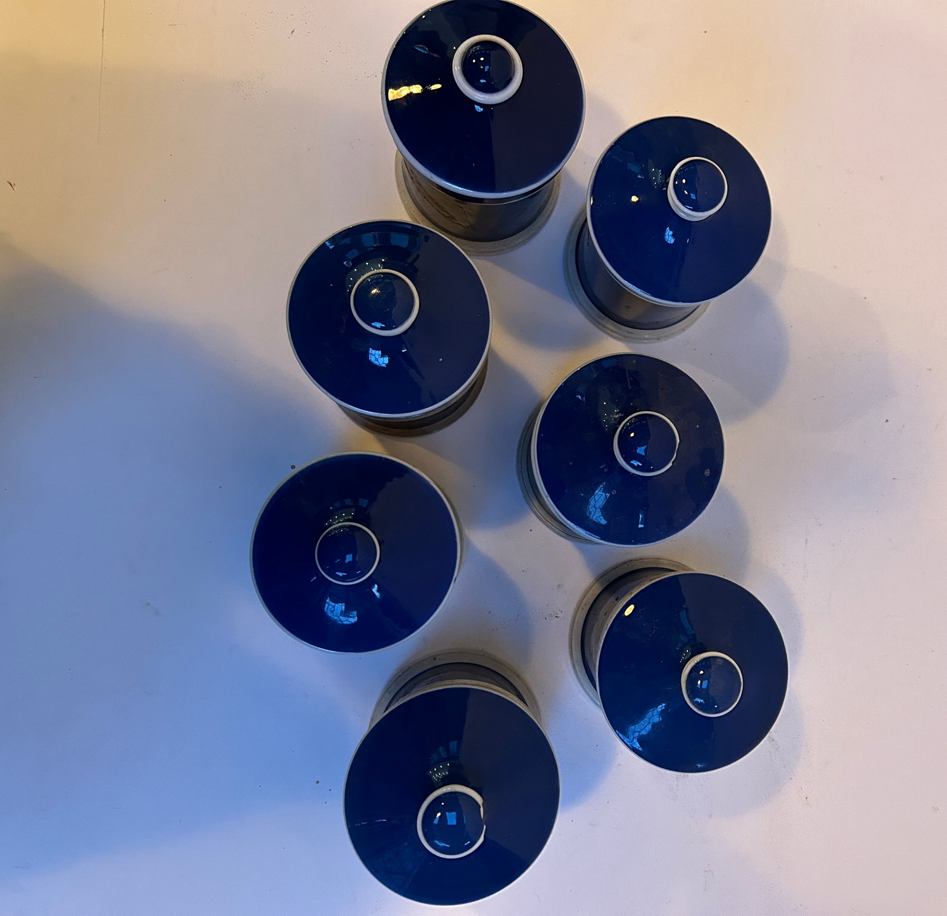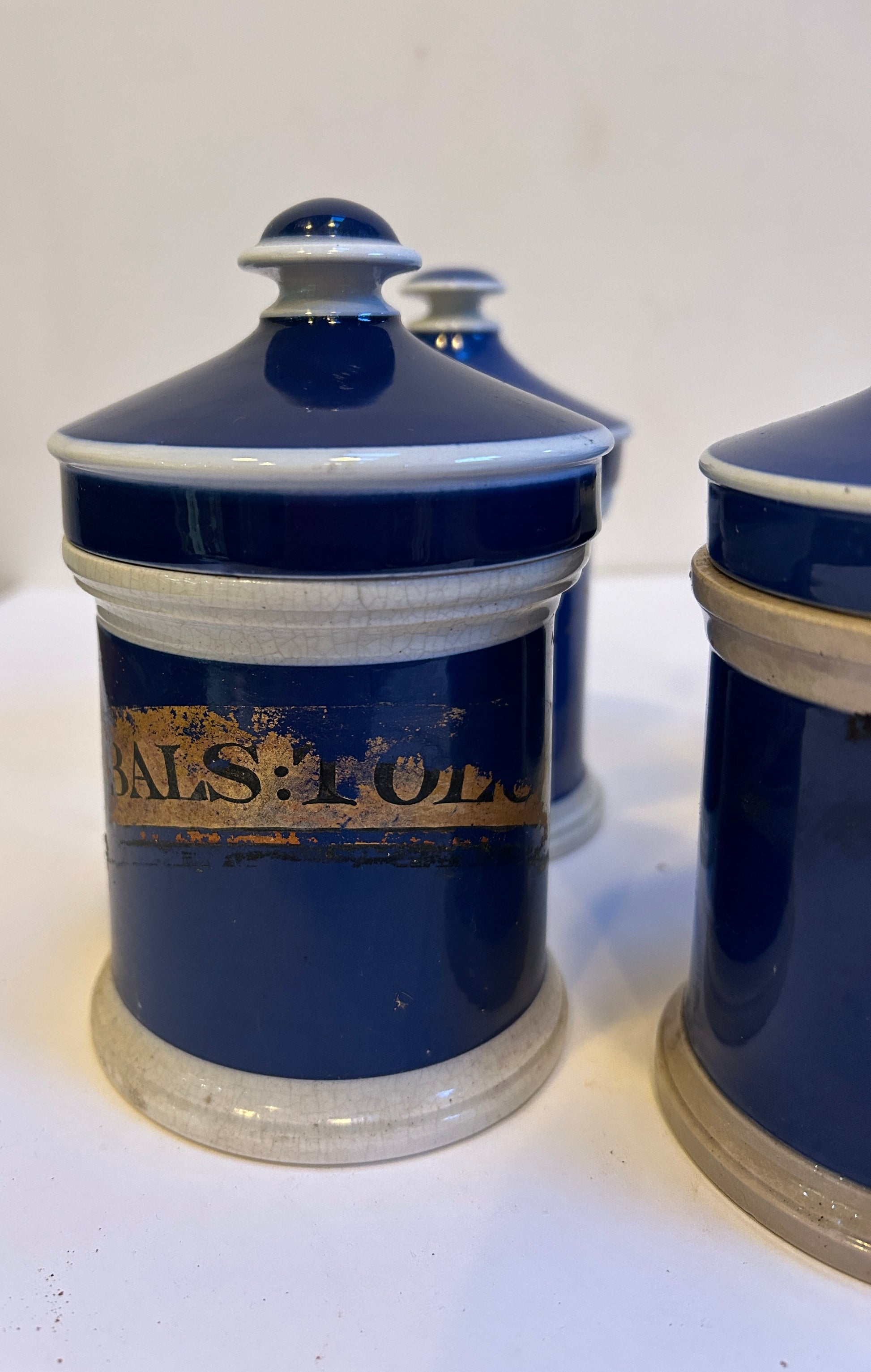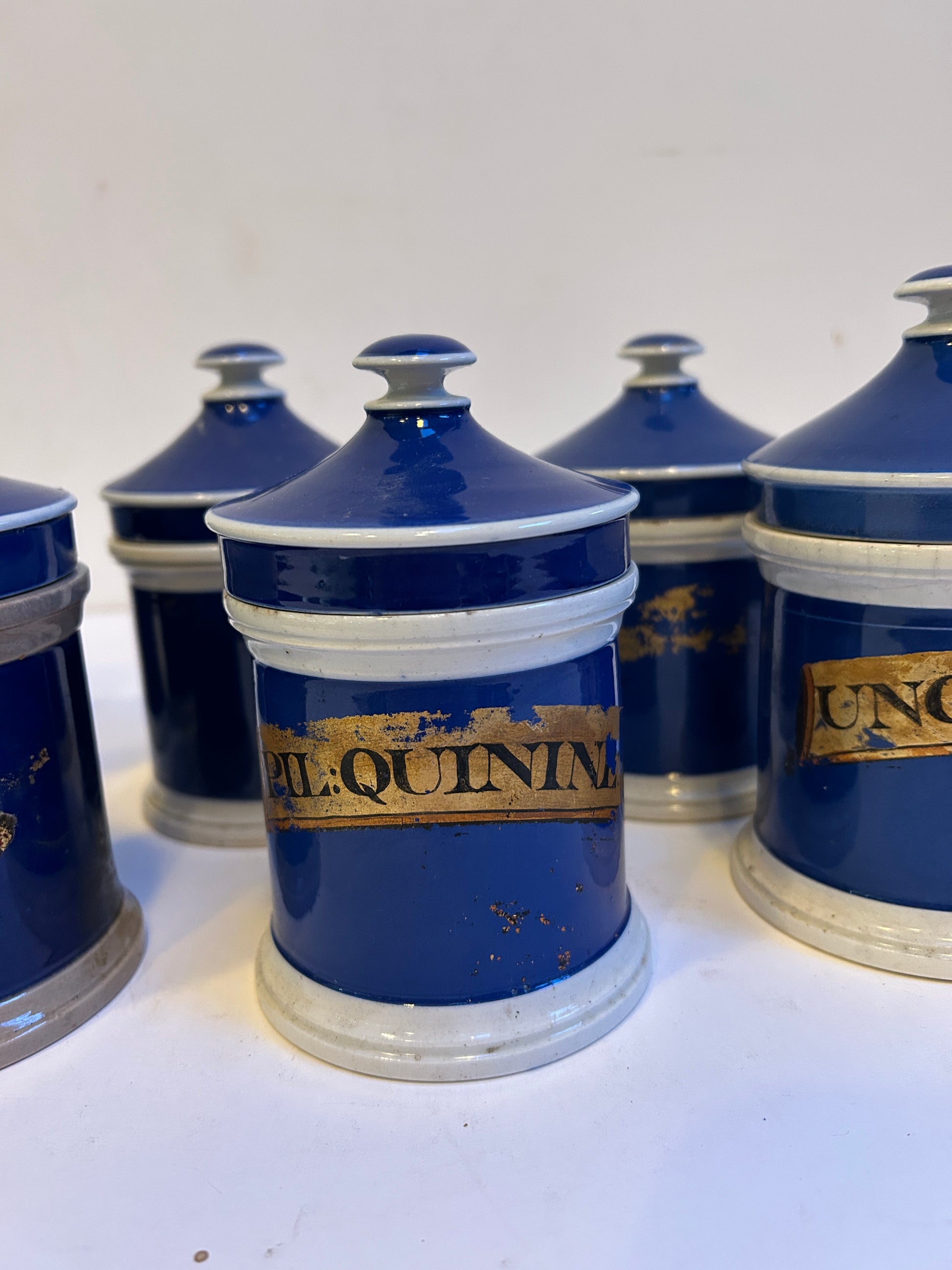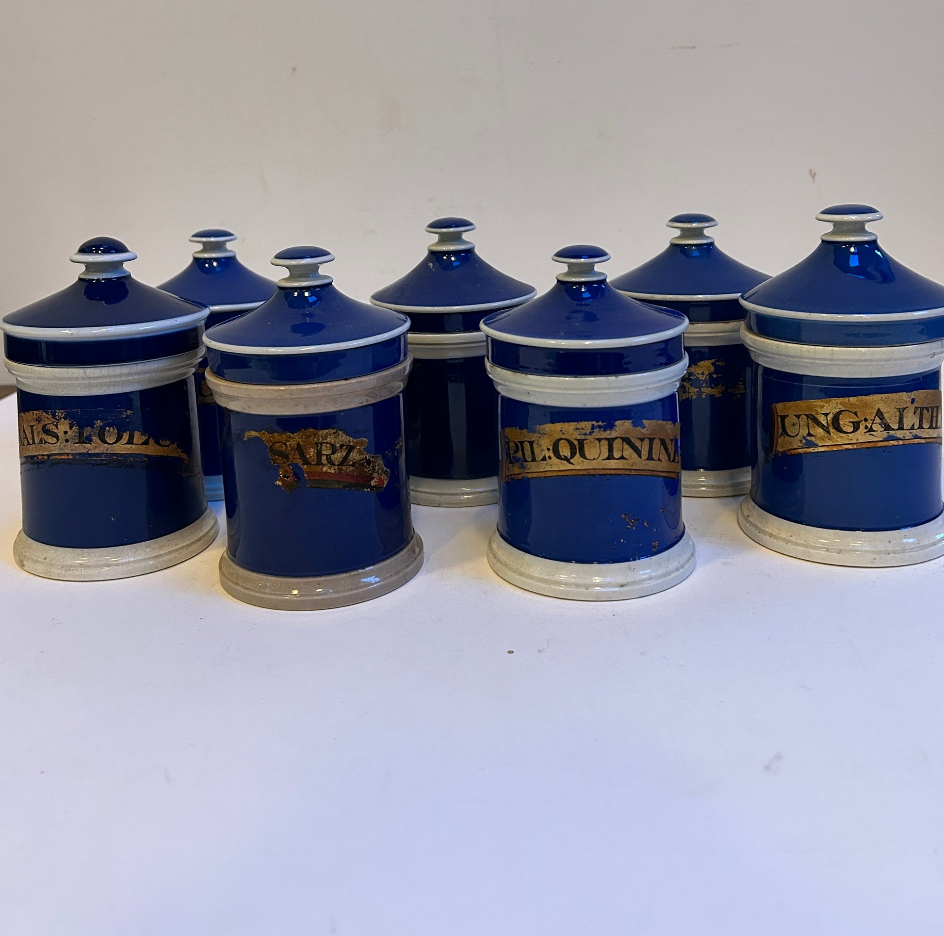 A set of 7 blue apothecary jars with gilt lettering depicting latin names of the contents.