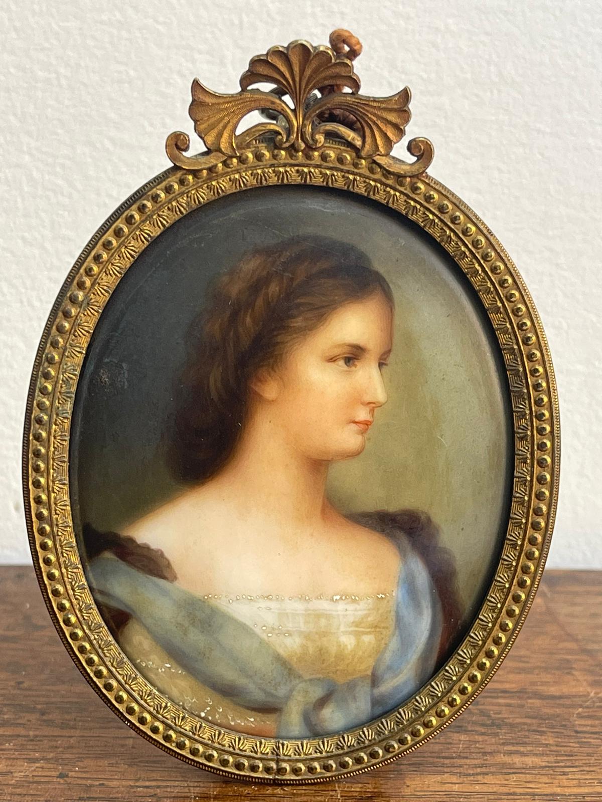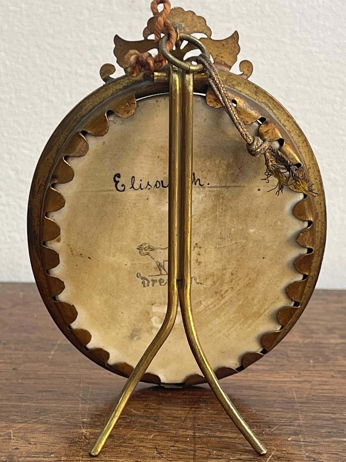 19th century Dresden Framed Porcelain Miniature Plaque "Elizabeth" Table Top Easel