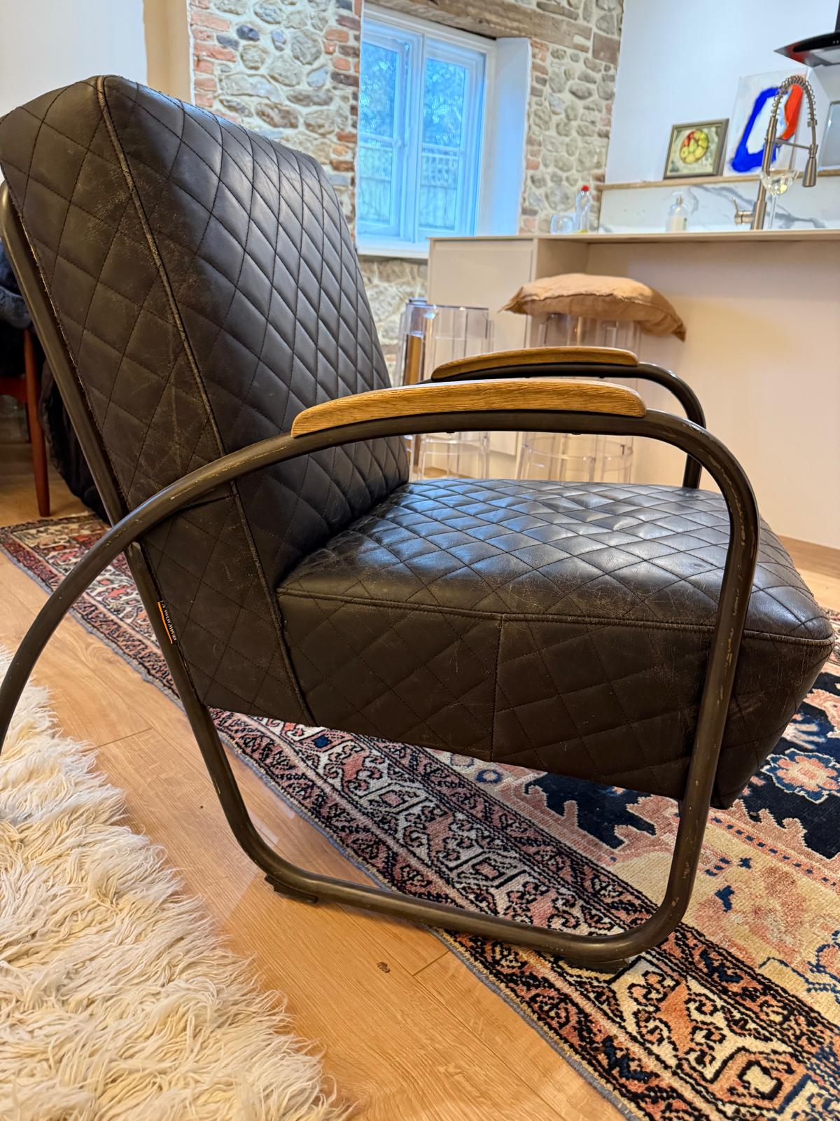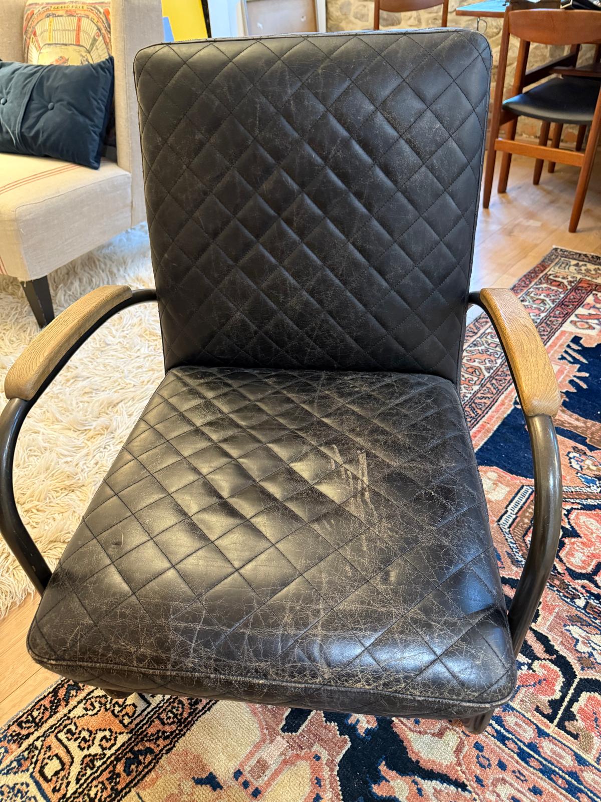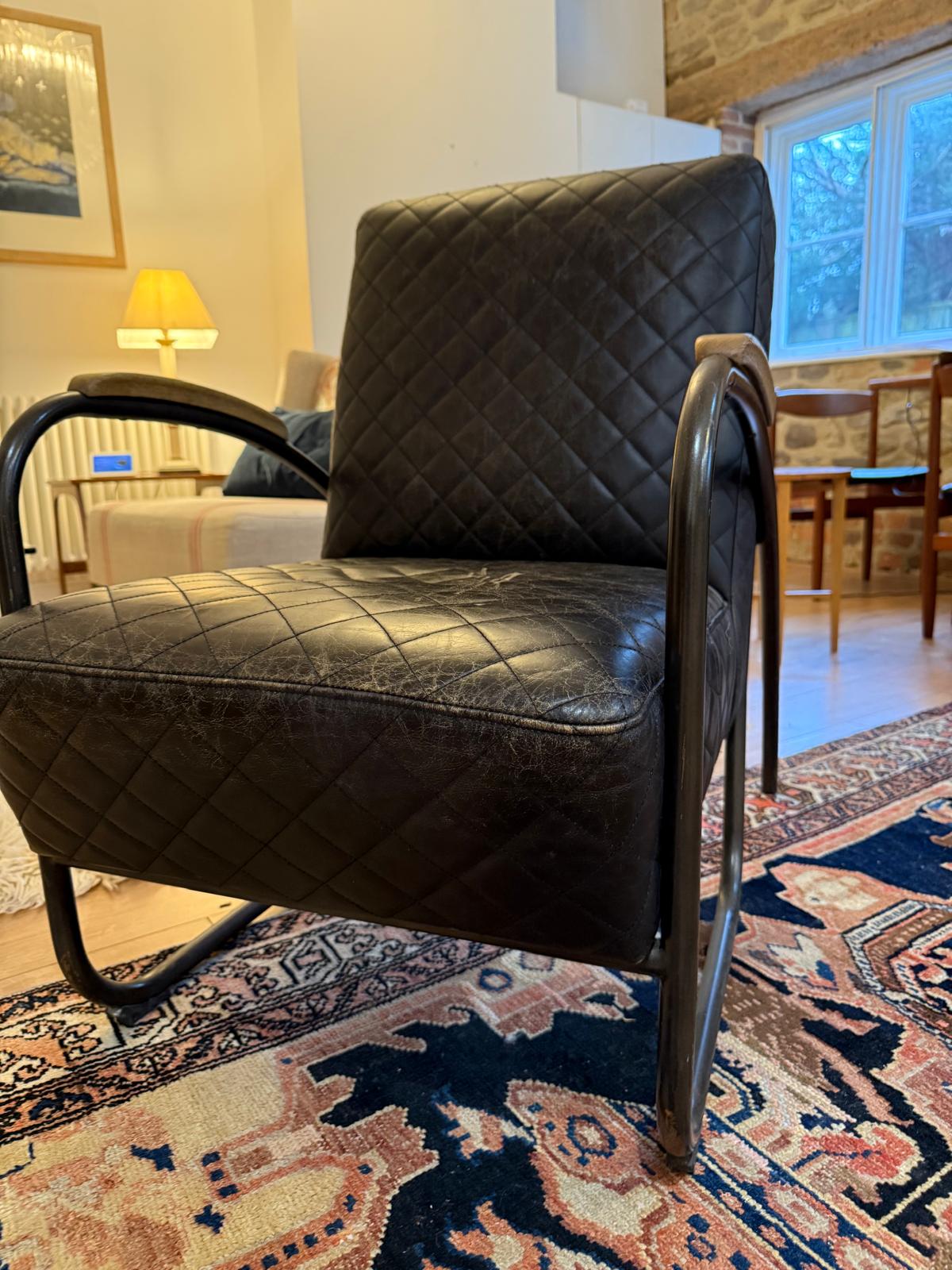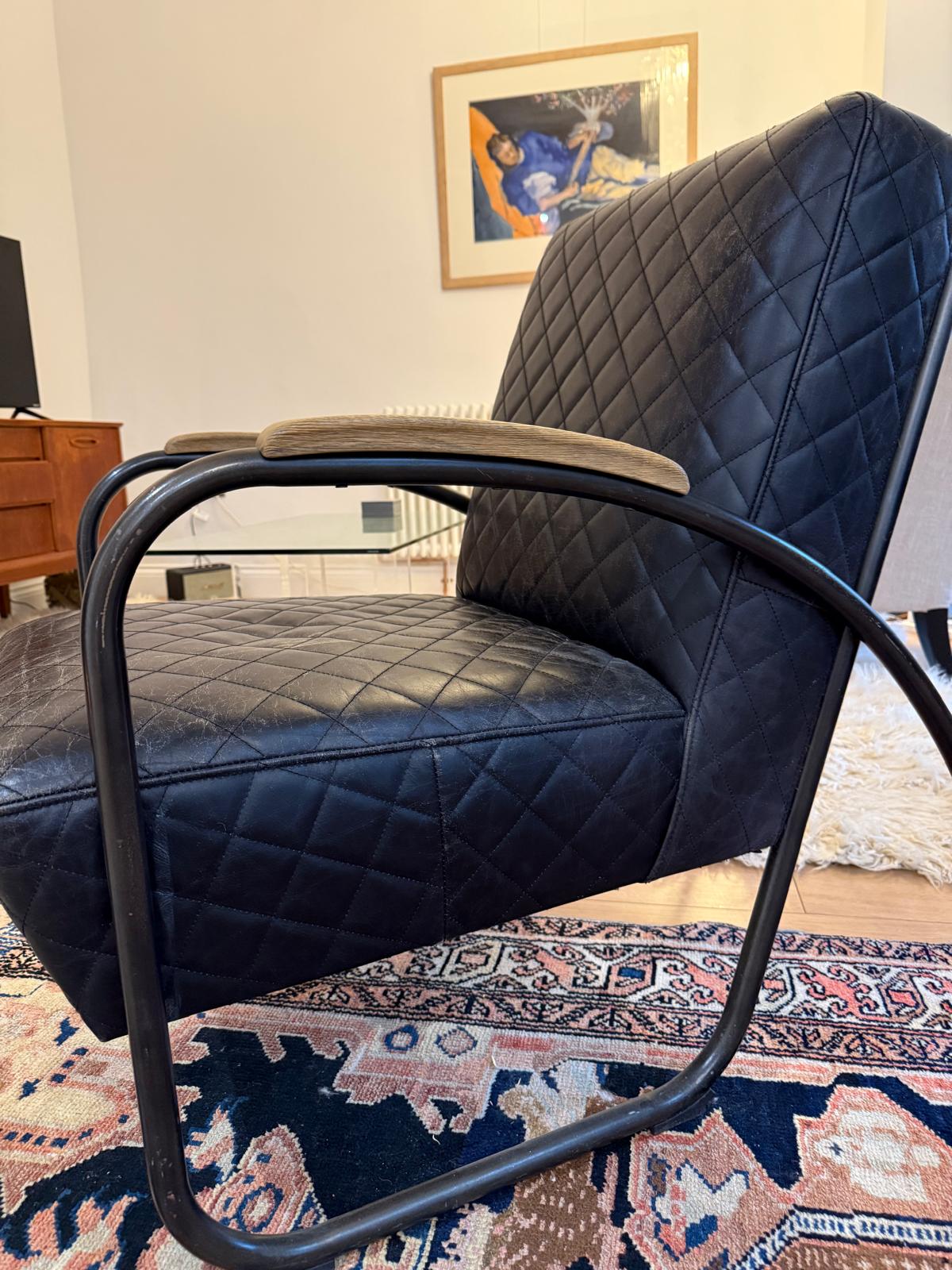 Andrew Martin Black Leather Quilted Bent Metal Arm Chair