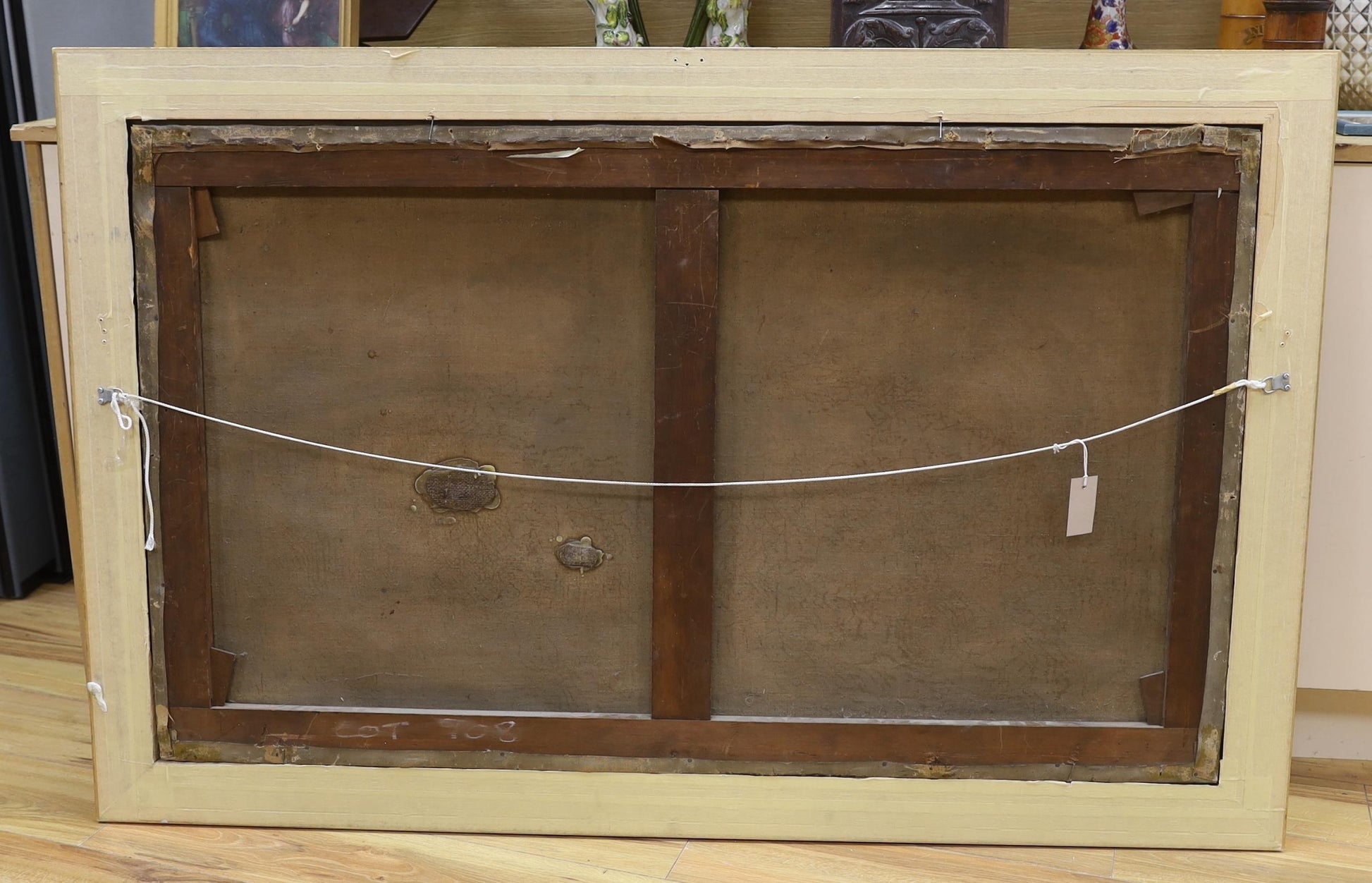 The painting is in good condition aside from two small repairs that can be seen from the rear and is framed in a later simple black and gilt frame..