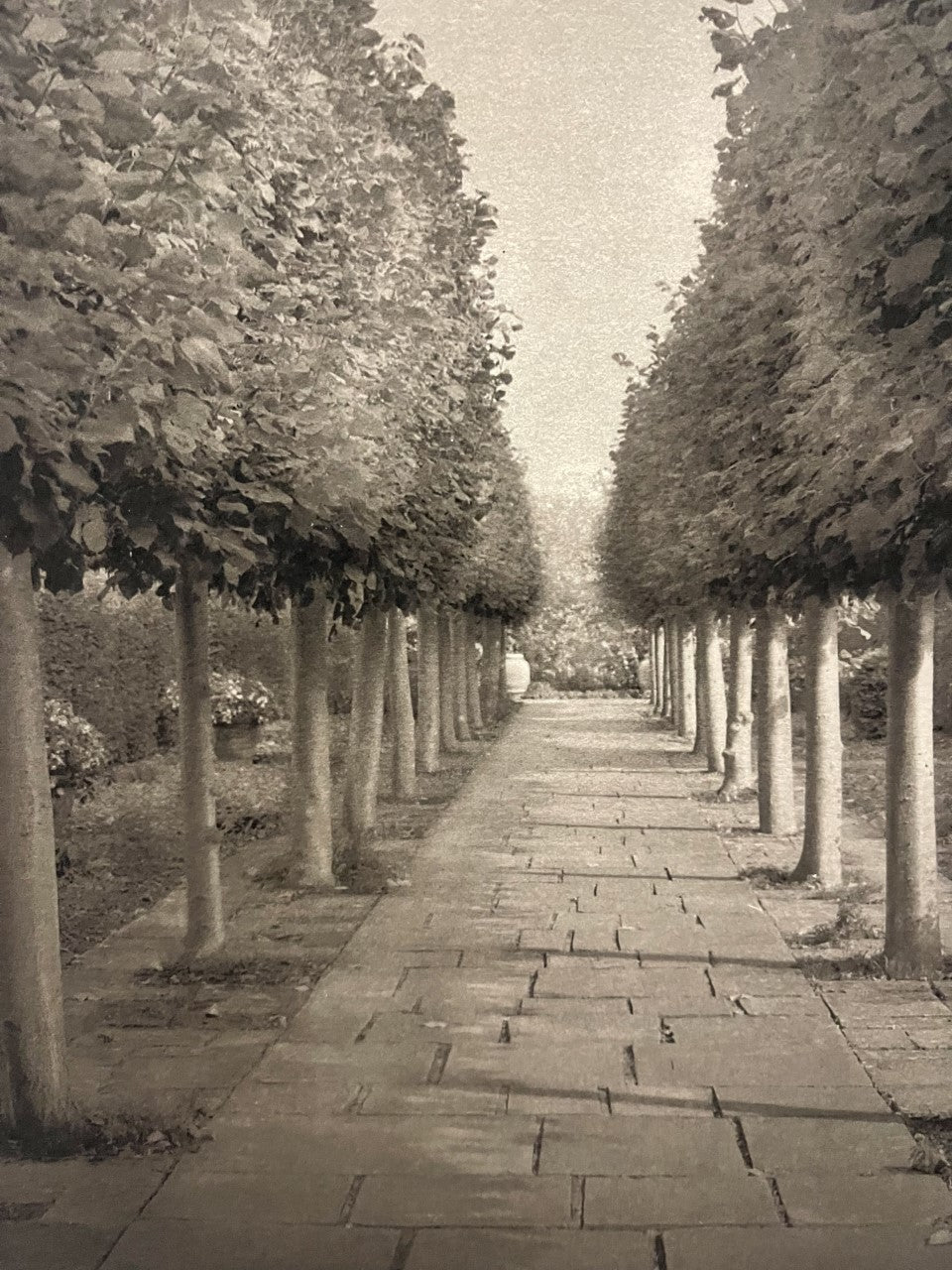 In the series "In the Garden", Dow portrays the highly cultivated landscapes of European formal gardens. Dow has a particular interest in the dynamics of light and shadow, and shape and mass, but she considers photography a means to create her own path through the gardens, rather than simply a tool to depict them. She writes, “by positioning the lens, cropping my prints, and using burning and dodging to guide the viewer’s eye through a picture, I feel that I too am a gardener in a sense.”