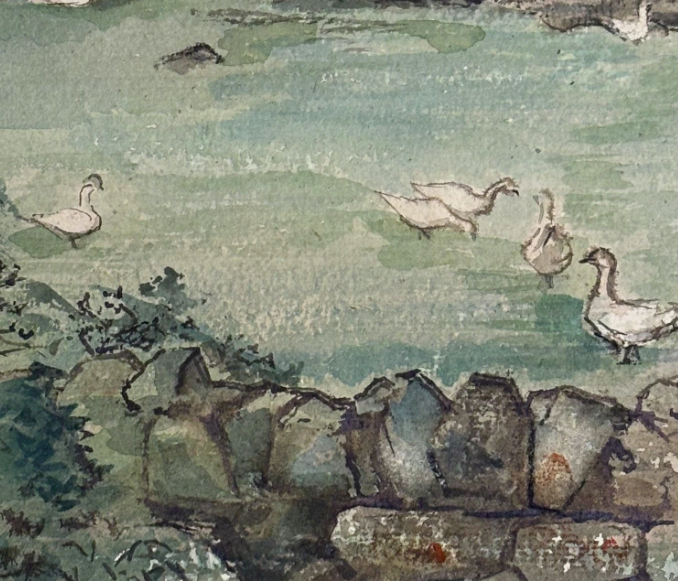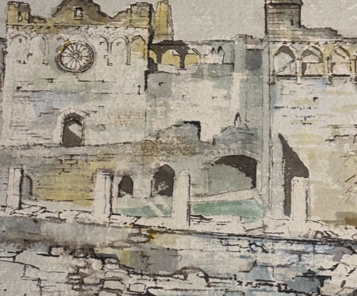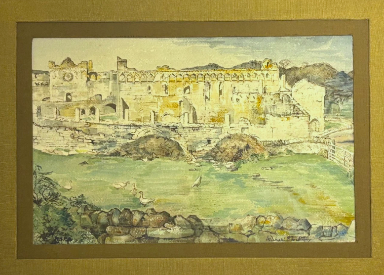 Selling here is an original watercolour by Michael Brockway: a castle ruins lit by sun. It is a pretty piece that would work nicely in any living room.