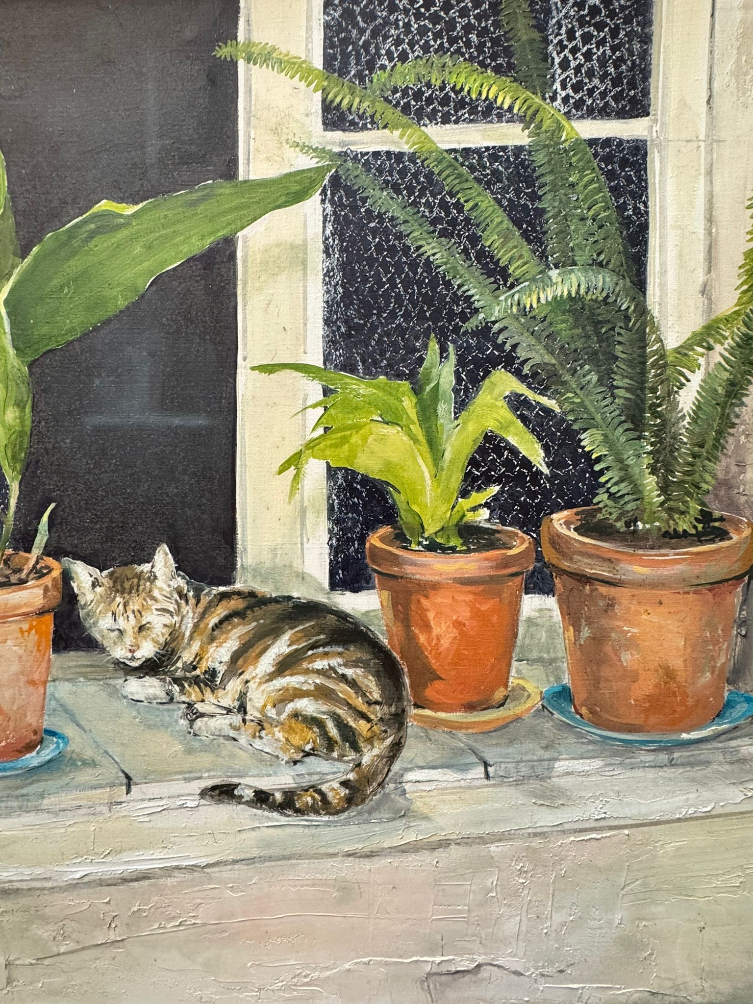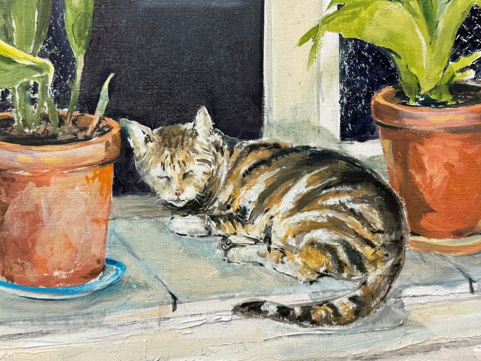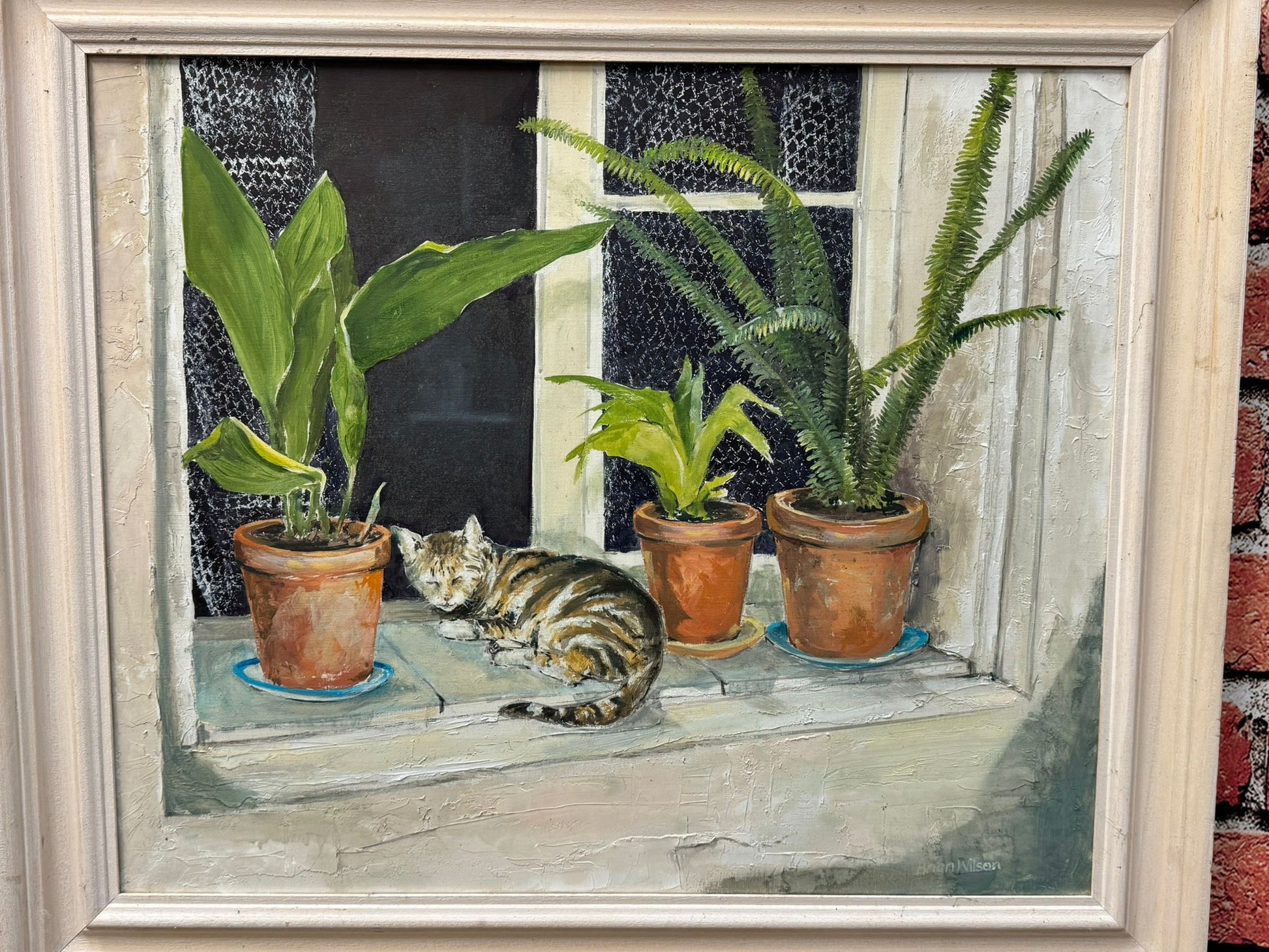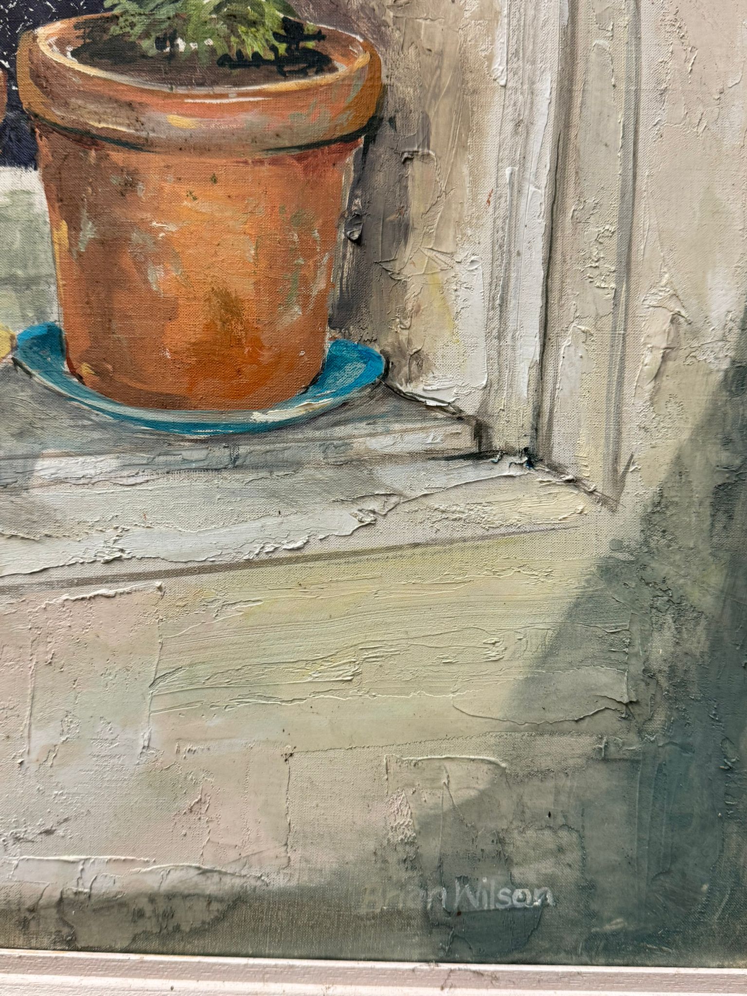 A charming oil on canvas depicting a cat sleeping amongst terra cotta pots by the well listed 20th Century artist Brain Wilson signed lower right.
