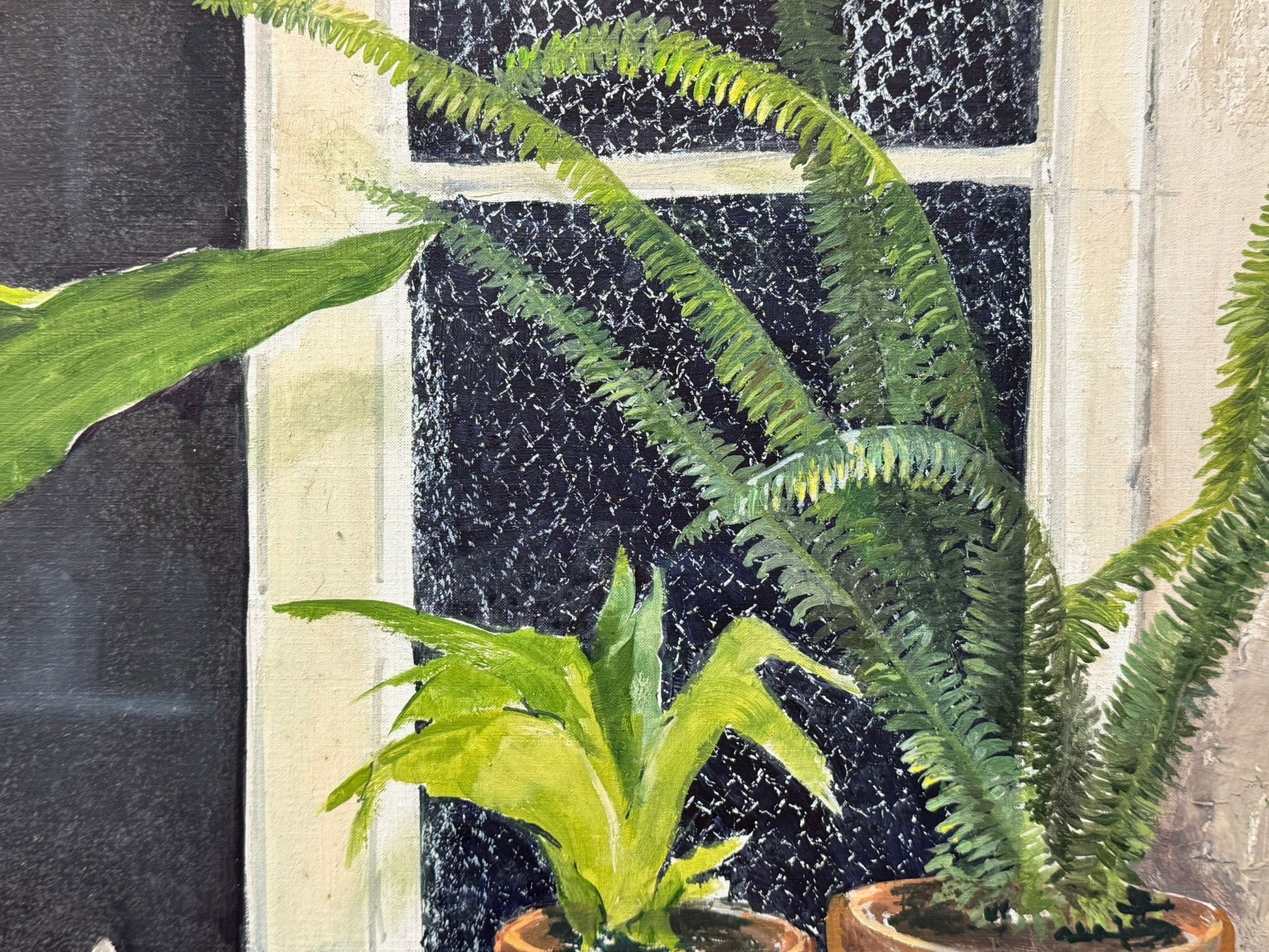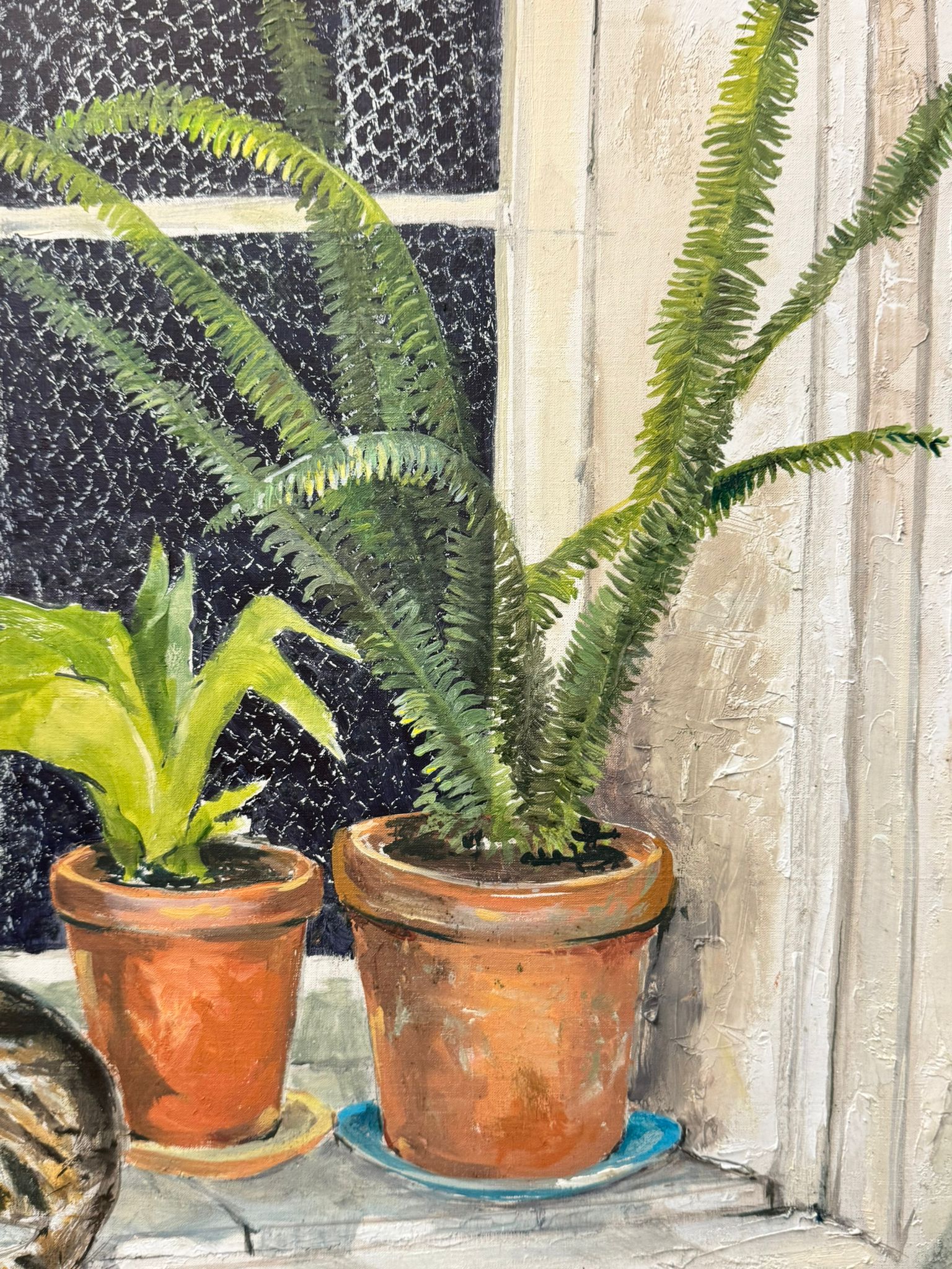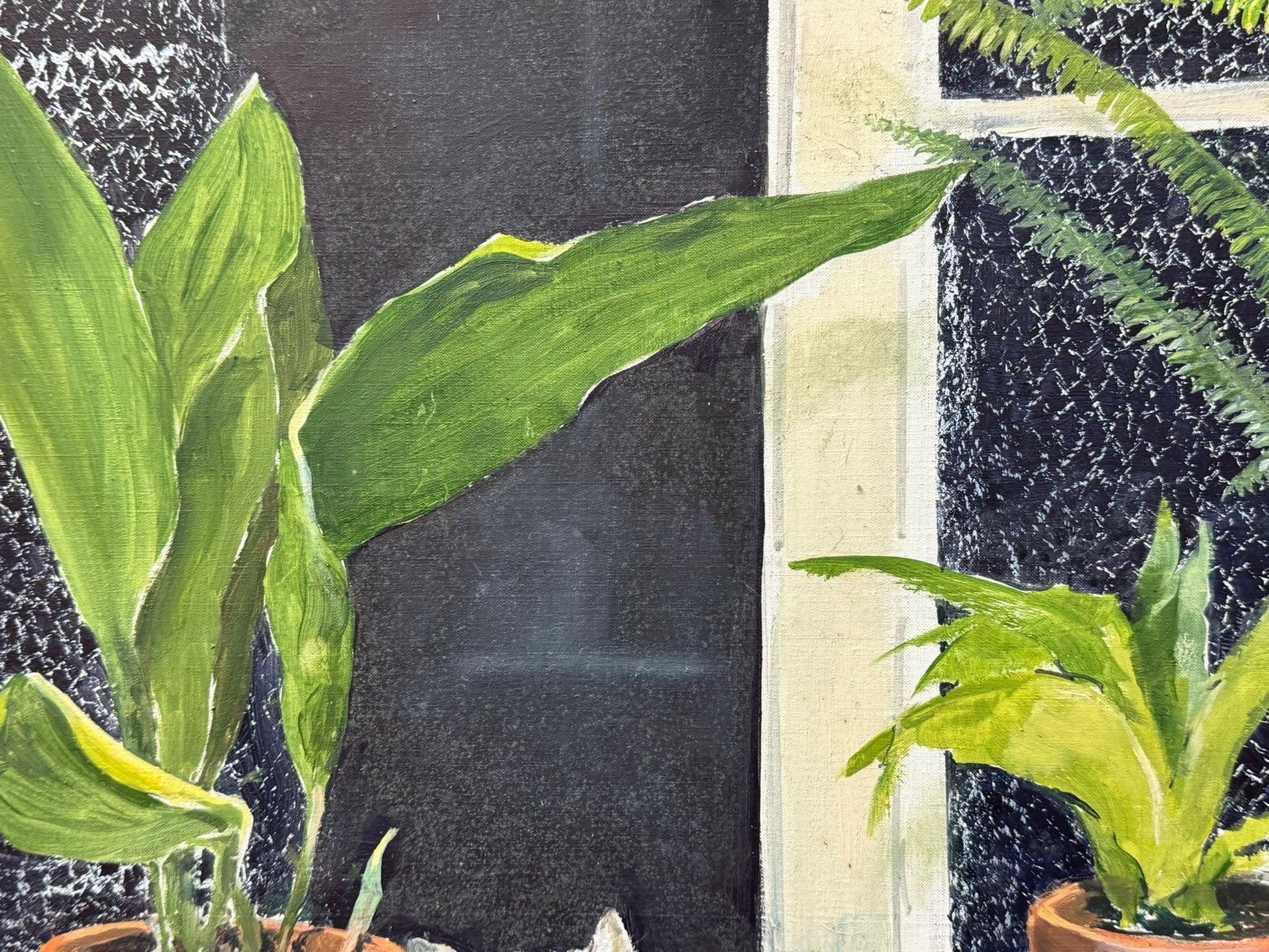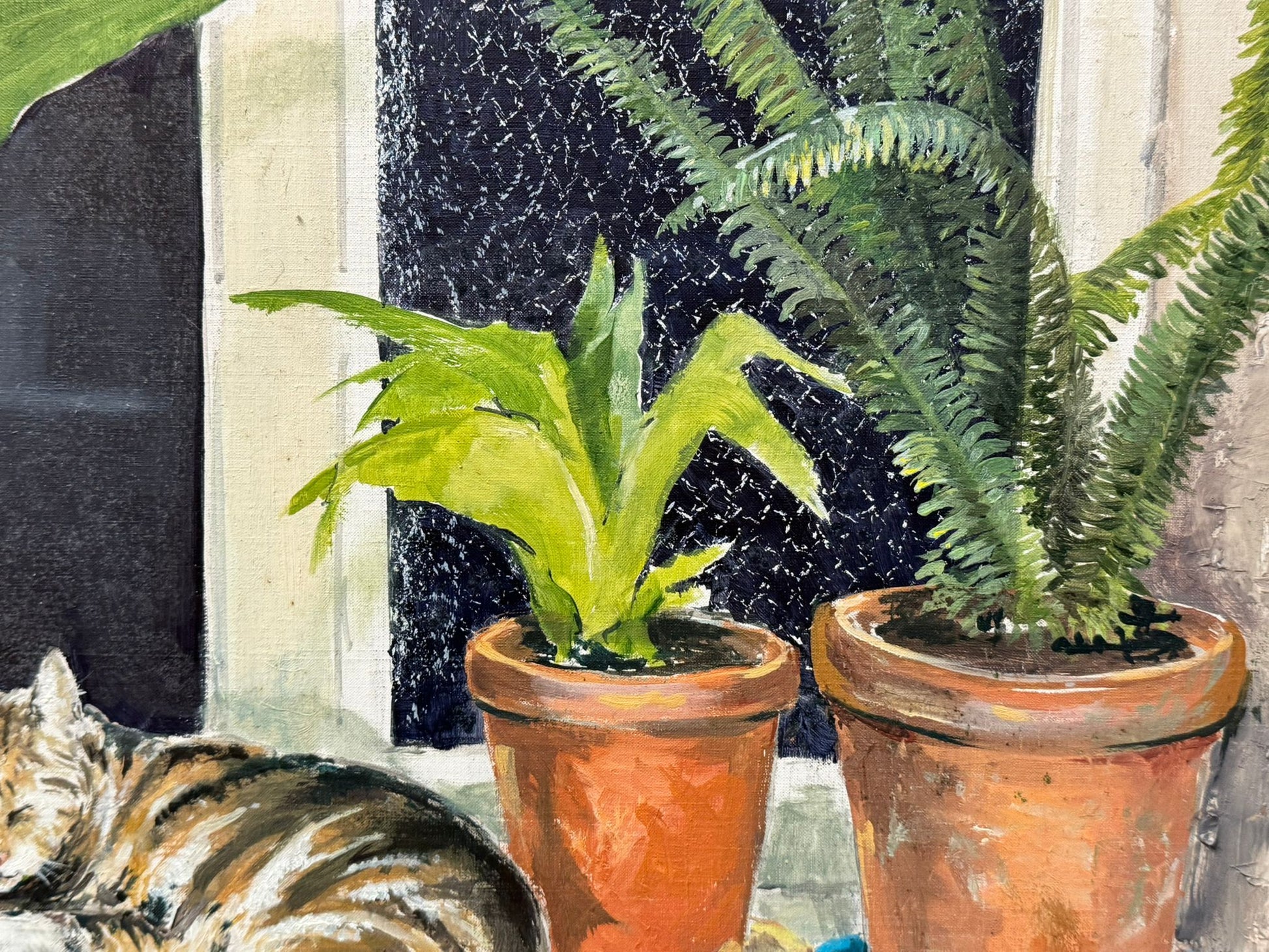 A charming oil on canvas depicting a cat sleeping amongst terra cotta pots by the well listed 20th Century artist Brain Wilson signed lower right.