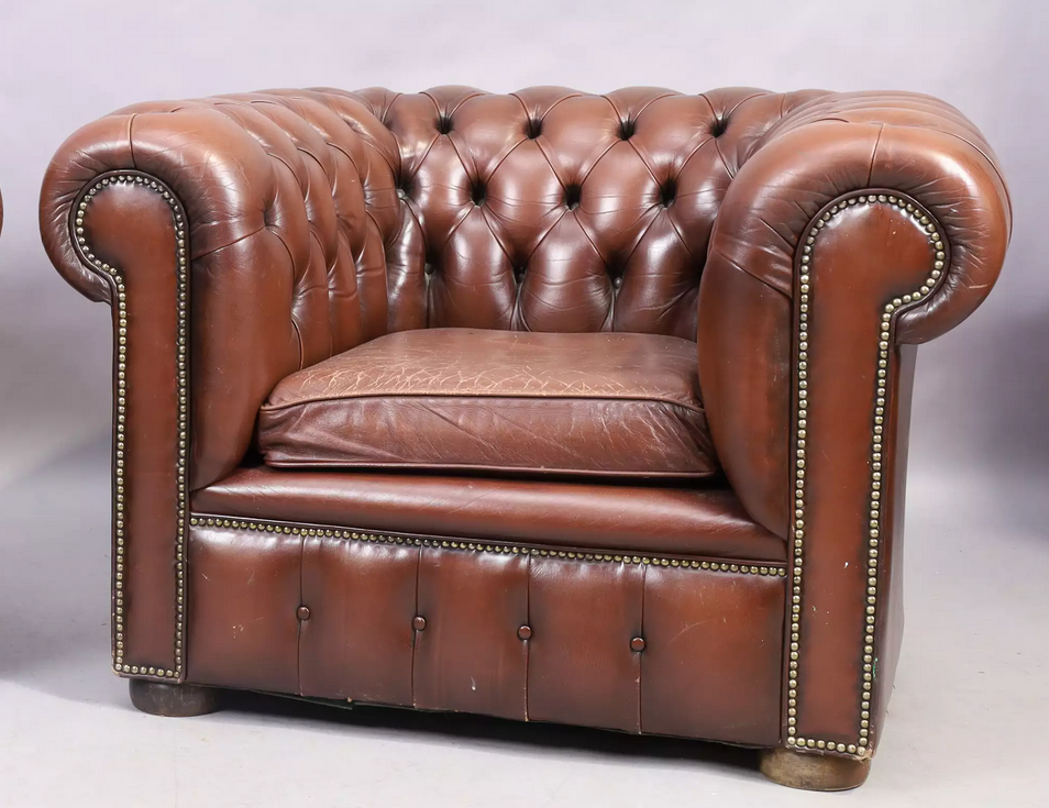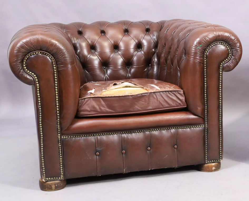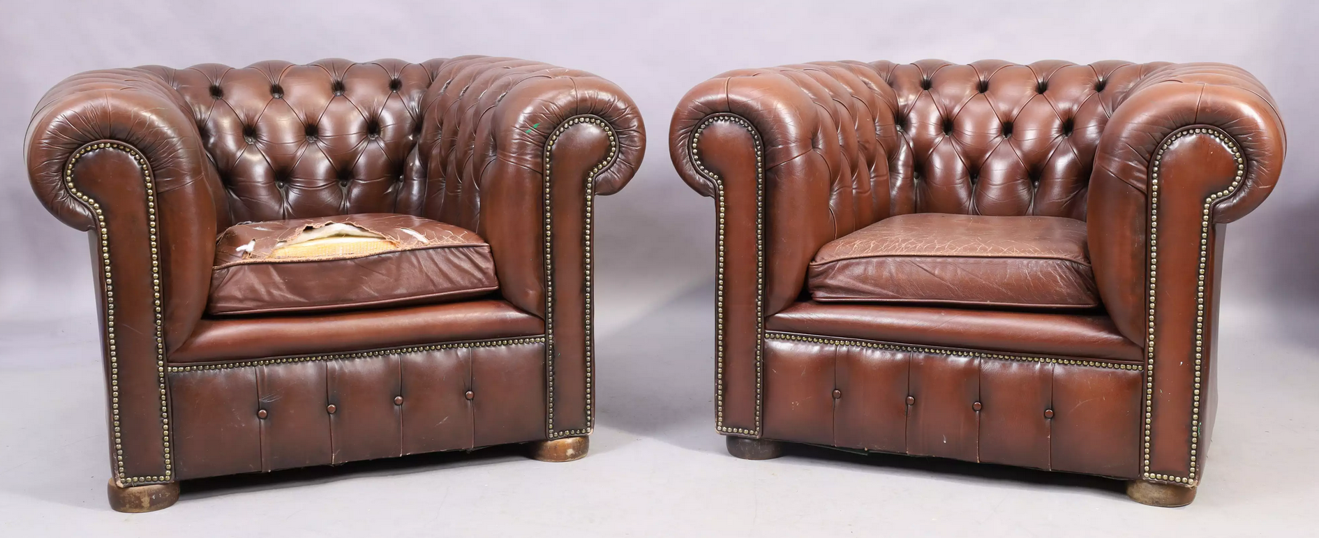 One of the chairs needs a repair to the leather and the other is nicely worn, both are very sturdy and usable. These chairs are good quality, and we are selling them “as is”