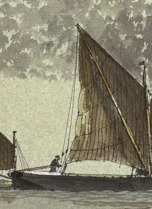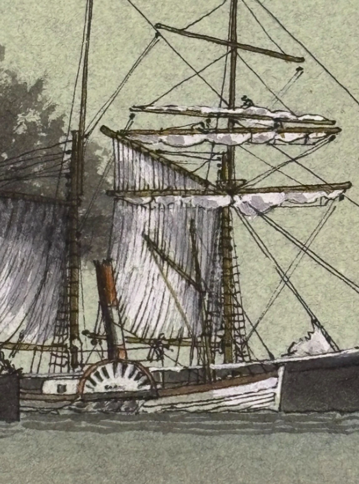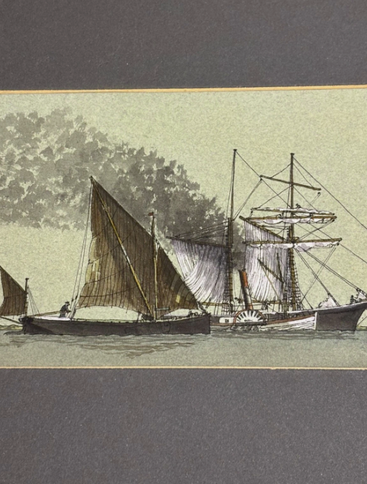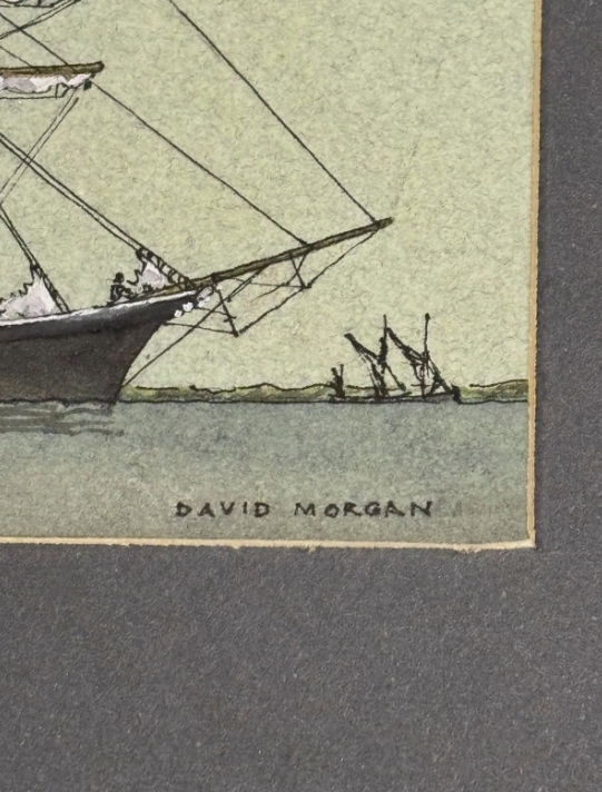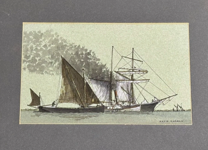 David Morgan Original Watercolour Ink Steamboat and Sailboat Signed
