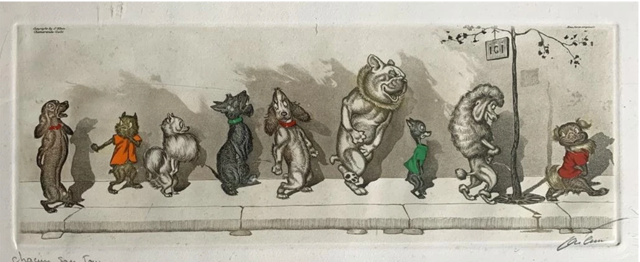 Boris O’ Keefe became an artist and cartoonist best known for his hand-colored etchings of dogs and cats getting into mischief. We are offering ‘Dirty Dogs of Paris’ or ‘naughty dogs’ because many of the etchings portray lewd acts.