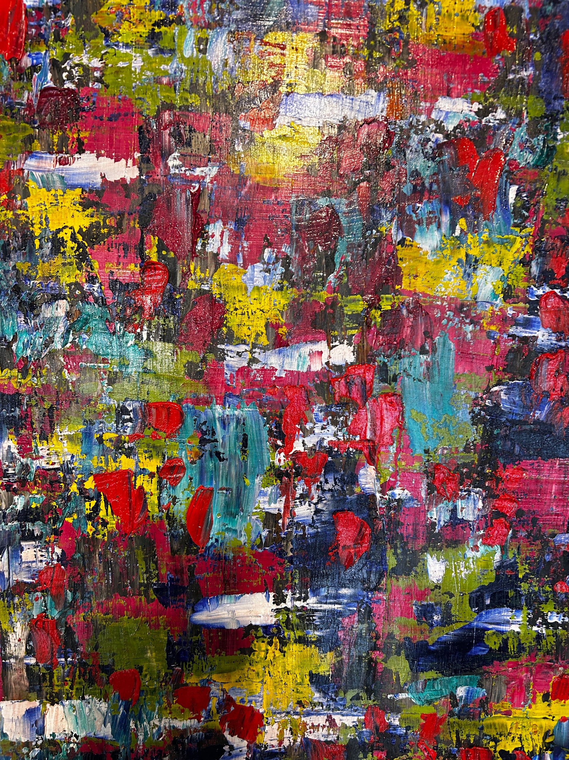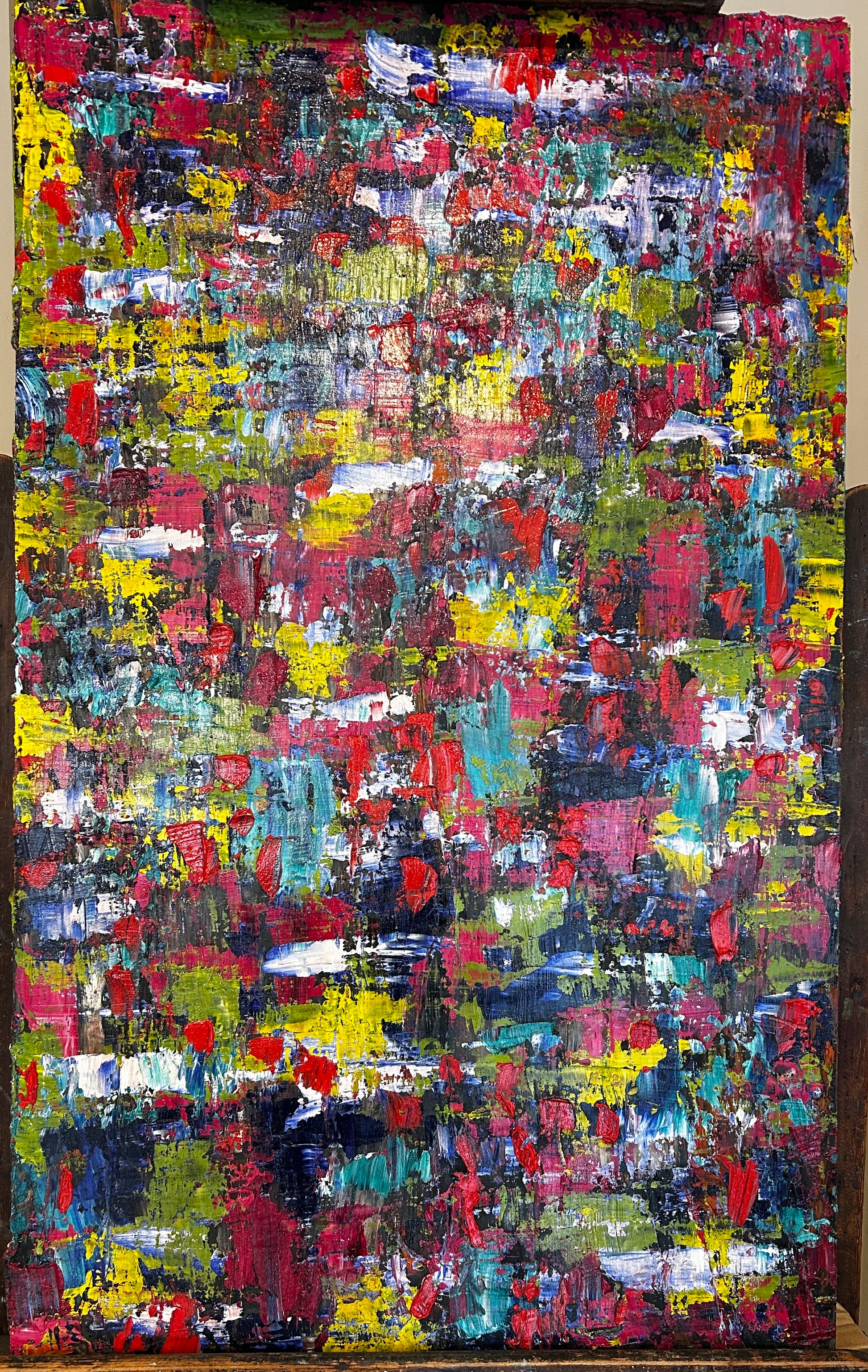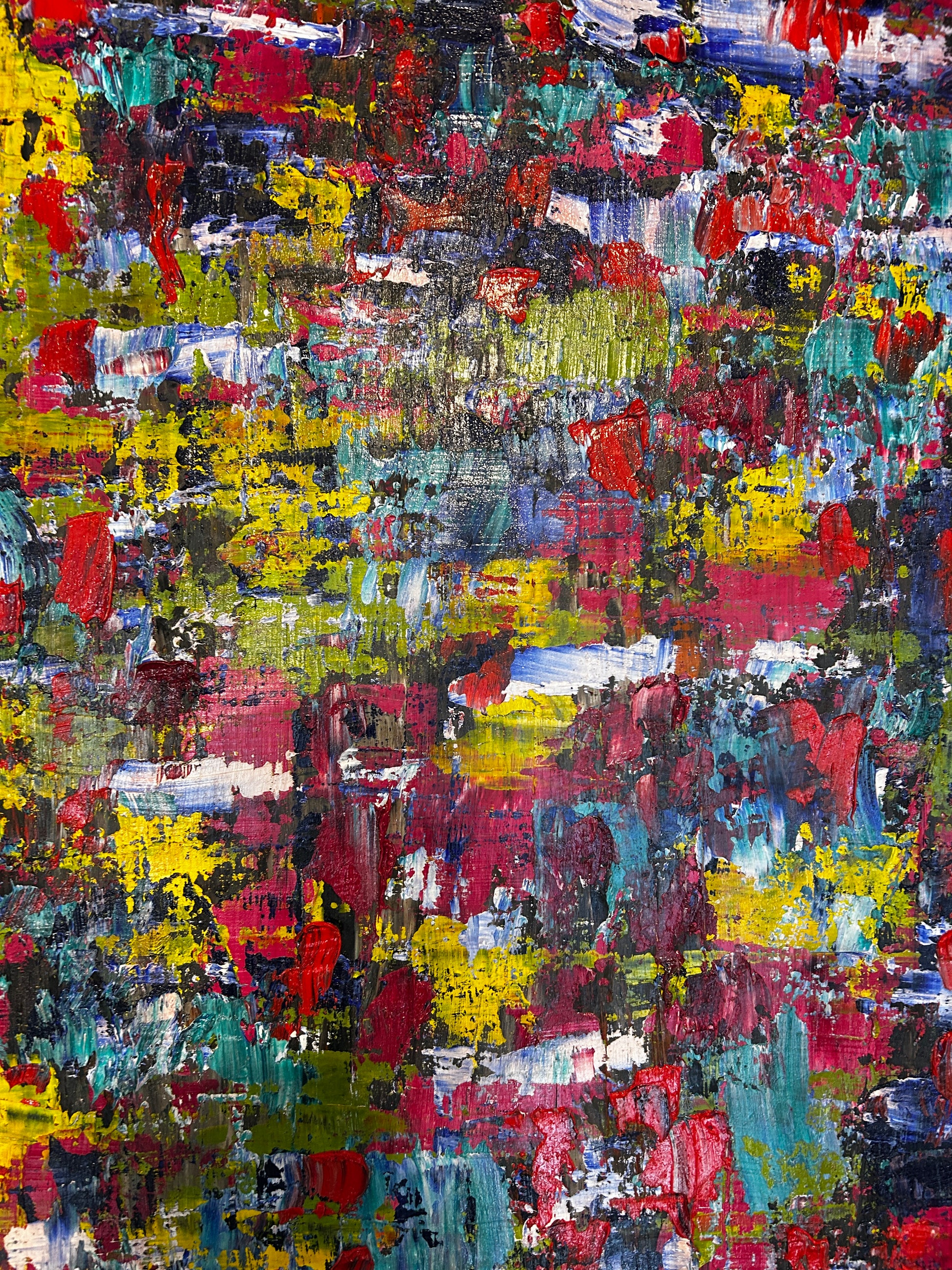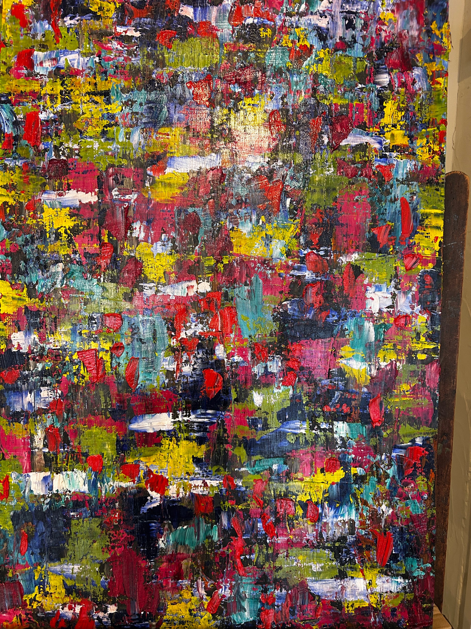 ABSTRACT COLOURFUL MODERN ART CONTEMPORARY OIL ON, BOARD GOOD SIZE AND SIGNED BY THE ARTIST TO VERSO.