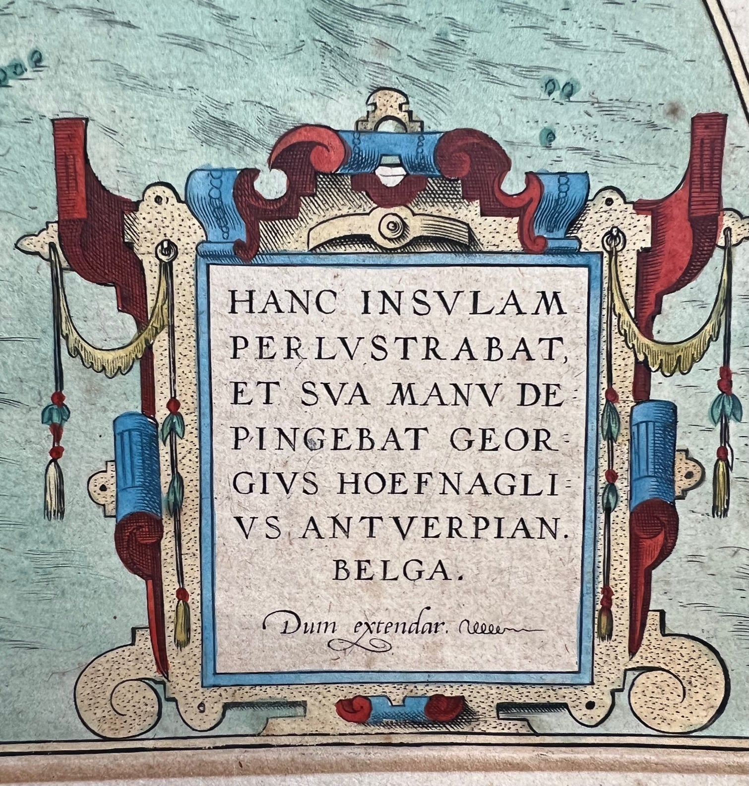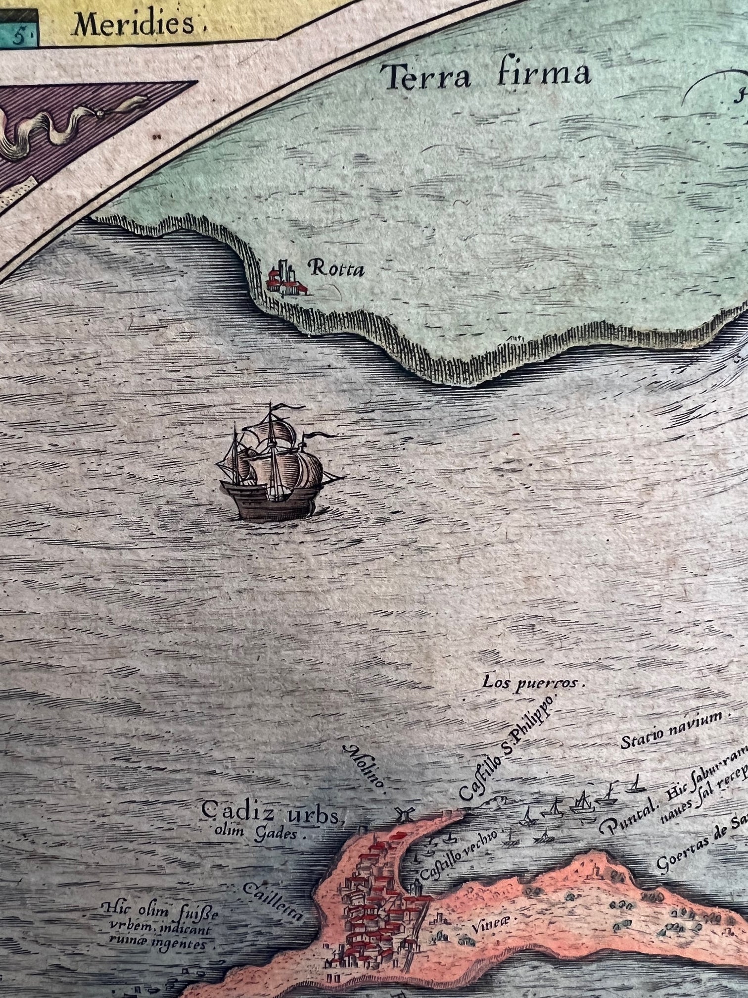 The larger semi-circular map at bottom is from one by Georgius Hoefnagliu. Georg (or Joris) Hoefnagel (1542-1601) was an artist, draftsman, printmaker, known for almost scientific naturalism of his plant and animal subjects. After the capture of Antwerp by Spanish troops in 1576, he traveled with Abraham Ortelius along the Rhine to the Mediterranean, visiting Venice and Rome, then on to Naples and other classical sites. The pair likely also travelled to Spain as they explored the Mediterranean.