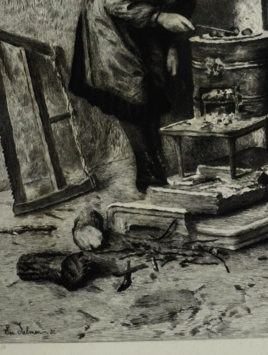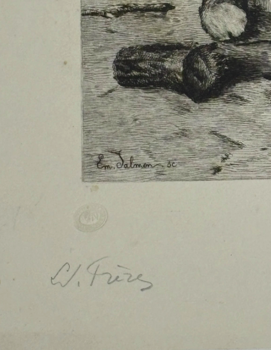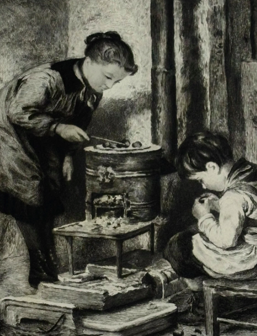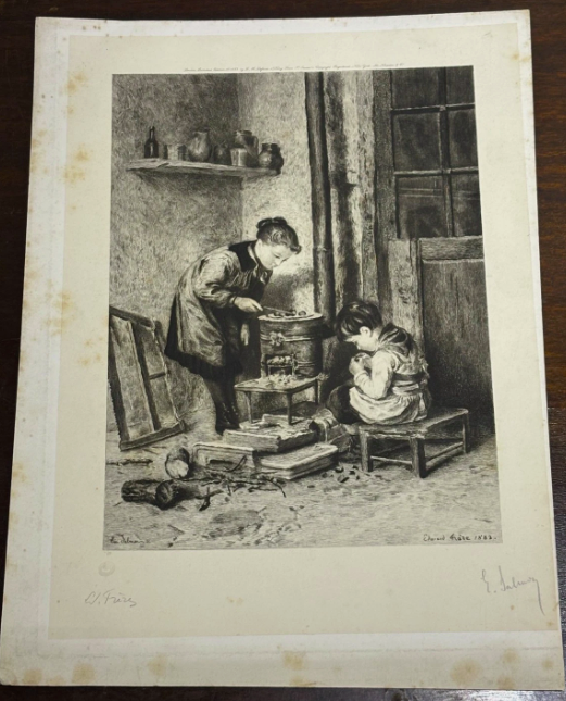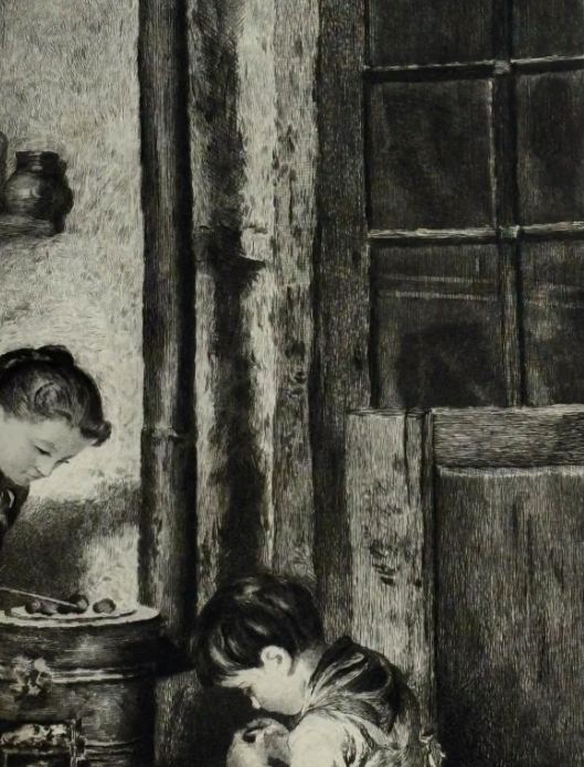 Edouard Frere (1819-1886) Mother and Son Roasting Chestnuts Etching Signed