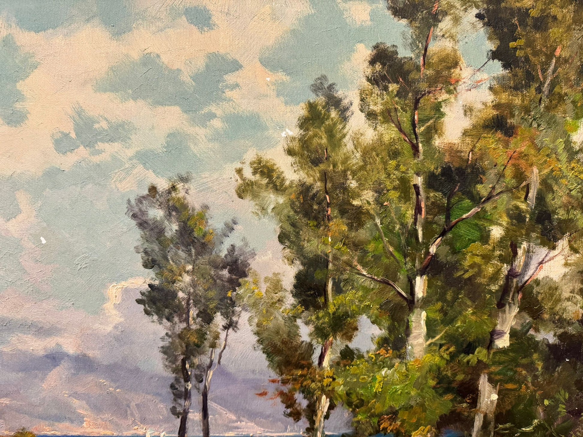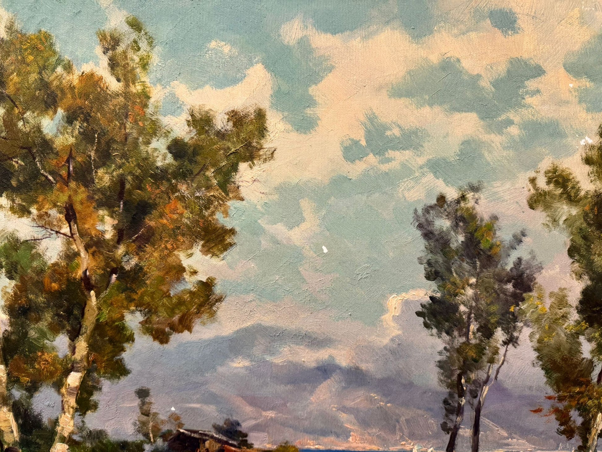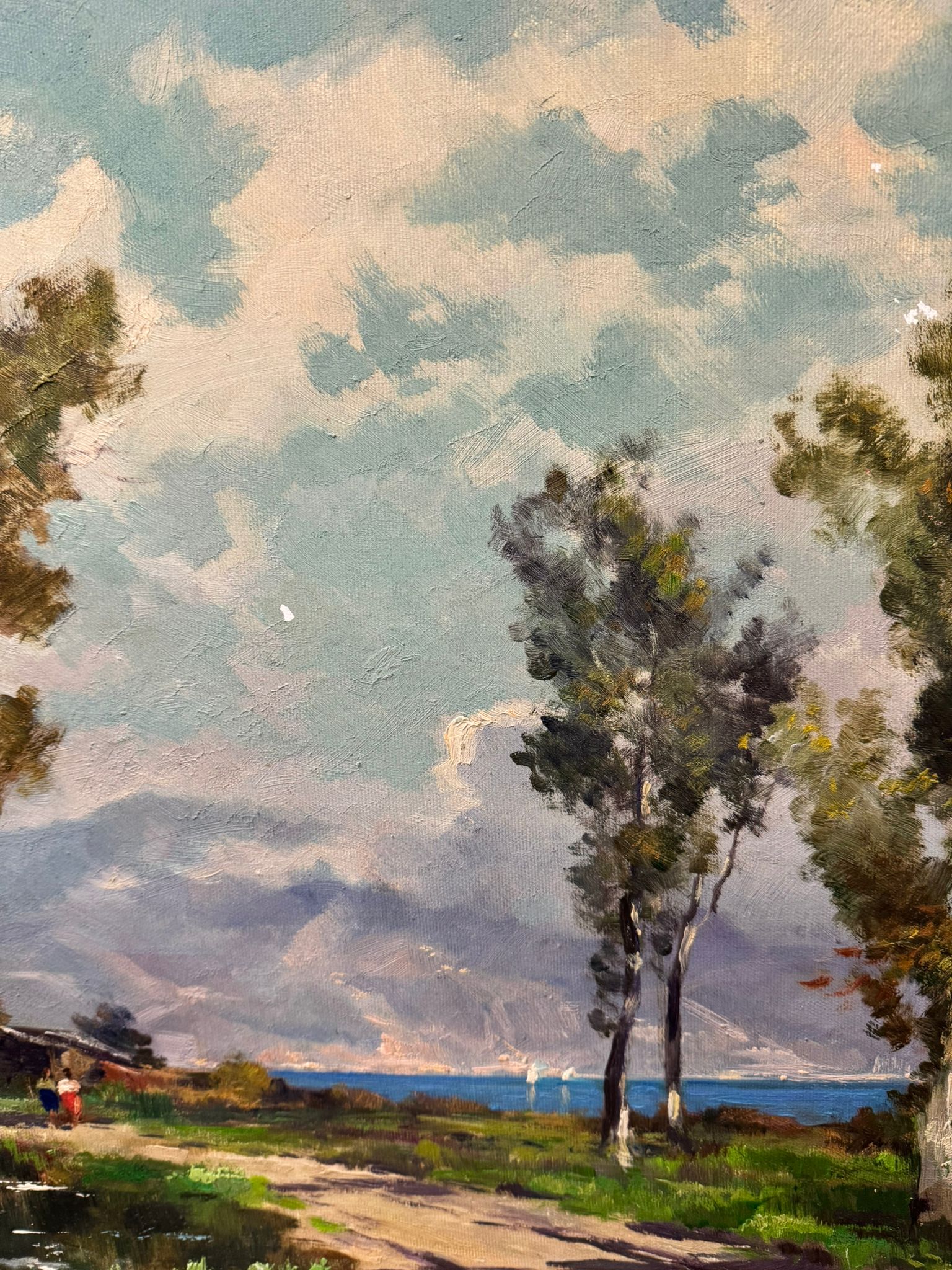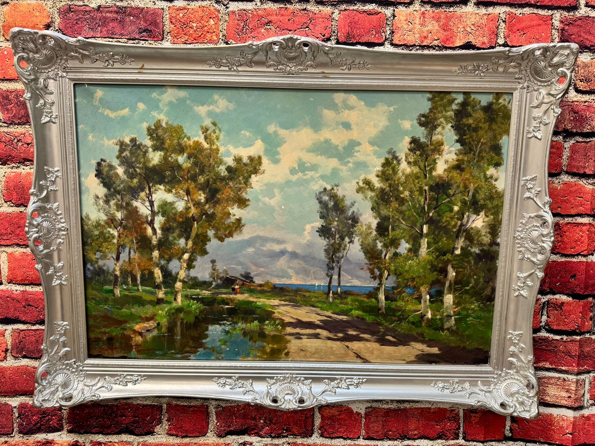 A highly decorative mid twentieth century oil painting by the well listed Italian artist, Ilio Giannaccini 1897-1968, depicting a beautiful landscape view with mountains in the distance, possibly the Amalfi coast. Signed to the lower left. Presented in a silver wooden frame.