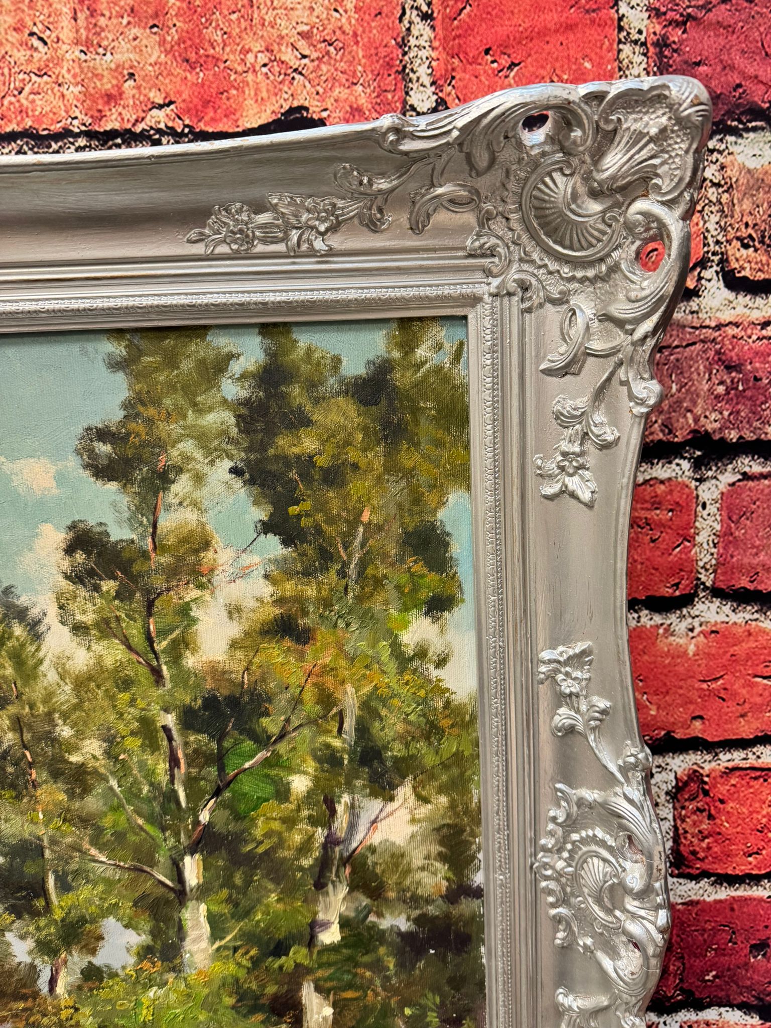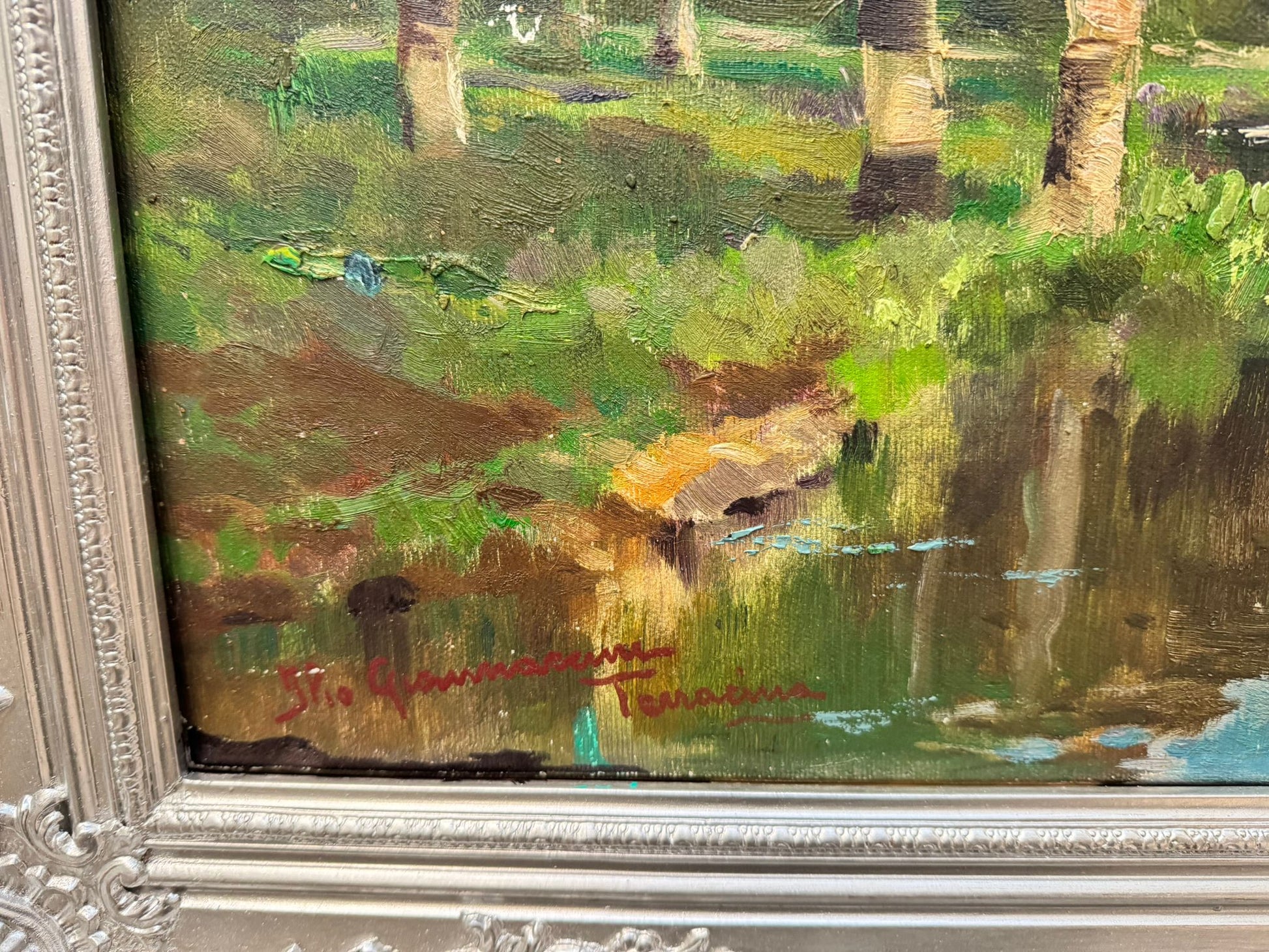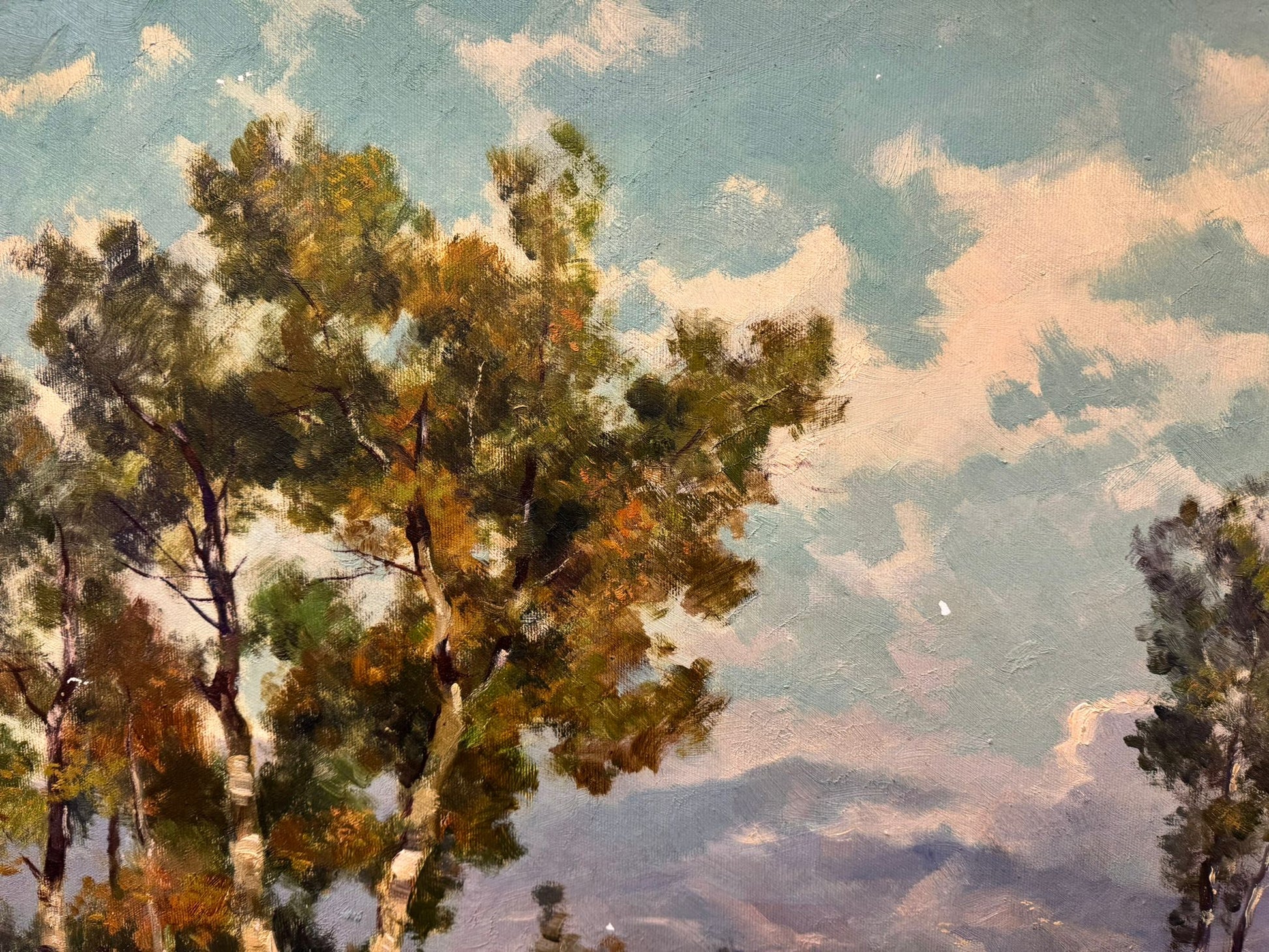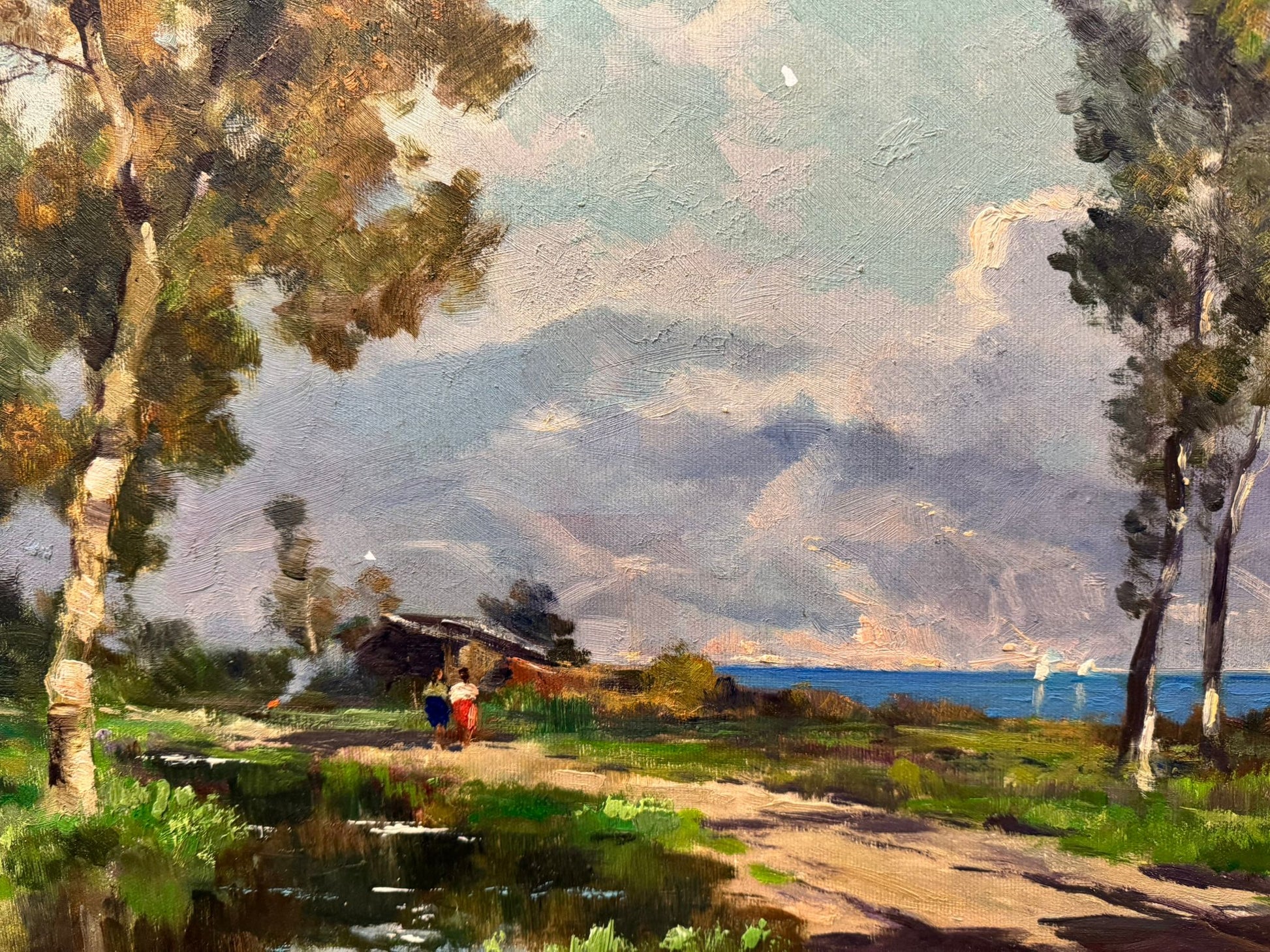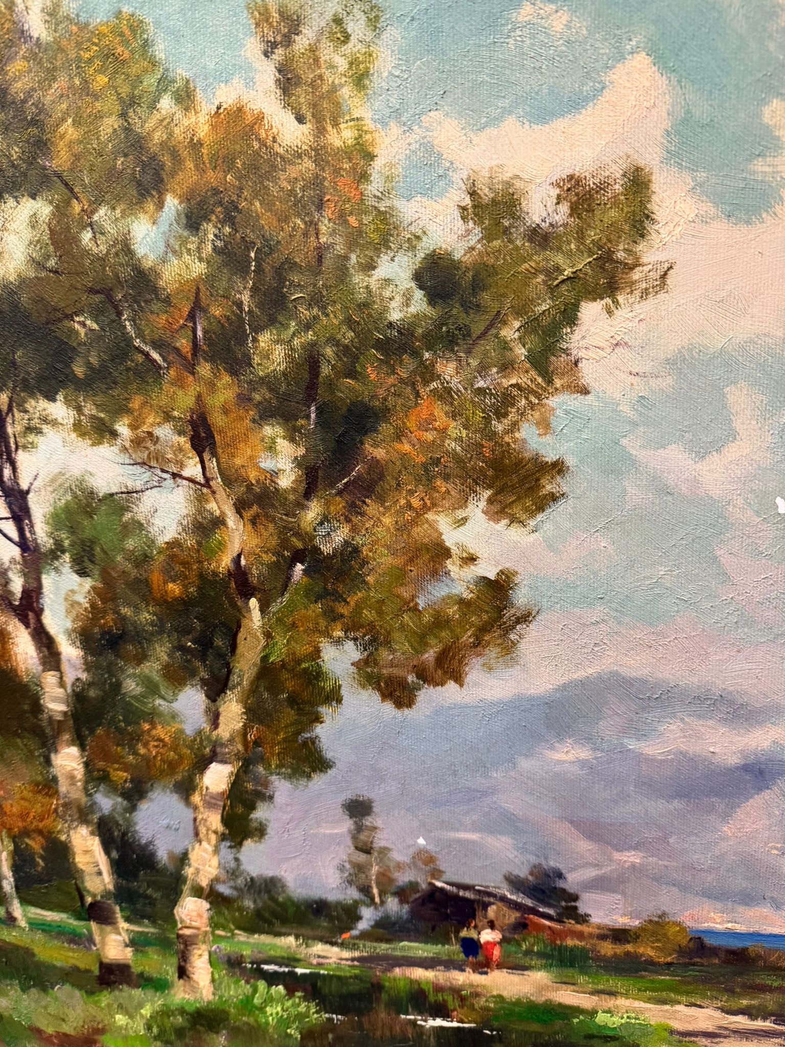 A highly decorative mid twentieth century oil painting by the well listed Italian artist, Ilio Giannaccini 1897-1968, depicting a beautiful landscape view with mountains in the distance, possibly the Amalfi coast. Signed to the lower left. Presented in a silver wooden frame.