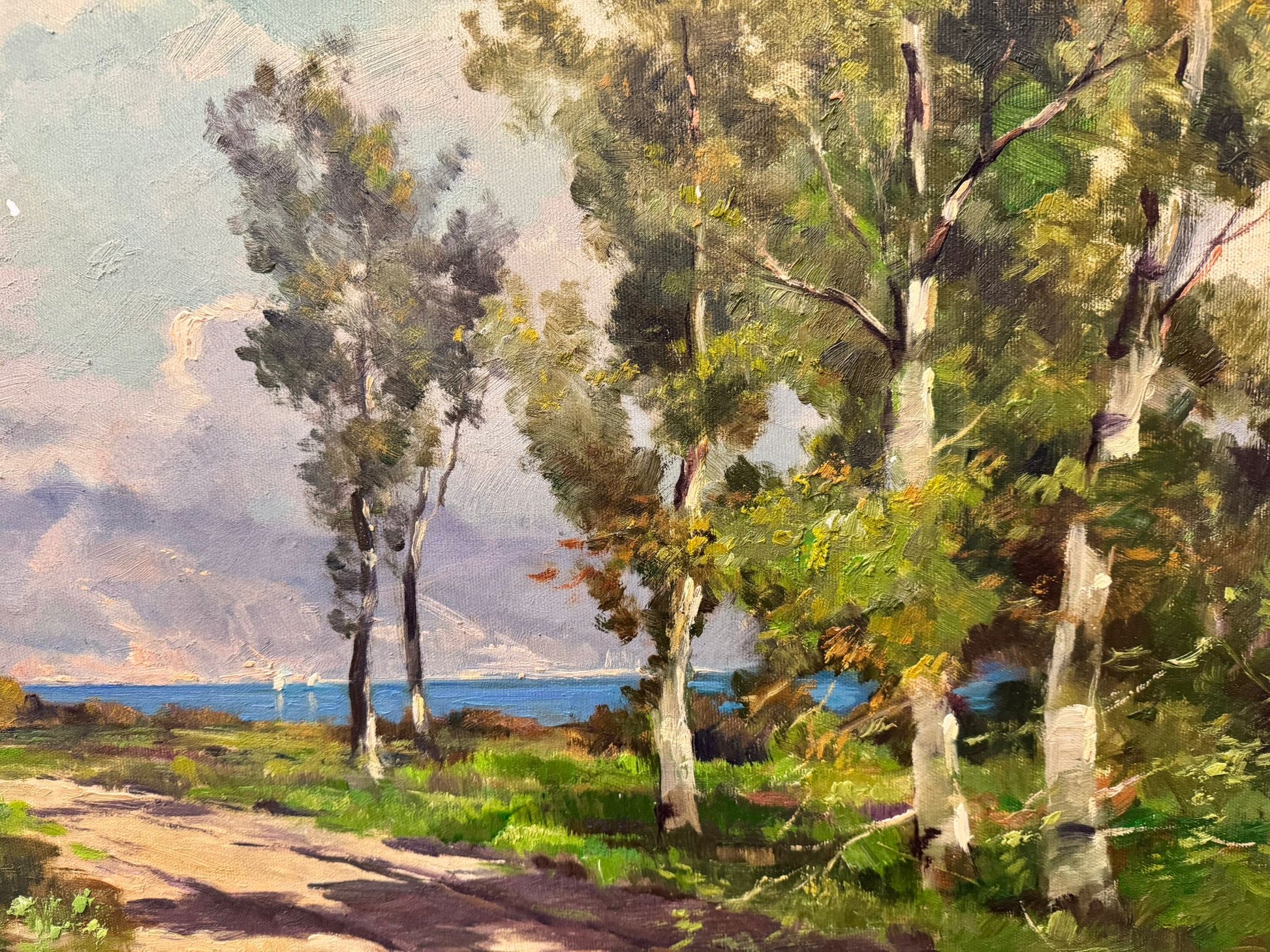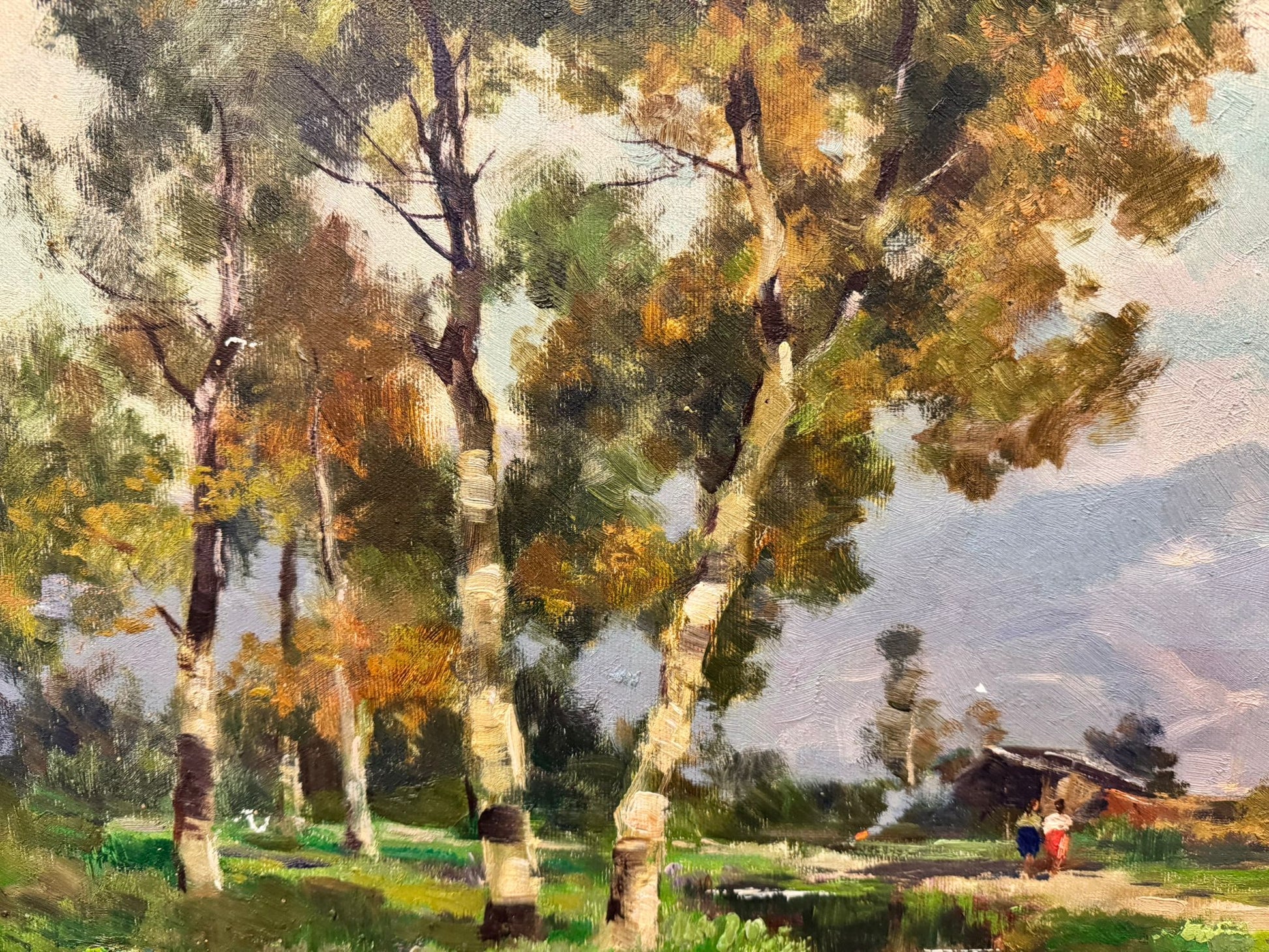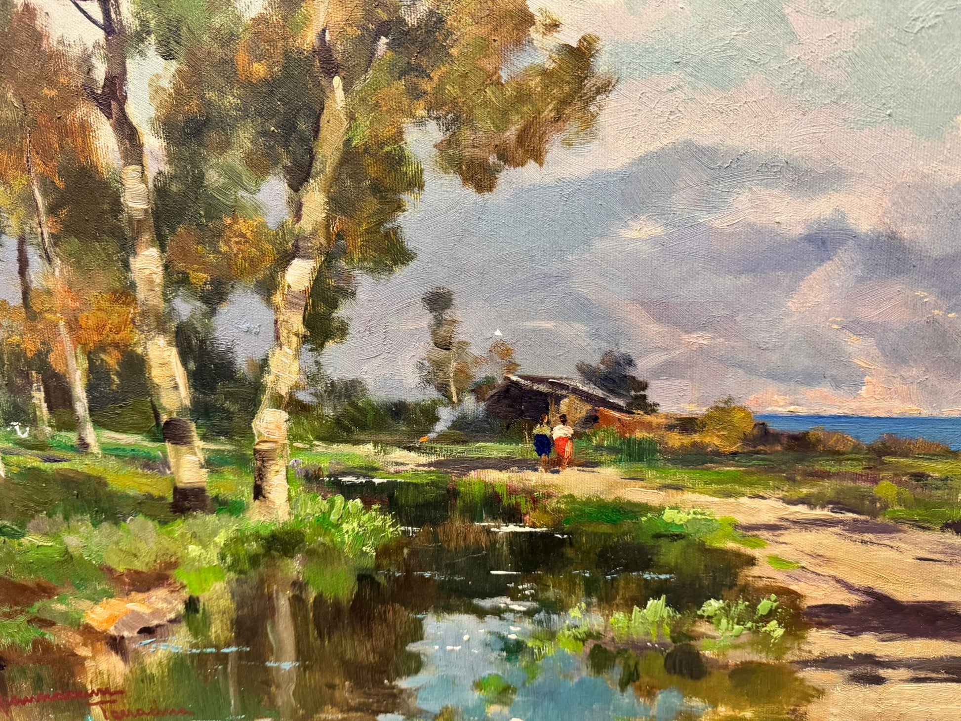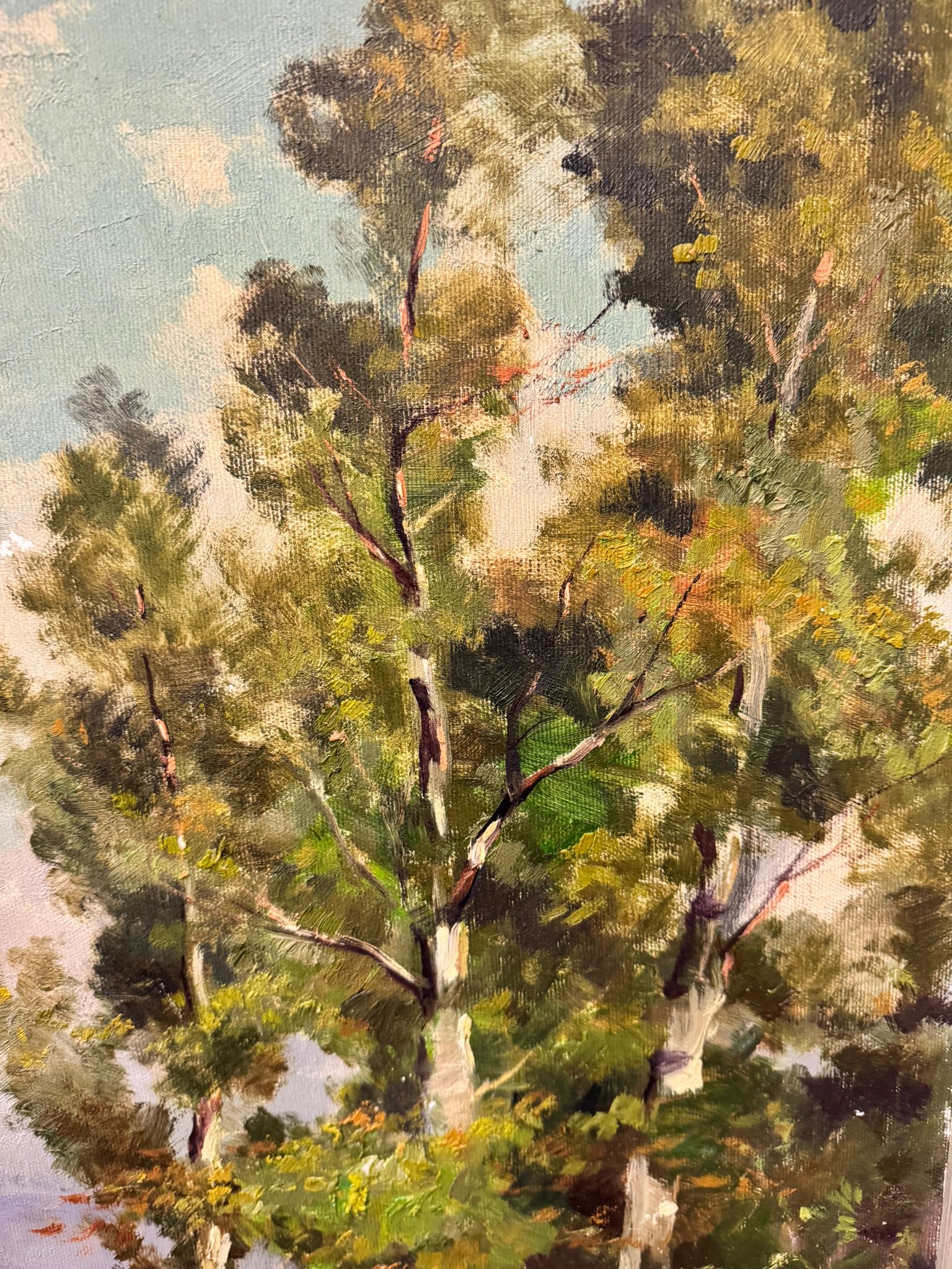 A highly decorative mid twentieth century oil painting by the well listed Italian artist, Ilio Giannaccini 1897-1968, depicting a beautiful landscape view with mountains in the distance, possibly the Amalfi coast. Signed to the lower left. Presented in a silver wooden frame.