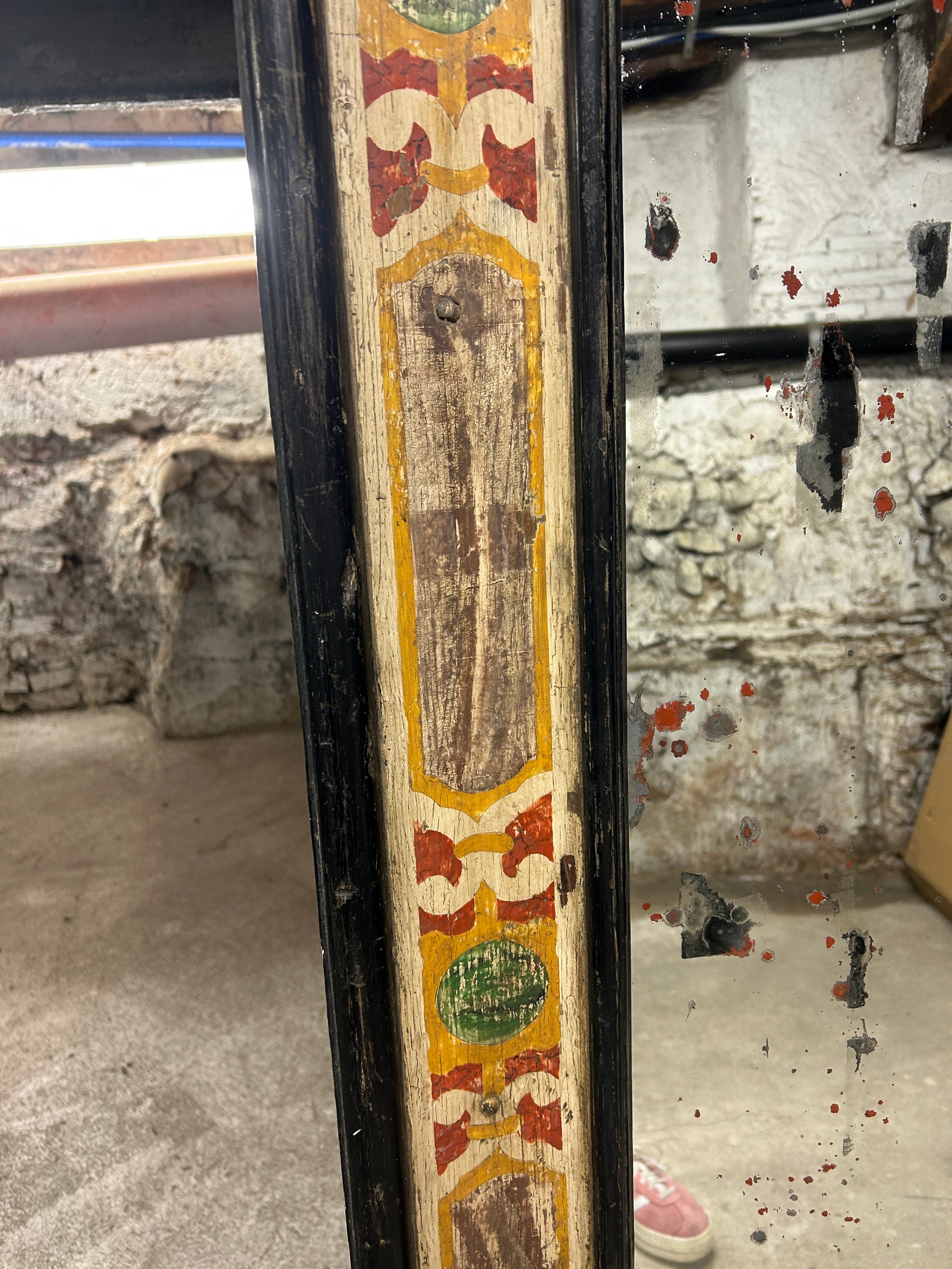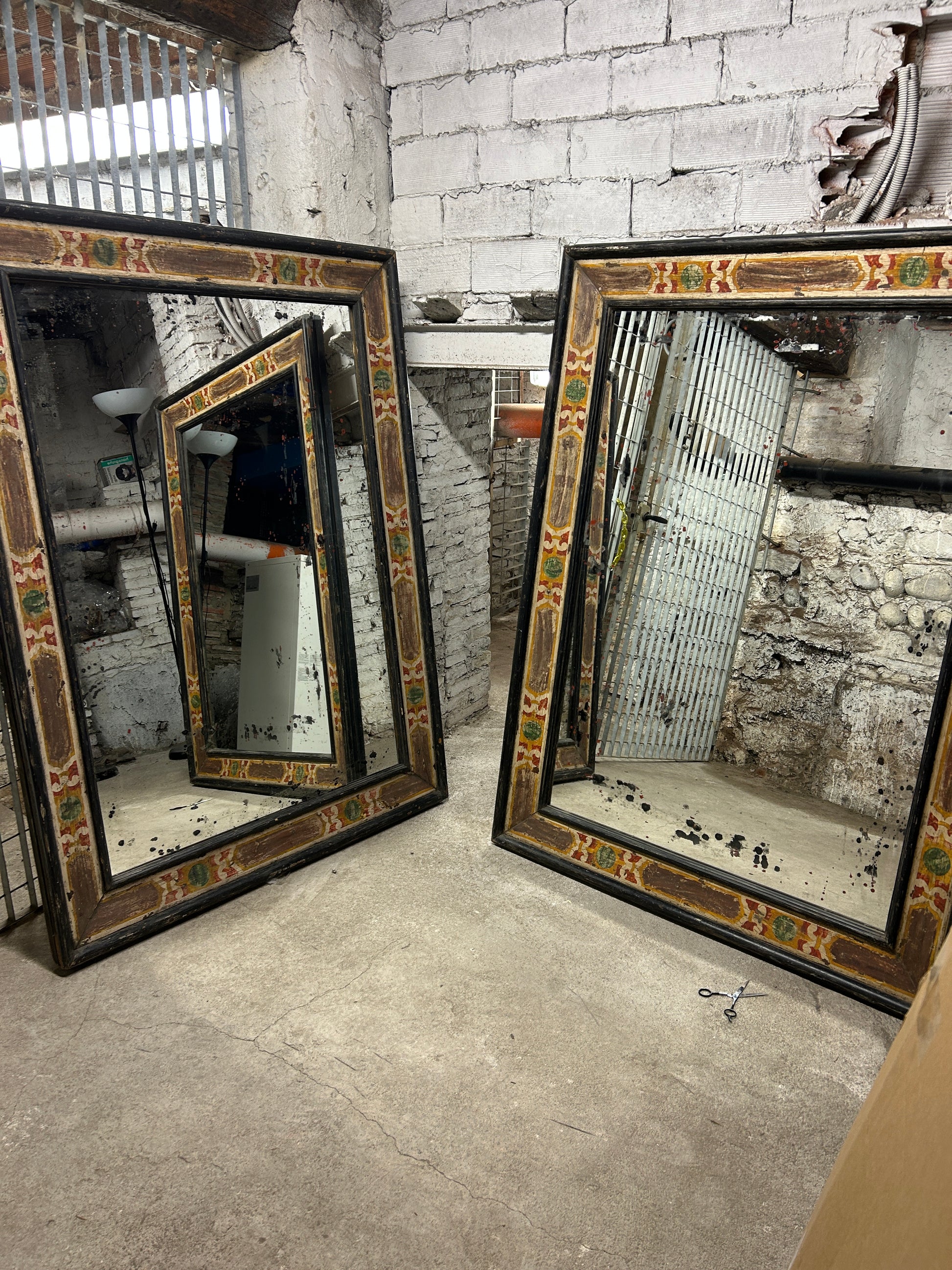 A pair of one of a kind antique Italian Empire Period (early 19th Century) carved wood Casetta frames. These are of a very high quality hand painted rectangular solid wood frames with aged modern mirror plates. A repeated patterns decorates these wonderful art objects in a warm palette of Sienna red, brown, green and gold which alternate across an Ivory background. The raised mouldings are black which works as a stunning contrast with the ornate design current with the period.