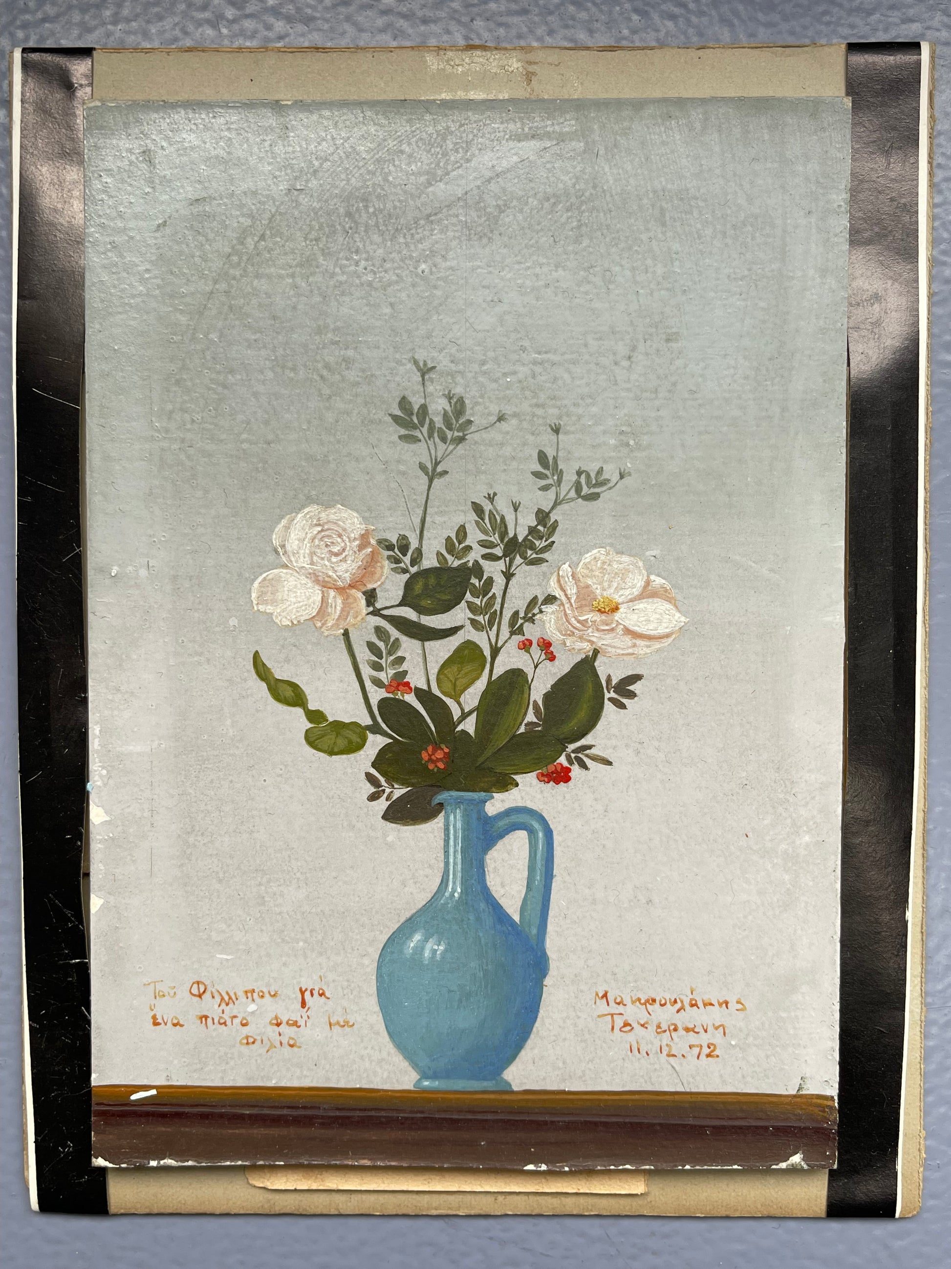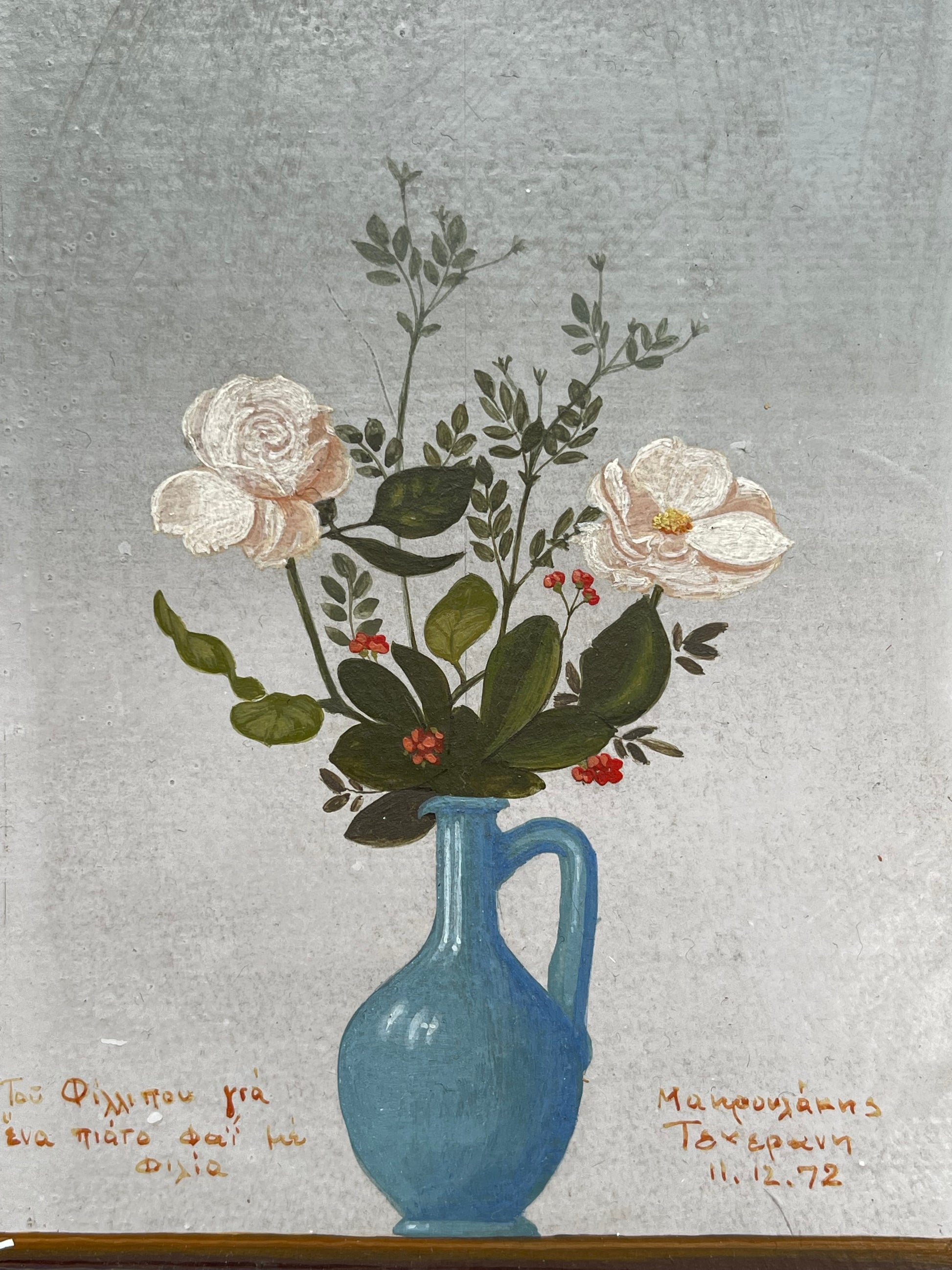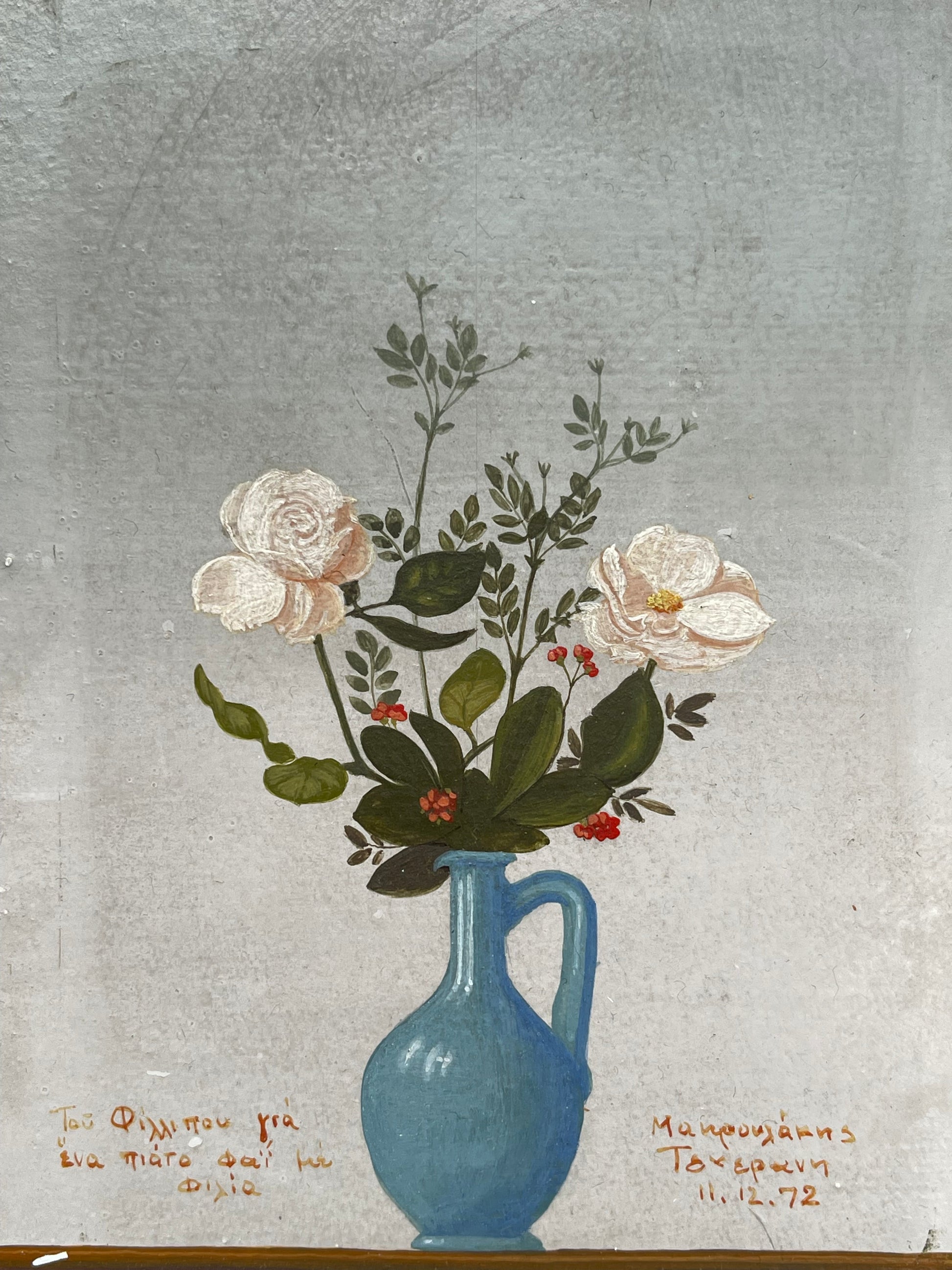 A superb original oil painting by the Greek artist, Michalis Makroulakis. The painting depicts a beautiful still life of flowers and is inscribed and signed to the lower margin in Greek.