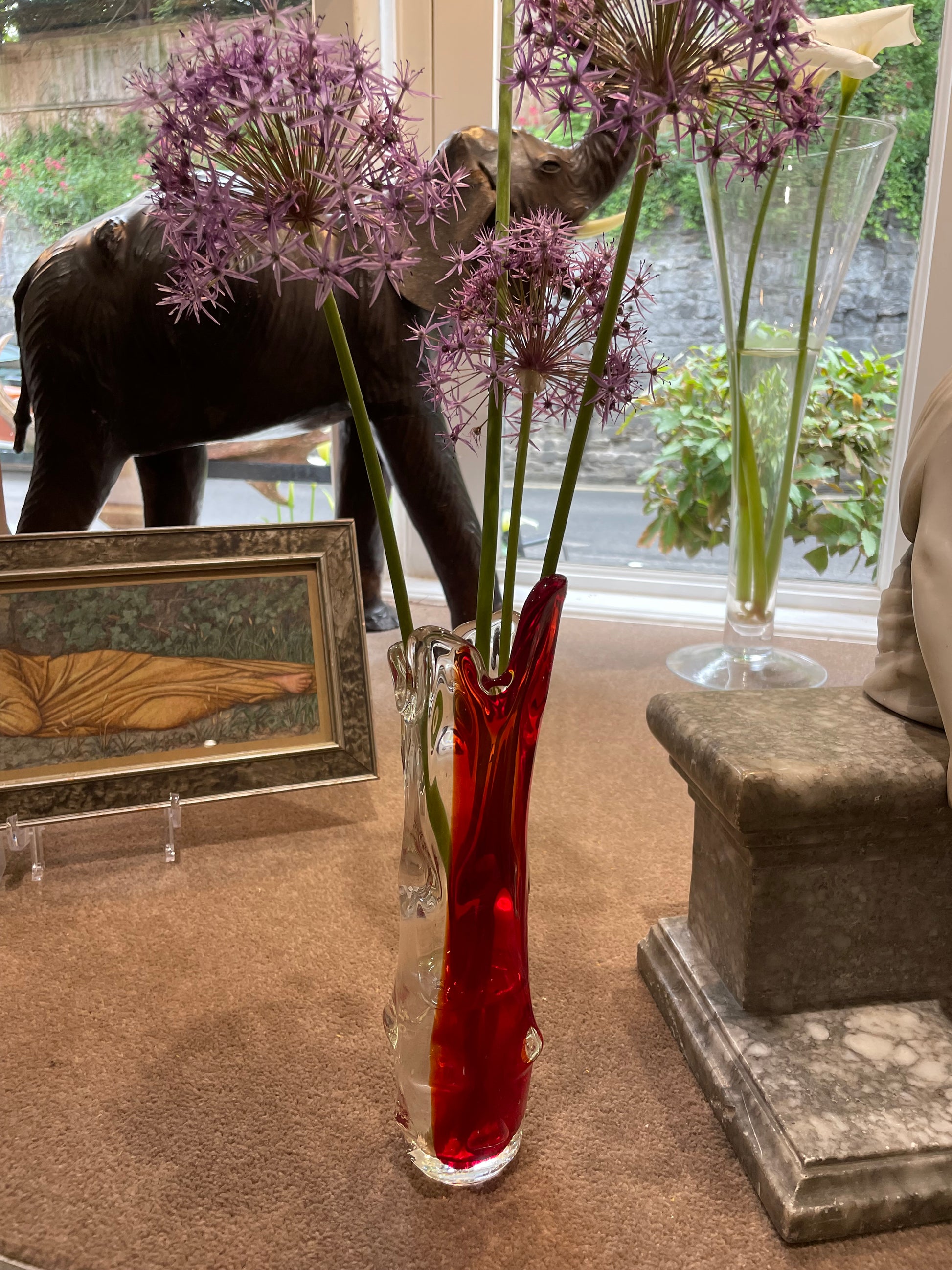 Quirky and interesting slender red and clear textured and asymmetrical art glass vase.