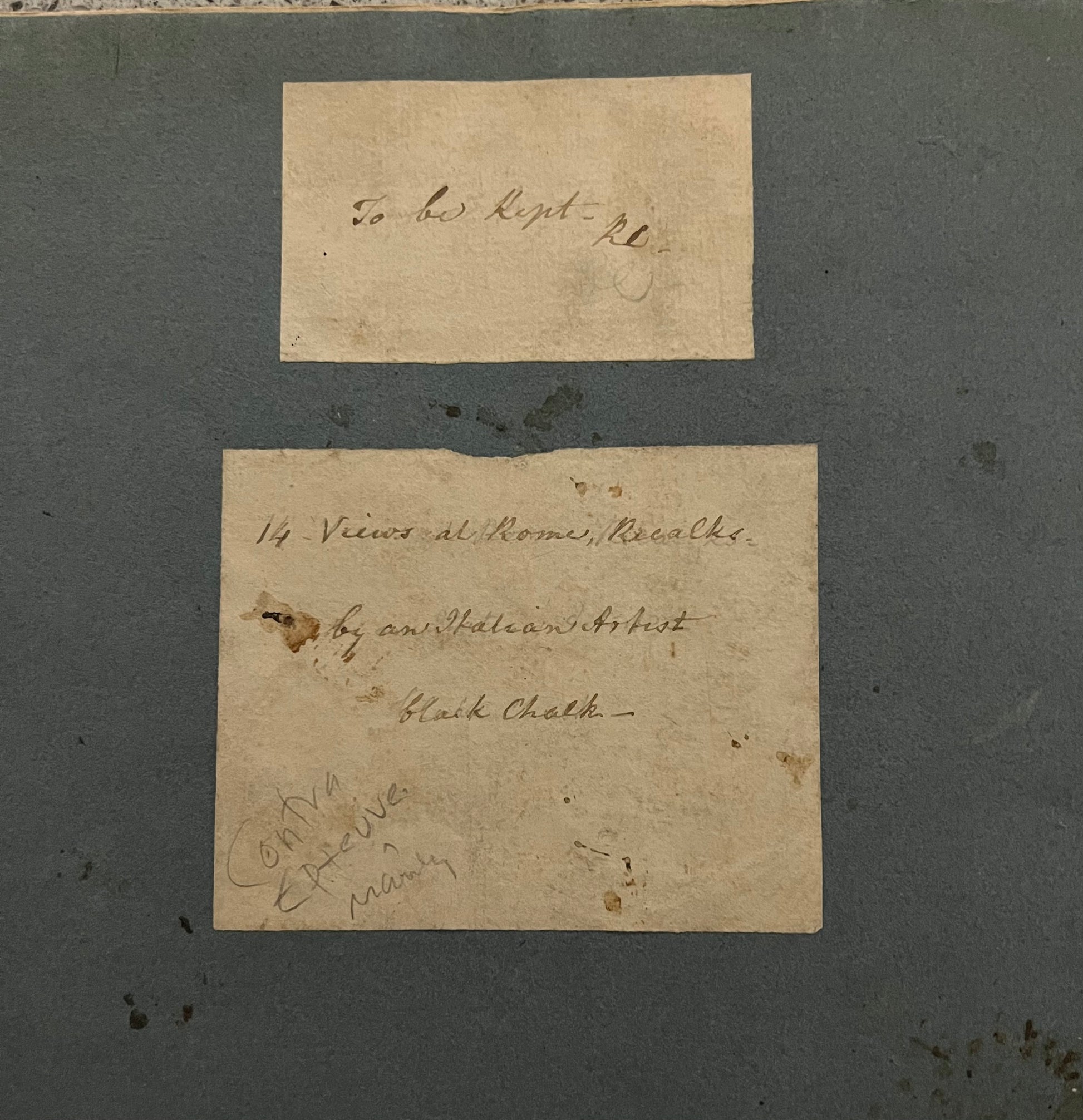 High quality late 18th century Album of Chalk/pencil Old master drawings of Rome and surrounds. Unfortunately, the drawings are not signed but of excellent quality. There are no clues on the covers of the volume other than what appears to be an owner's label. The book is bound in its original blue paper covers and appears complete. The drawings are on laid paper and have a Fleur de Lis watermark, probably of Italian or French origin.
