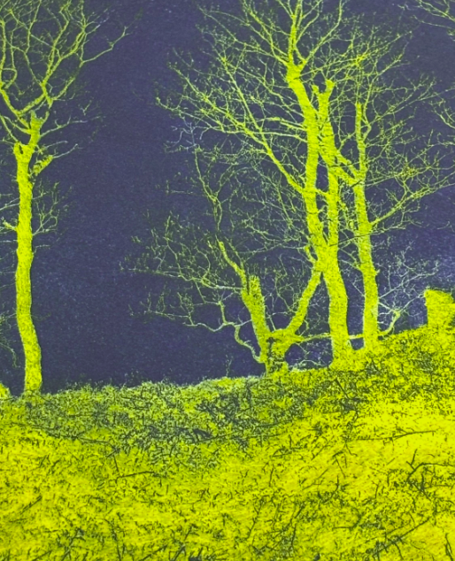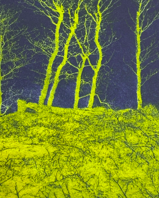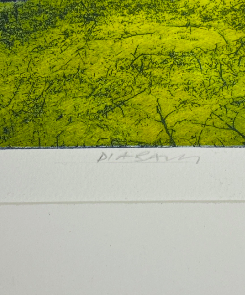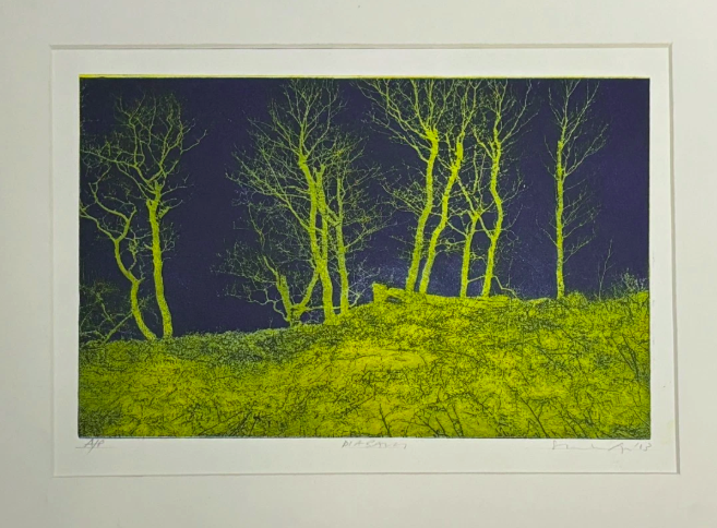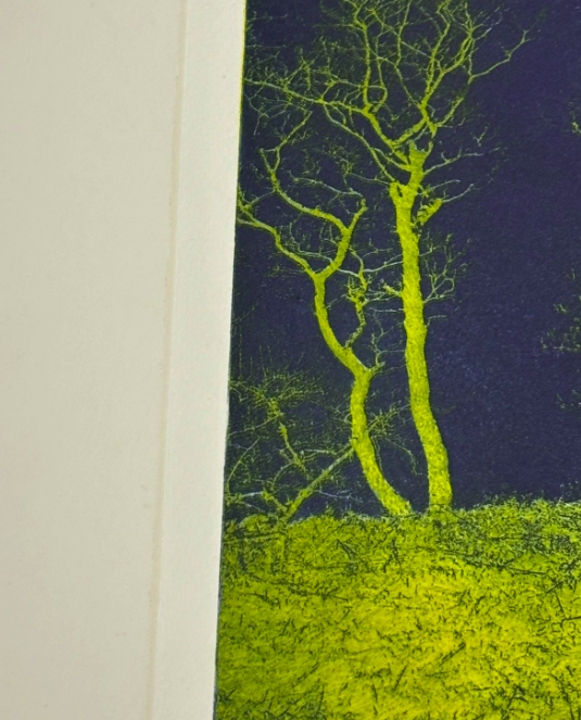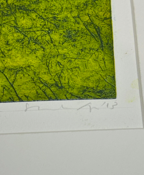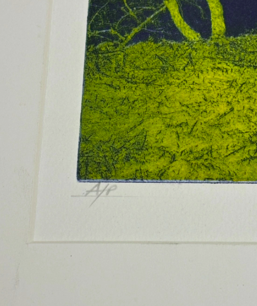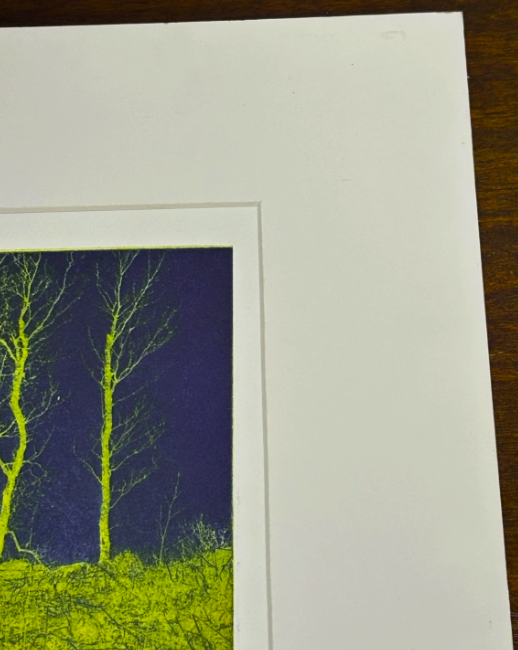 Selling here is an original lithograph of a forest in a deep night. The bright green contrasts with the dark sky above. The print is signed.