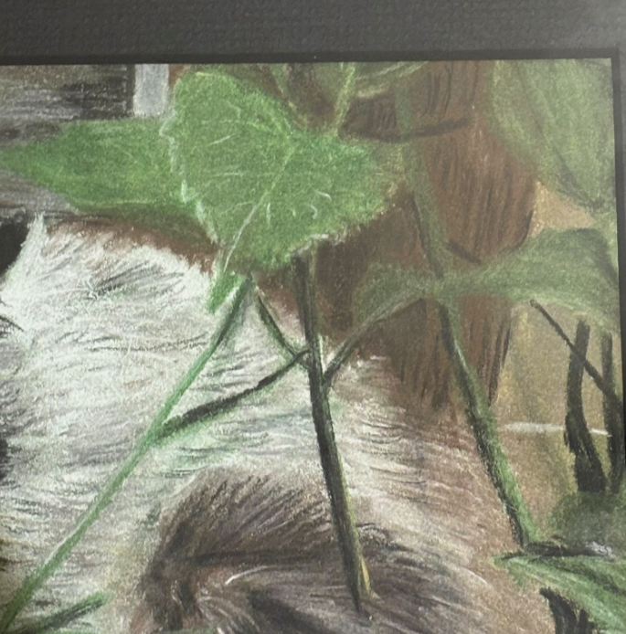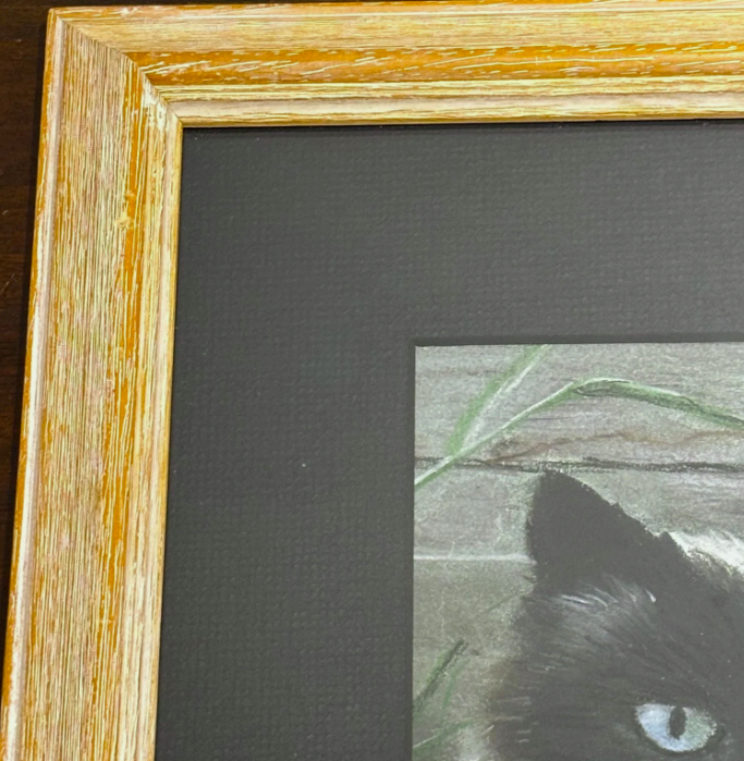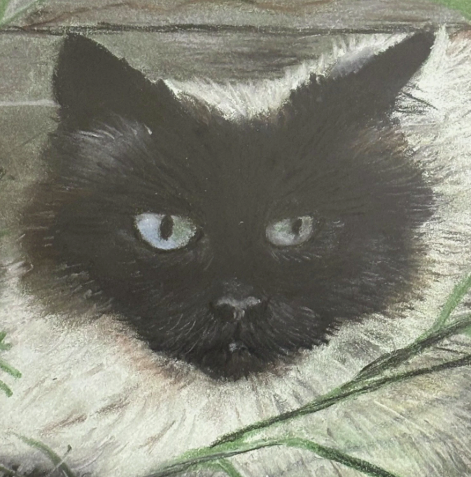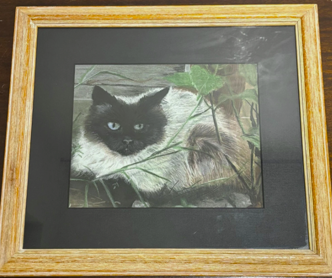 Selling here is an original pastel painting of a Siamese cat crouching in some foliage. This piece is rather sweet and will work in any home.