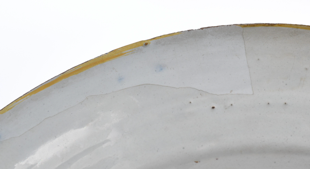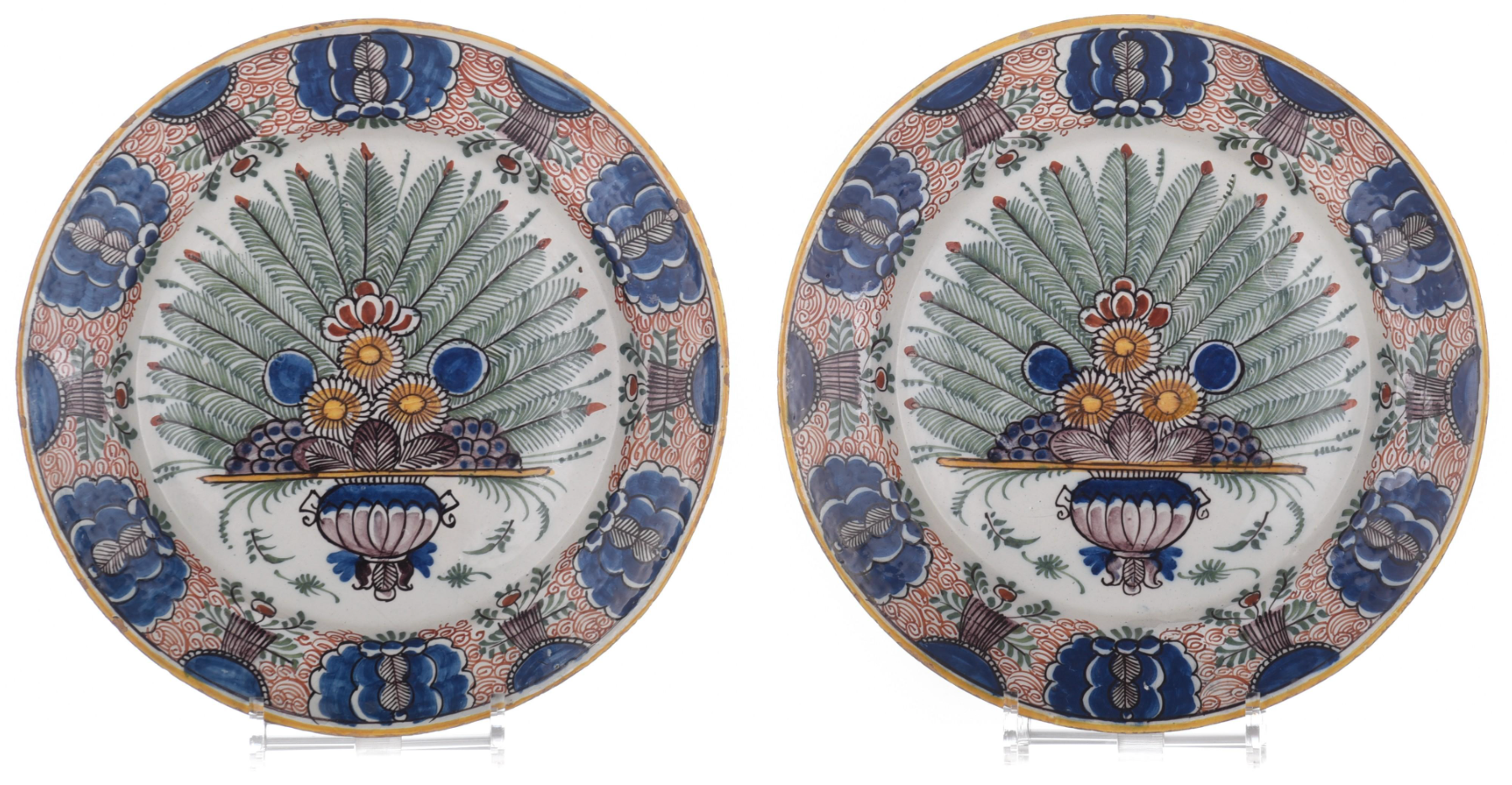 A beautiful pair of 18th century dutch delft peacock tail chargers. Makers mark to verso of each plate.
