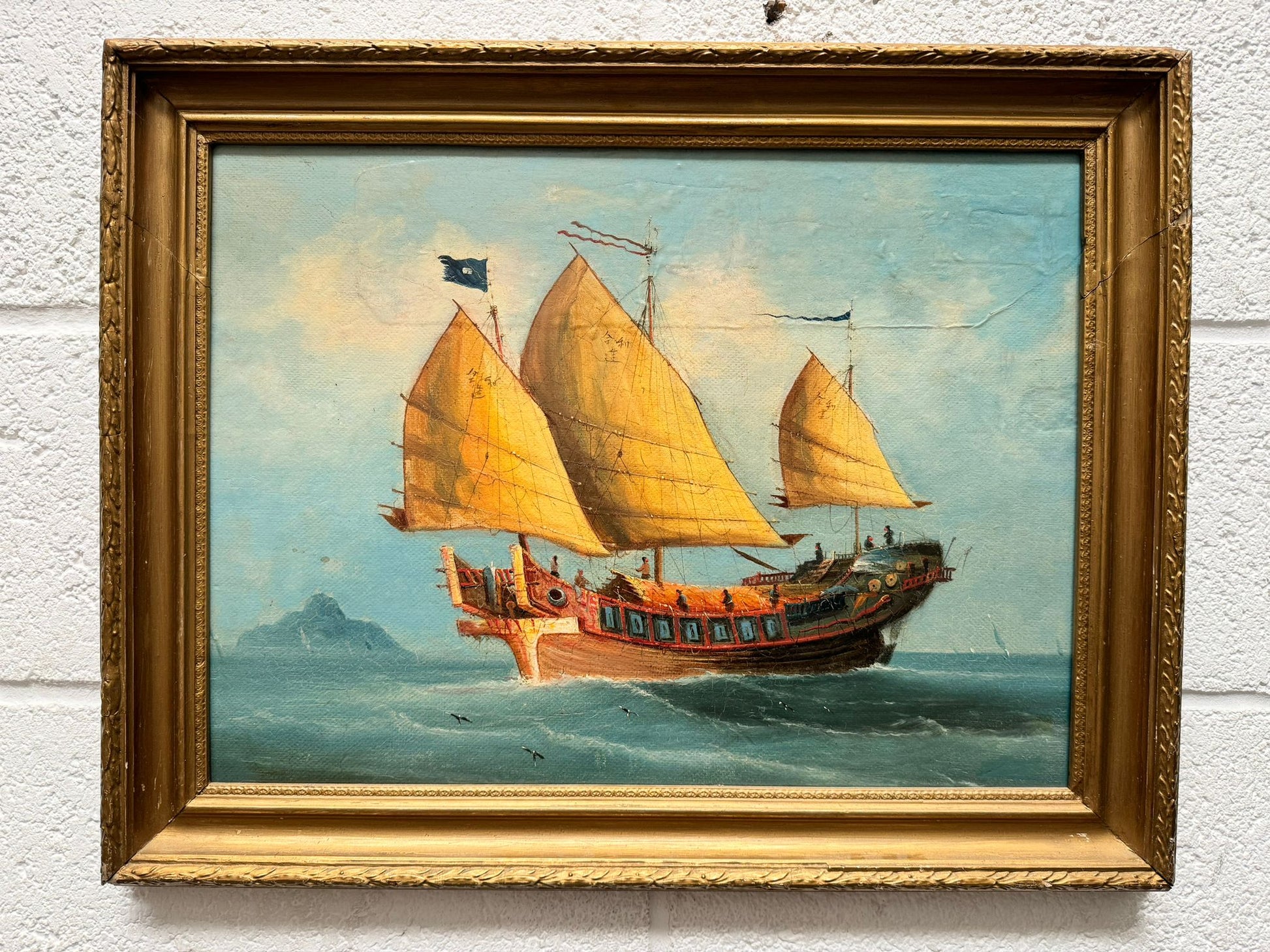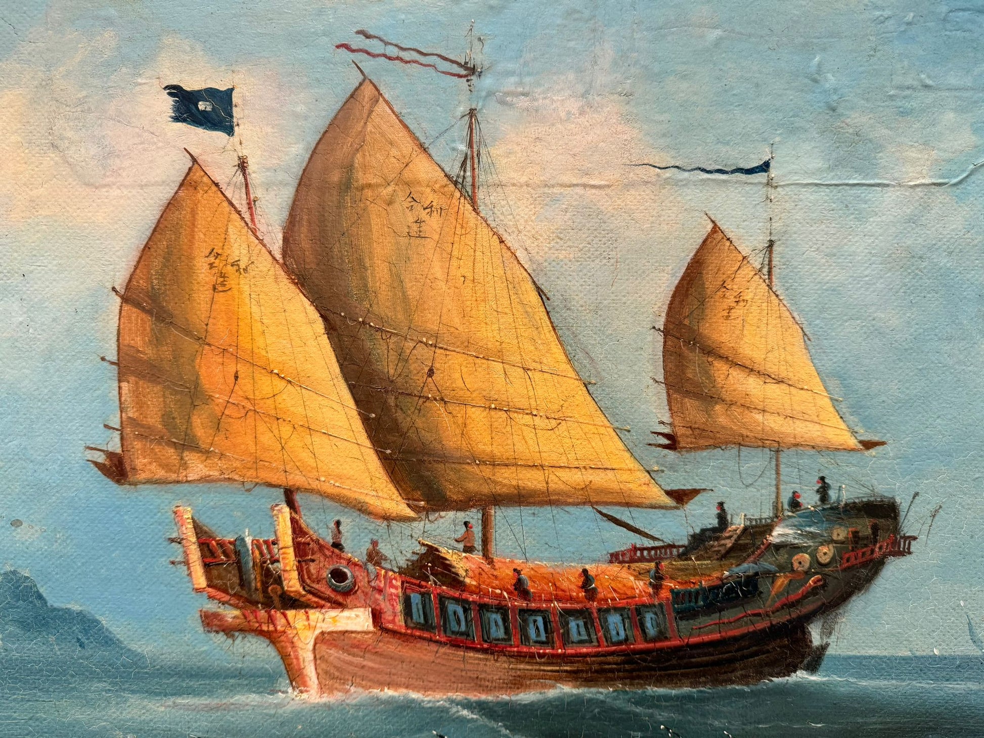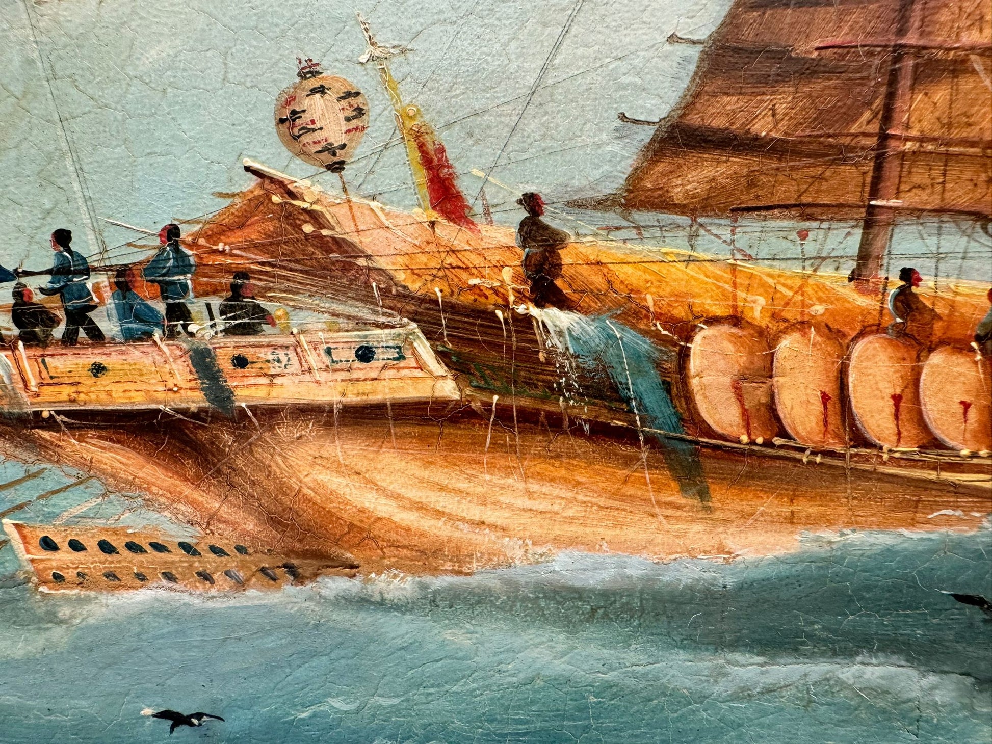 Pair of 19th Century Export School Oil Paintings of Junks at Sea