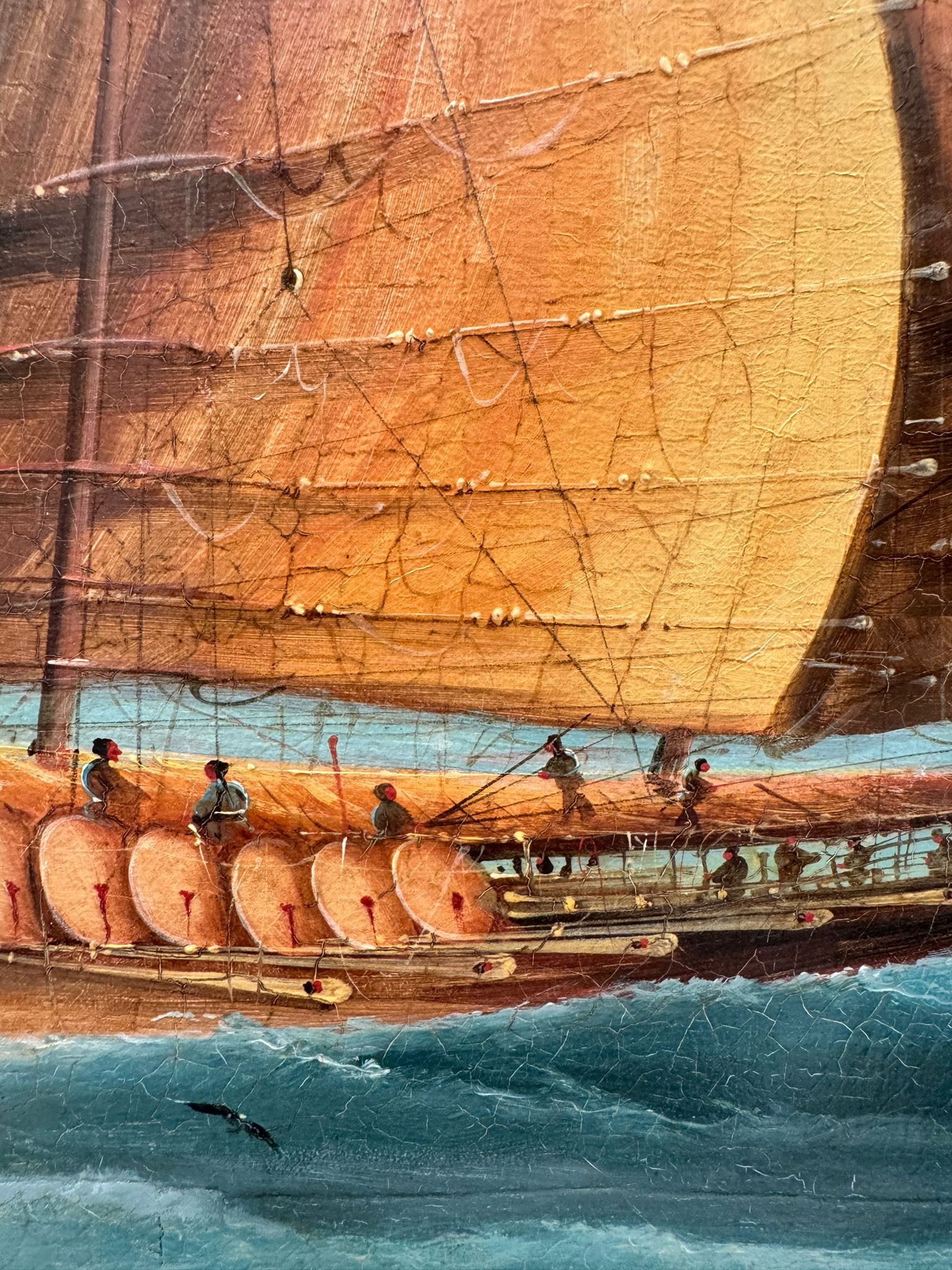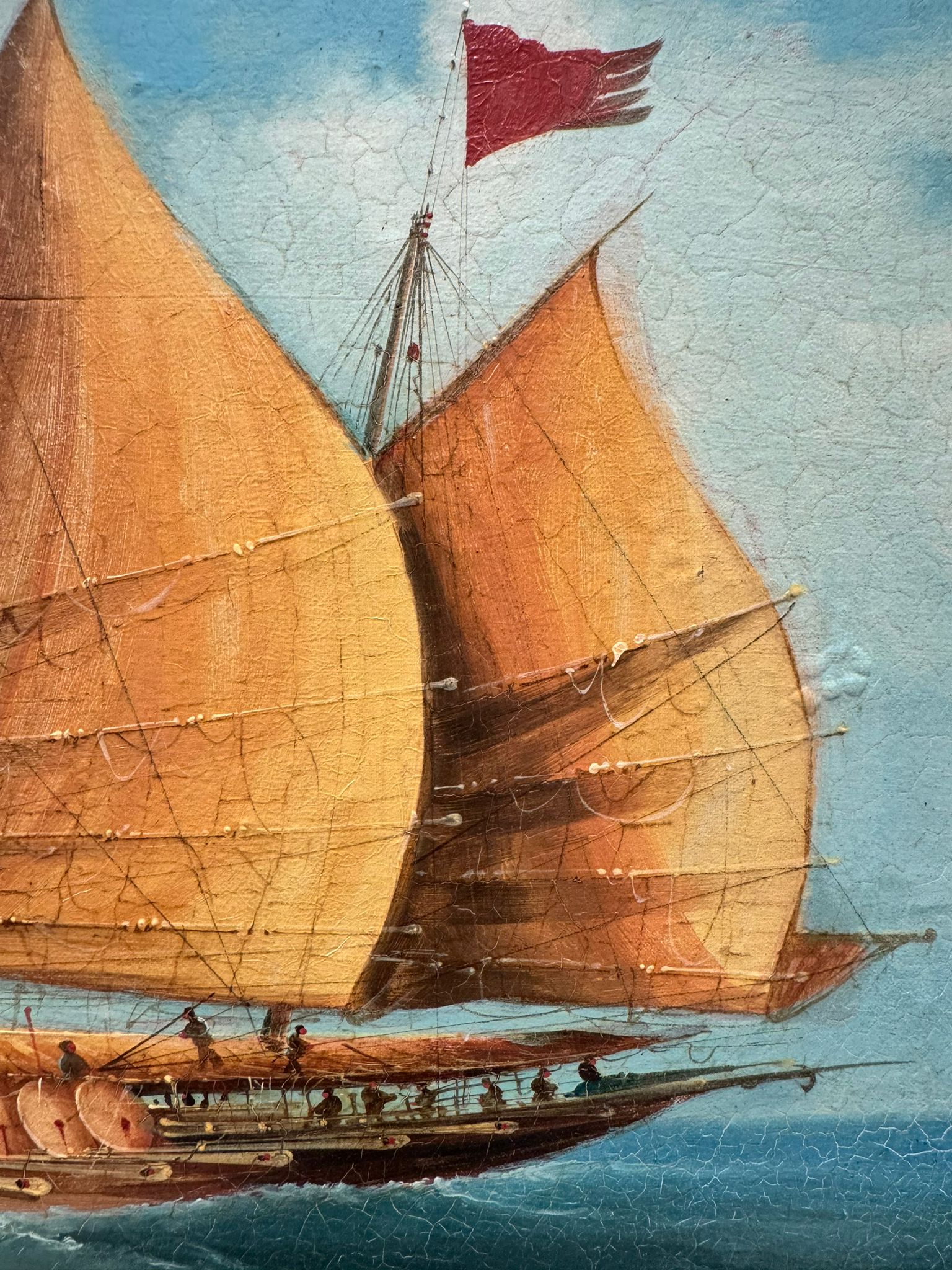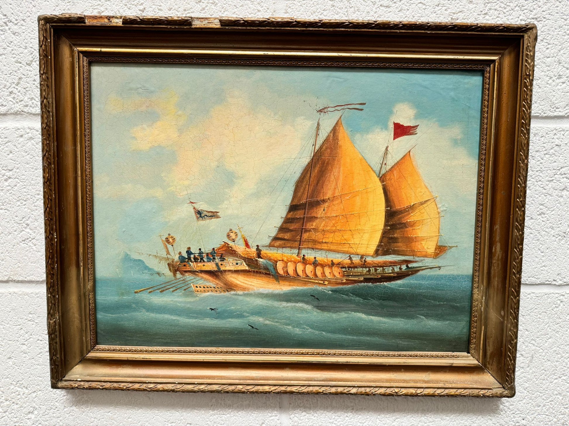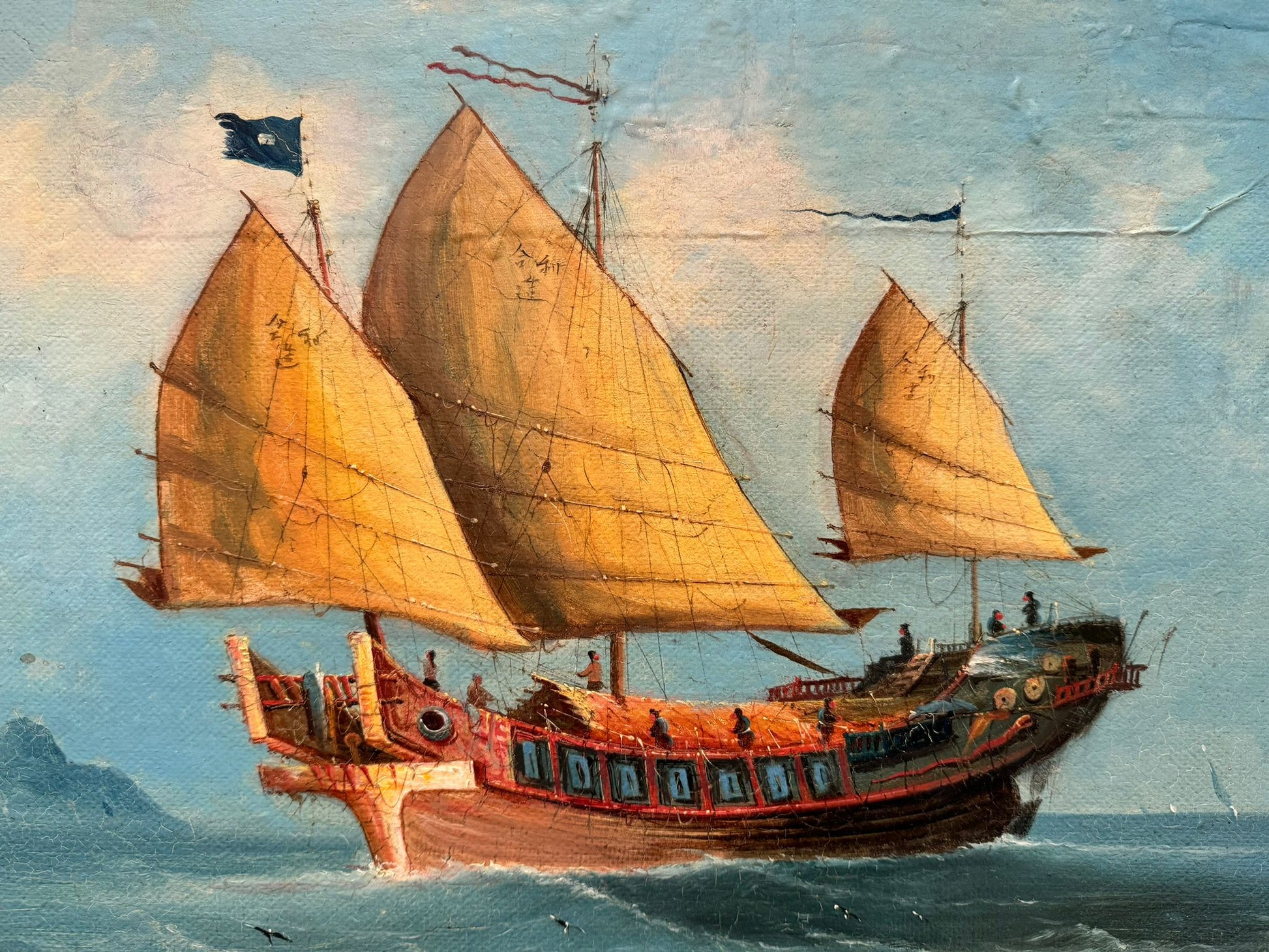Pair of 19th Century Export School Oil Paintings of Junks at Sea