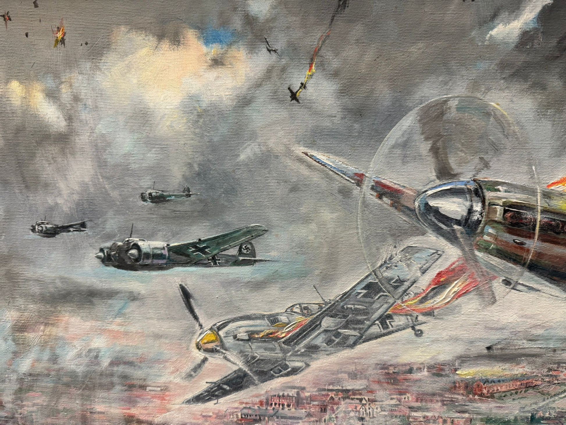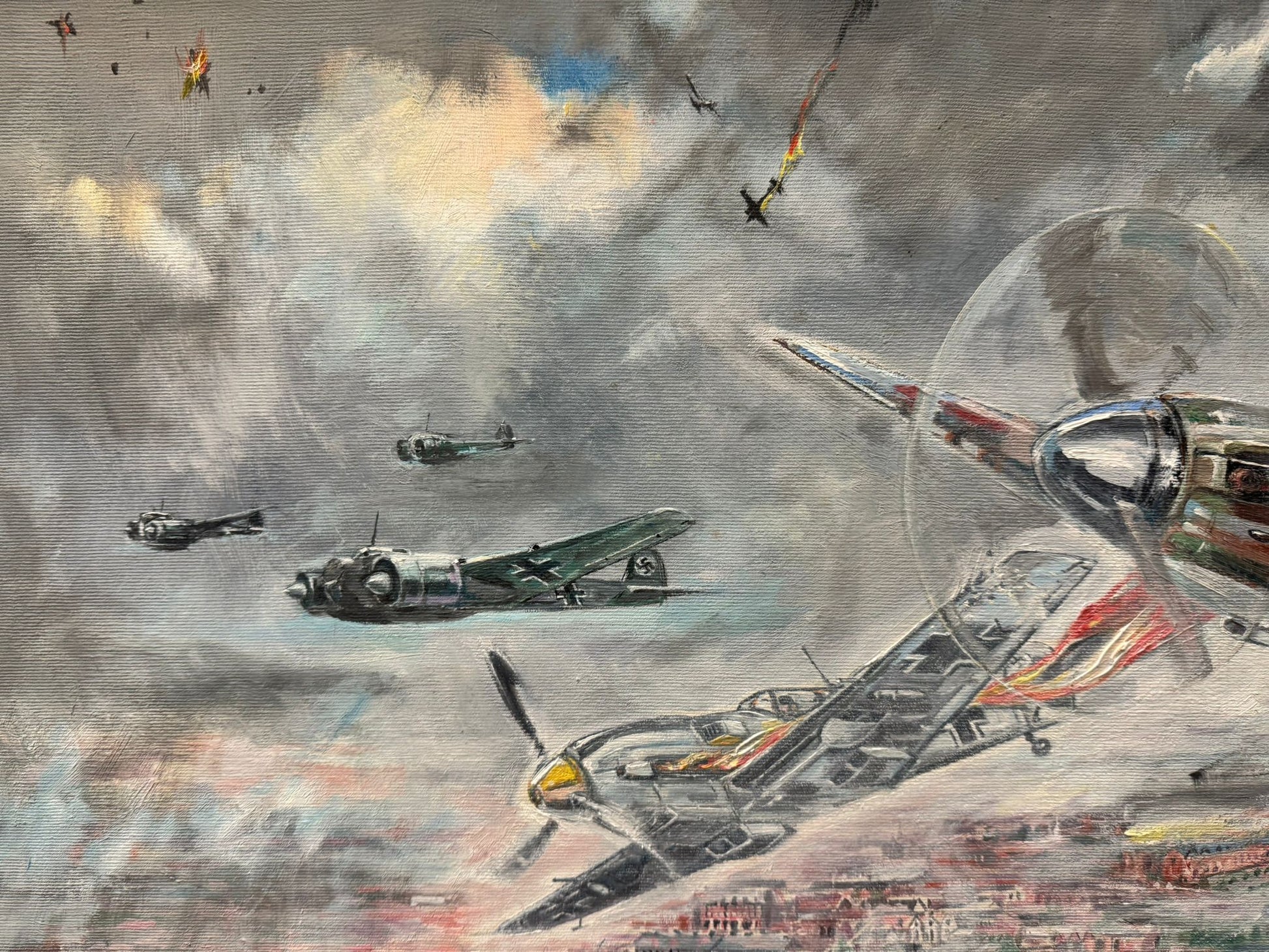 A highly decorative twentieth century oil painting by Ralph Gillies-Cole 1915-1994. The painting depicts a striking battle scene in the air. Signed to the lower left corner. Presented in a wooden frame, ready to hang.