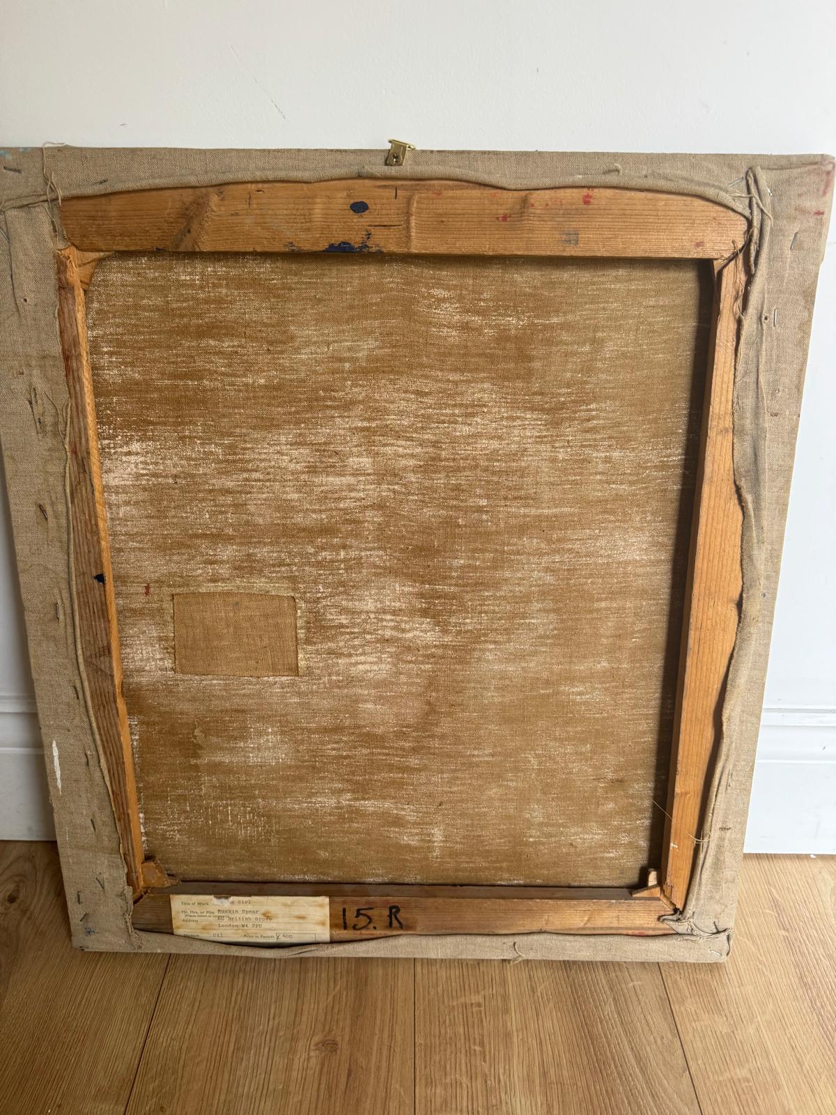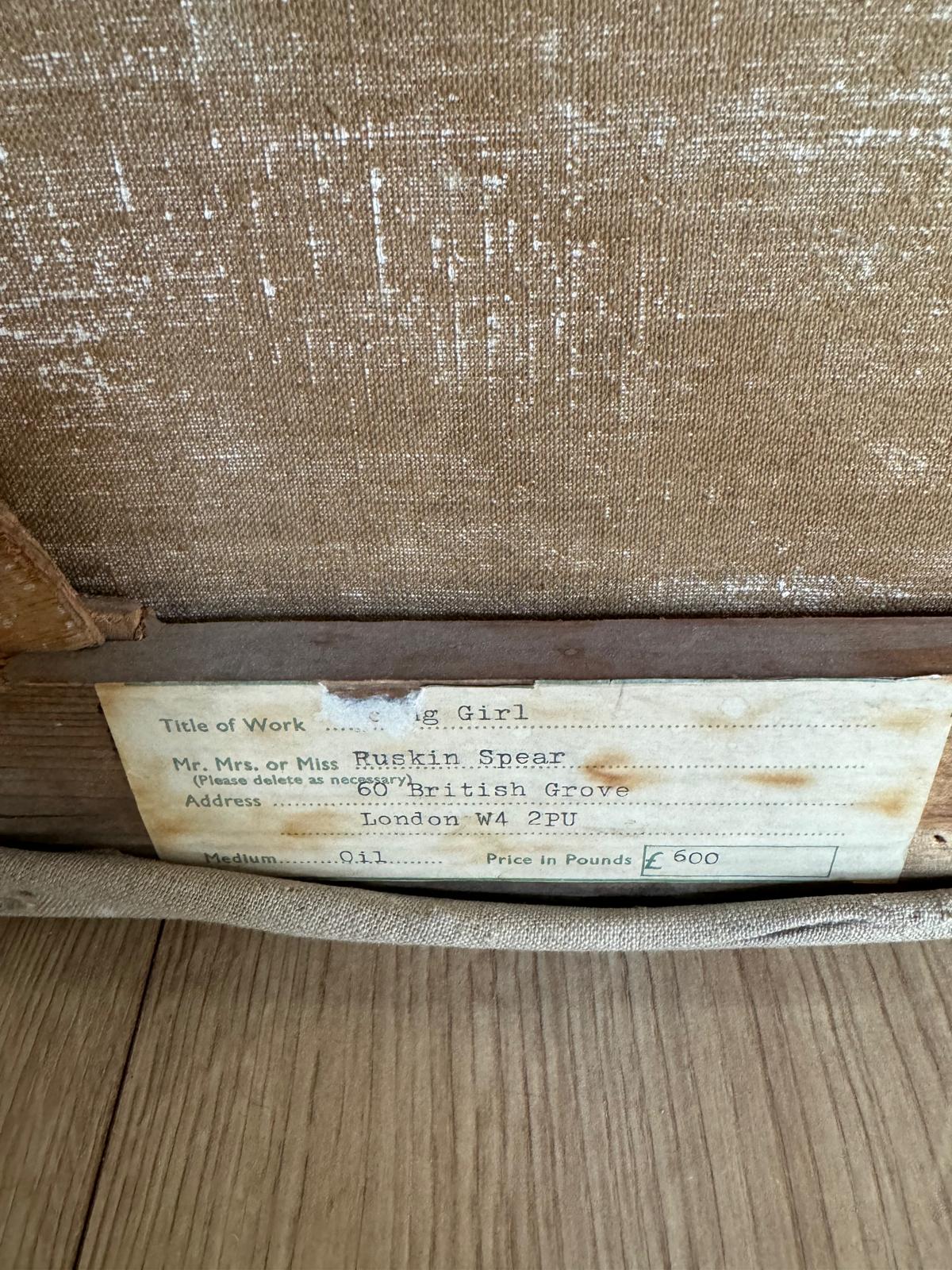 printed and typed exhibition label with full address - Ruskin Spear, 60 British Grove, London W4 2PU)