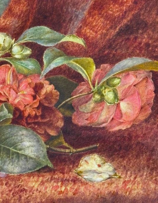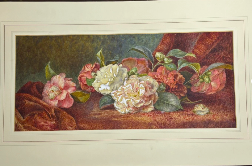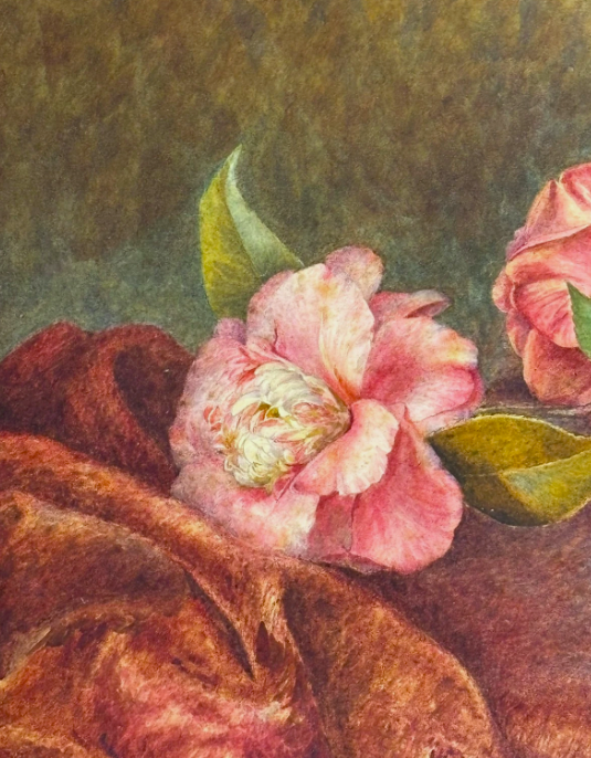 Selling here is an original oil painting by Sarah Manly. It is a beautiful impressionist piece of some flowers fallen on a red curtain.
