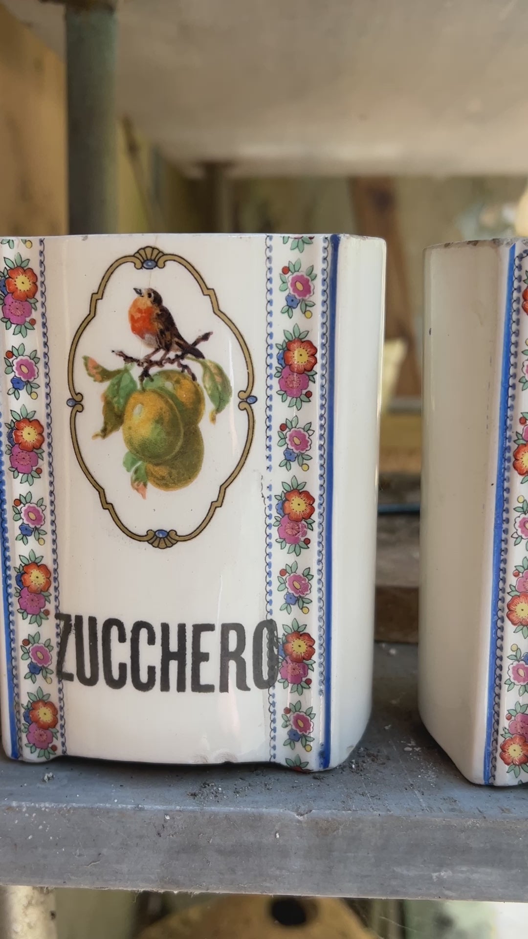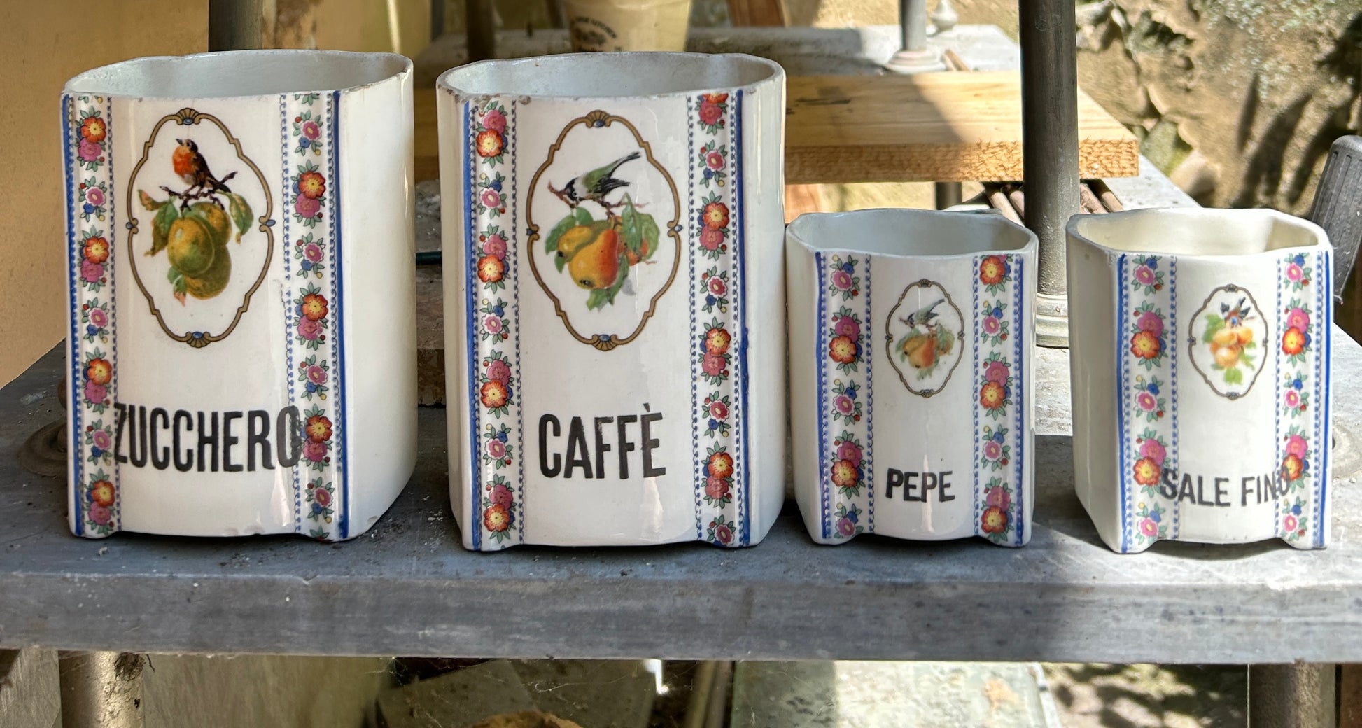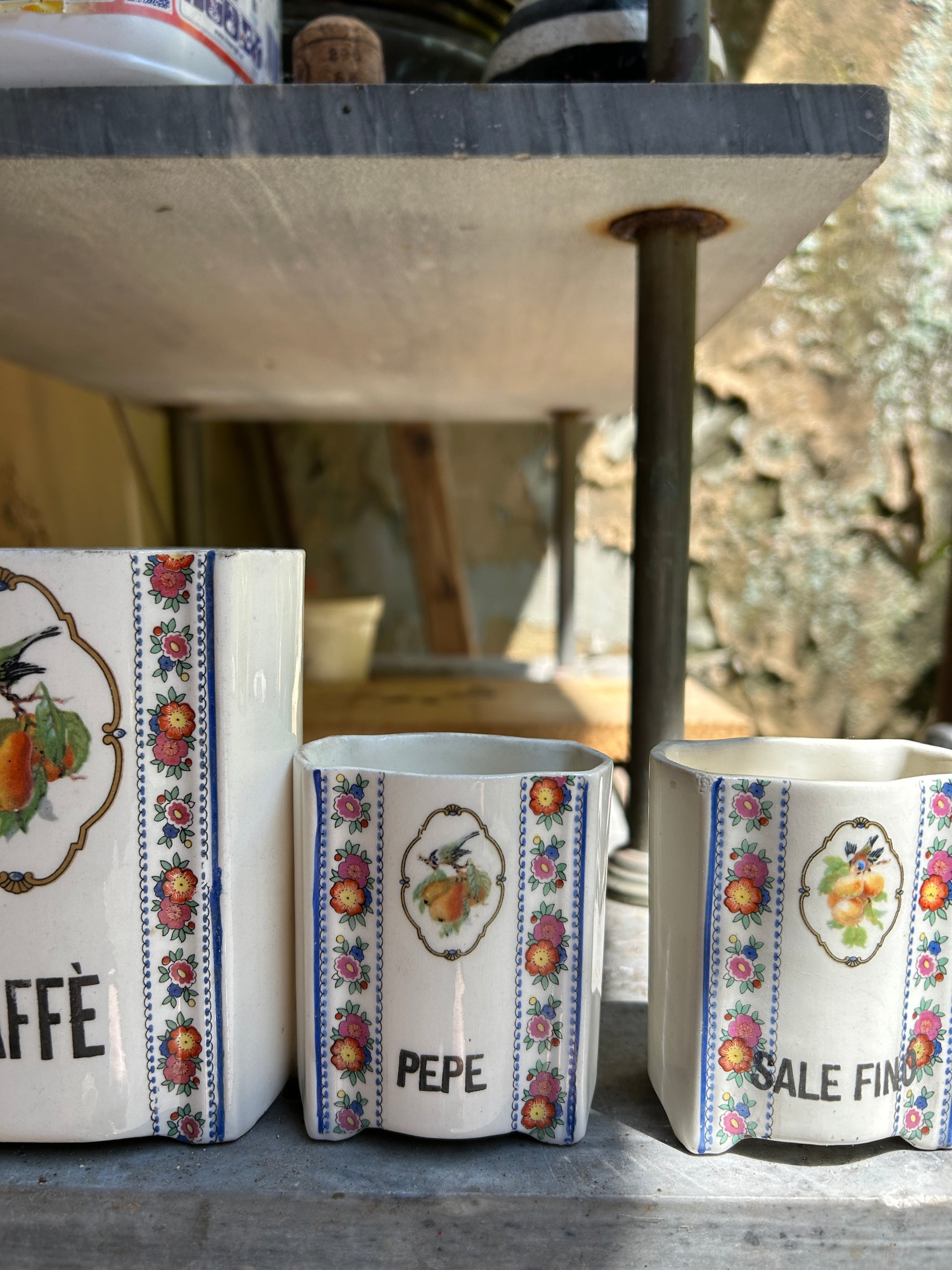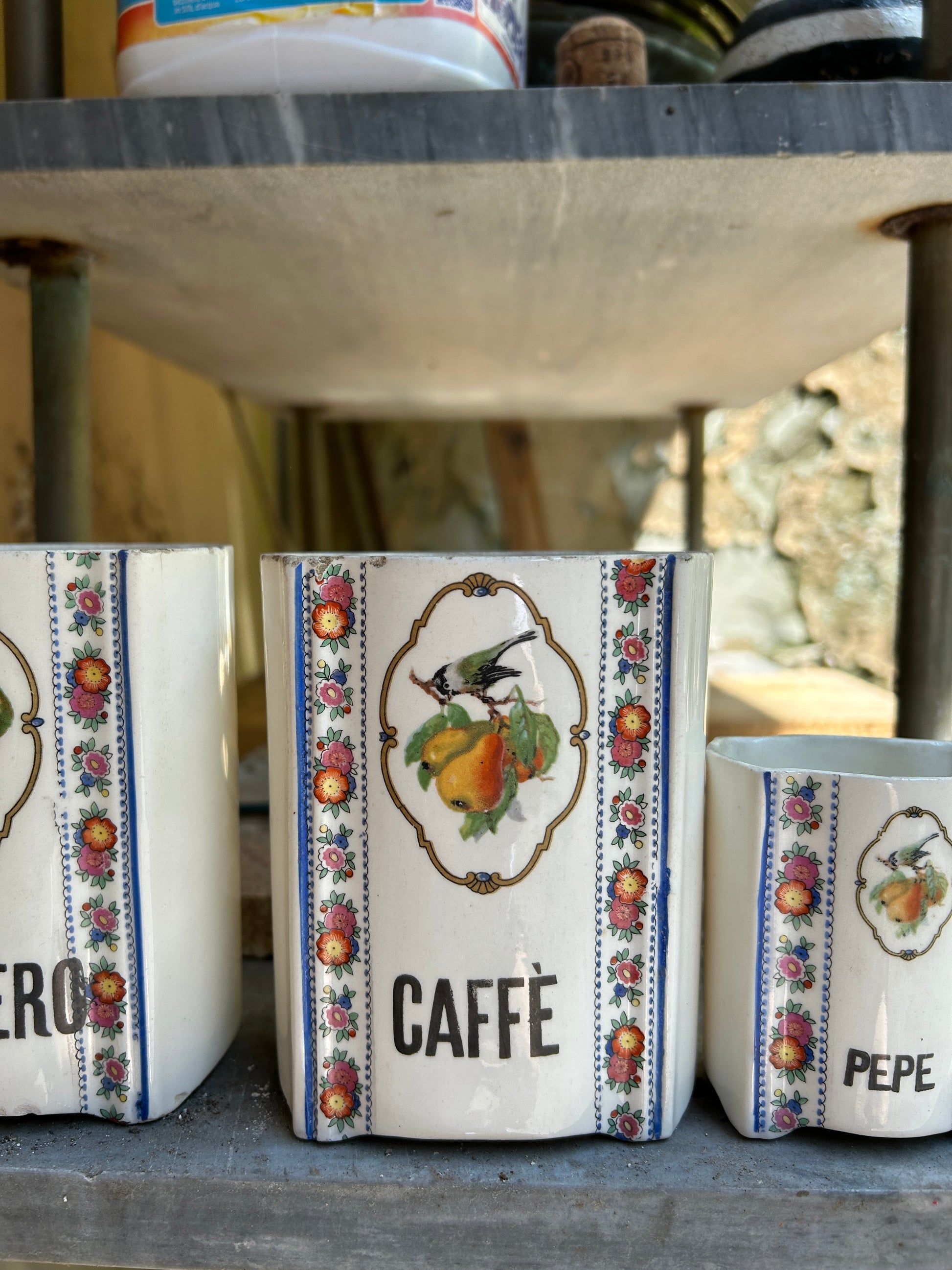 Set of adorable Italian cheerful and practical fine bone storage containers for sugar, coffee, pepper and salt. Made in Italy circa 1940/50's in perfect condition.