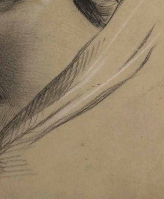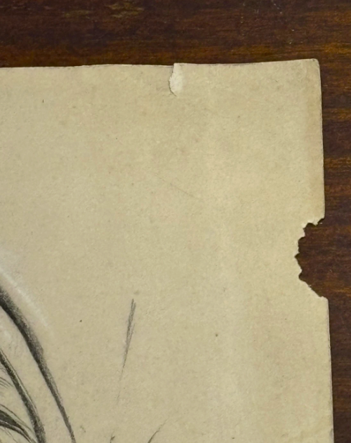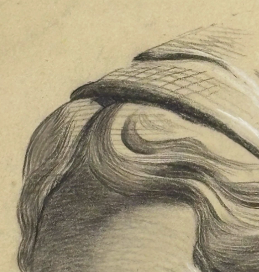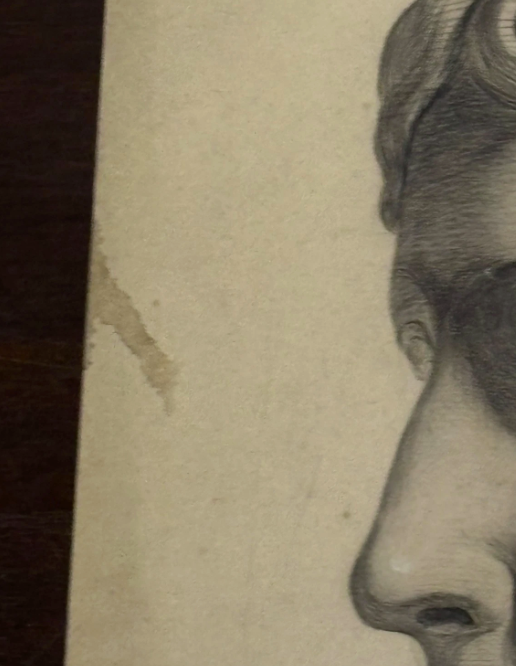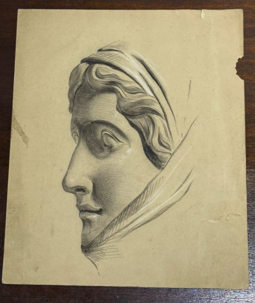 Selling here is an original sketch by an unknown artist of a statue's face. The sketch looks to be graphite with white highlight. This is a beautiful piece with a certain mysterious quality.