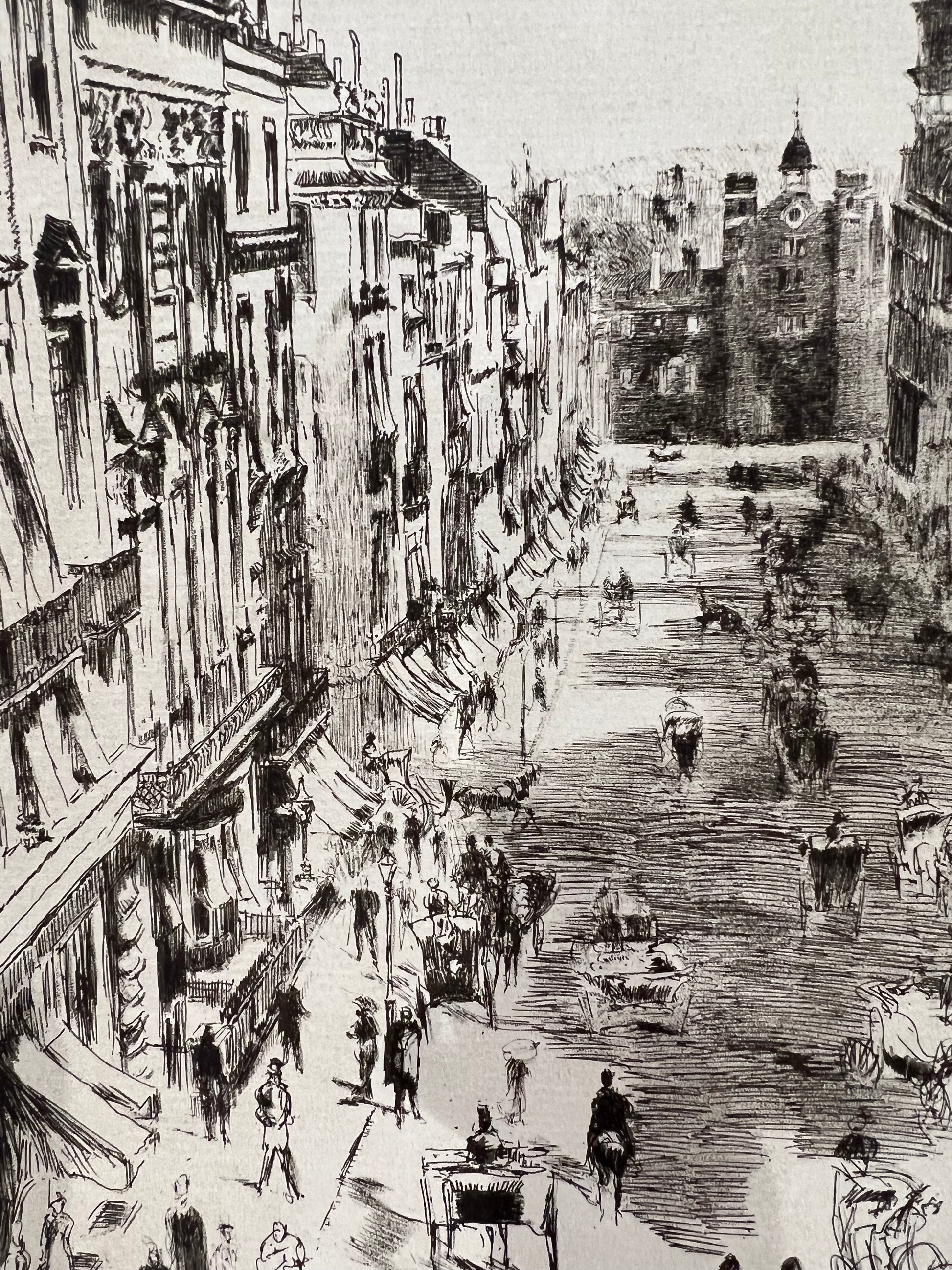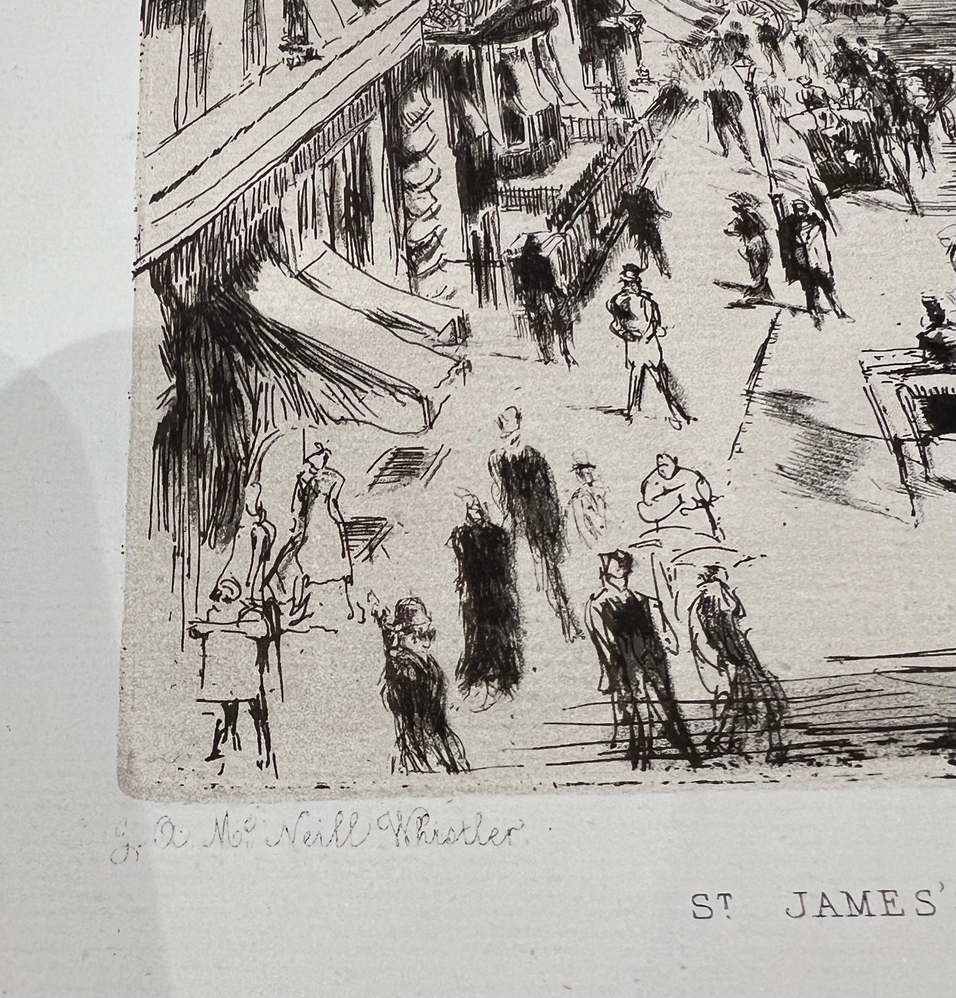 This important print is a view of St. James's Street in London by the revolutionary artist James McNiell Whistler. Painter, printmaker, designer, scholar, and aesthete, Whistler took the nineteenth century art world by storm. From his atmospheric paintings to his innovative etchings, Whistler's art forever changed the course of Western art, establishing a new language of art, which was both visual and literary.