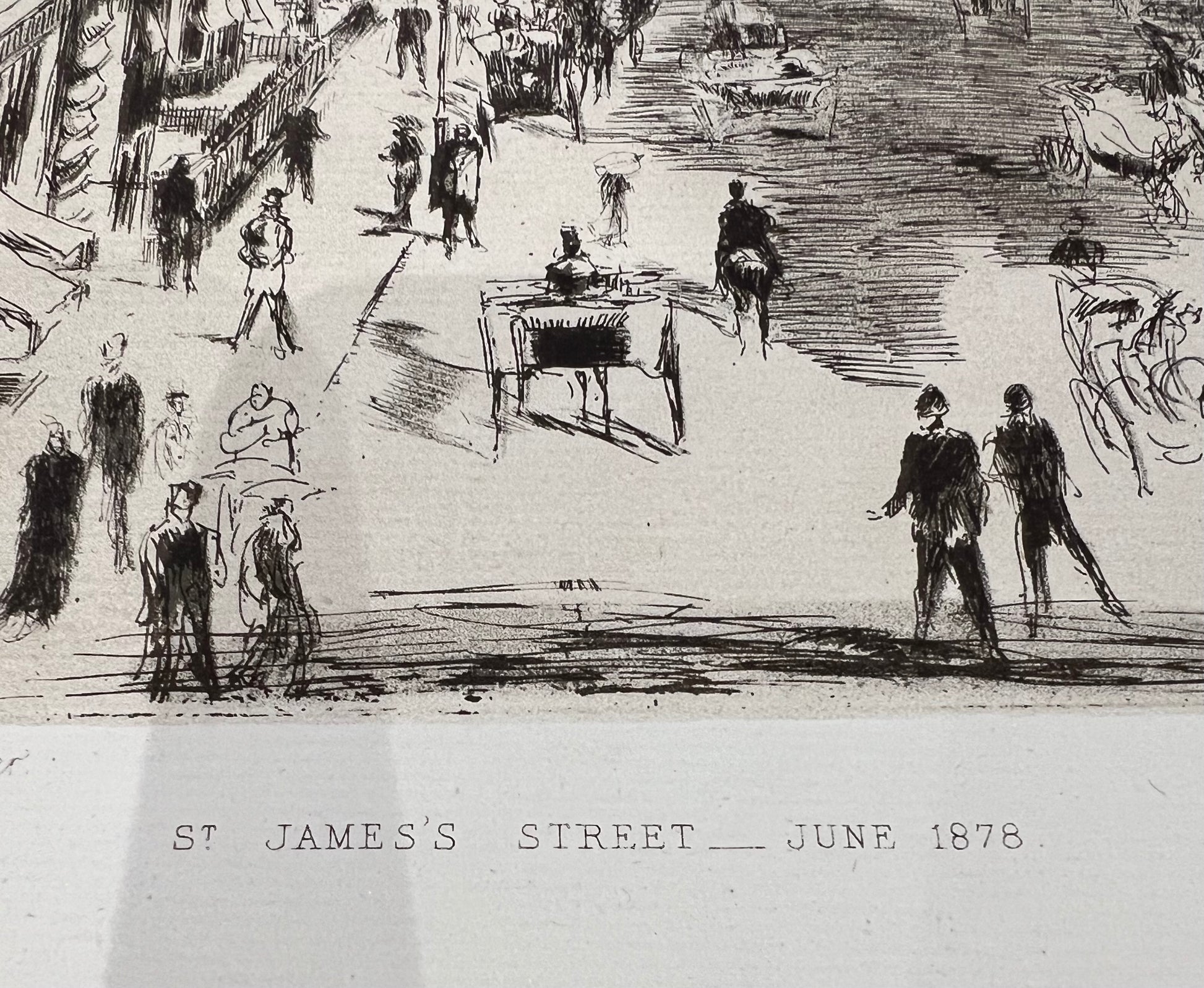 This remarkable print depicts a view from a house in Piccadilly, looking down St. James's Street towards St. James's Palace. It is typical of Whistler's London views, which were often peopled with groups of figures.