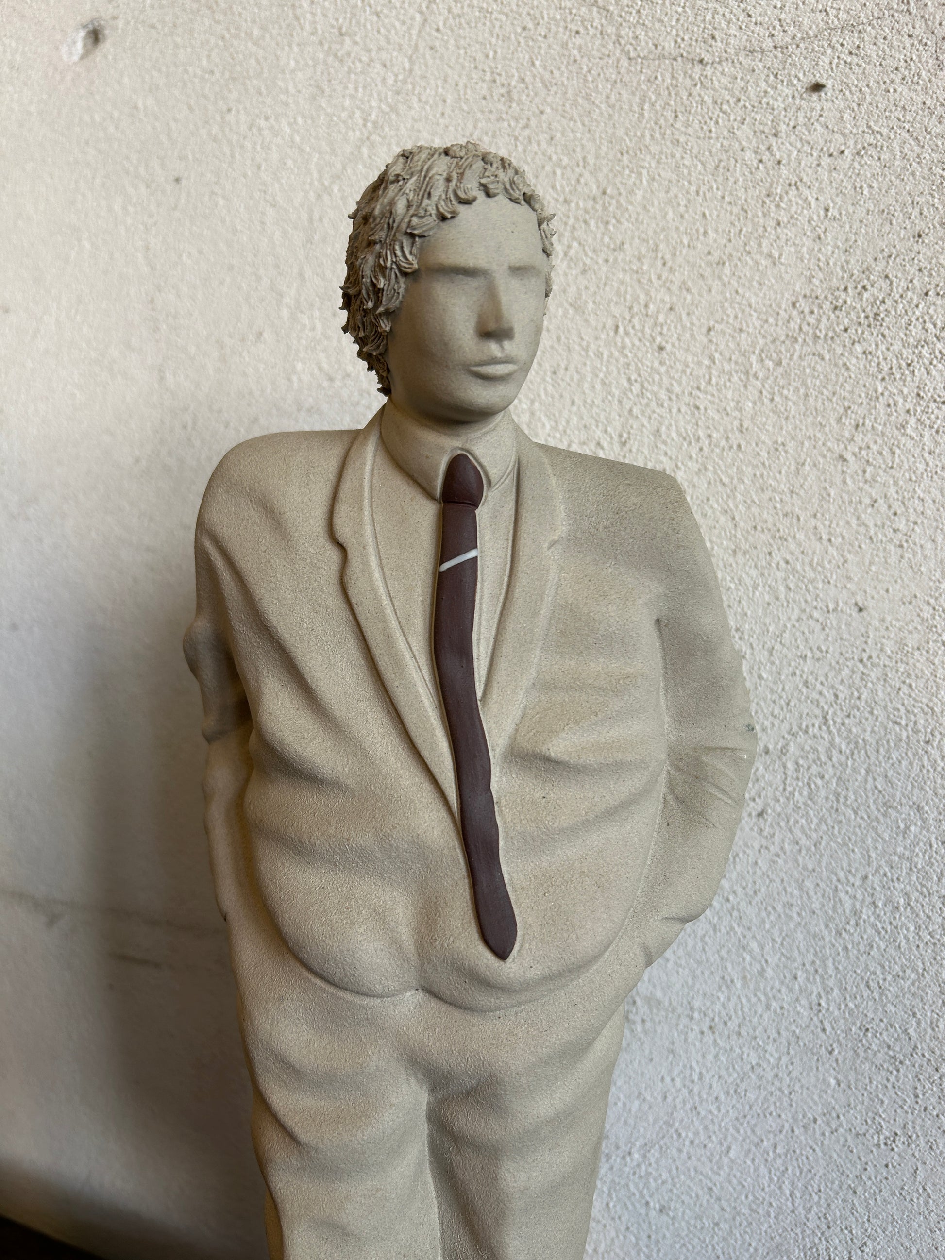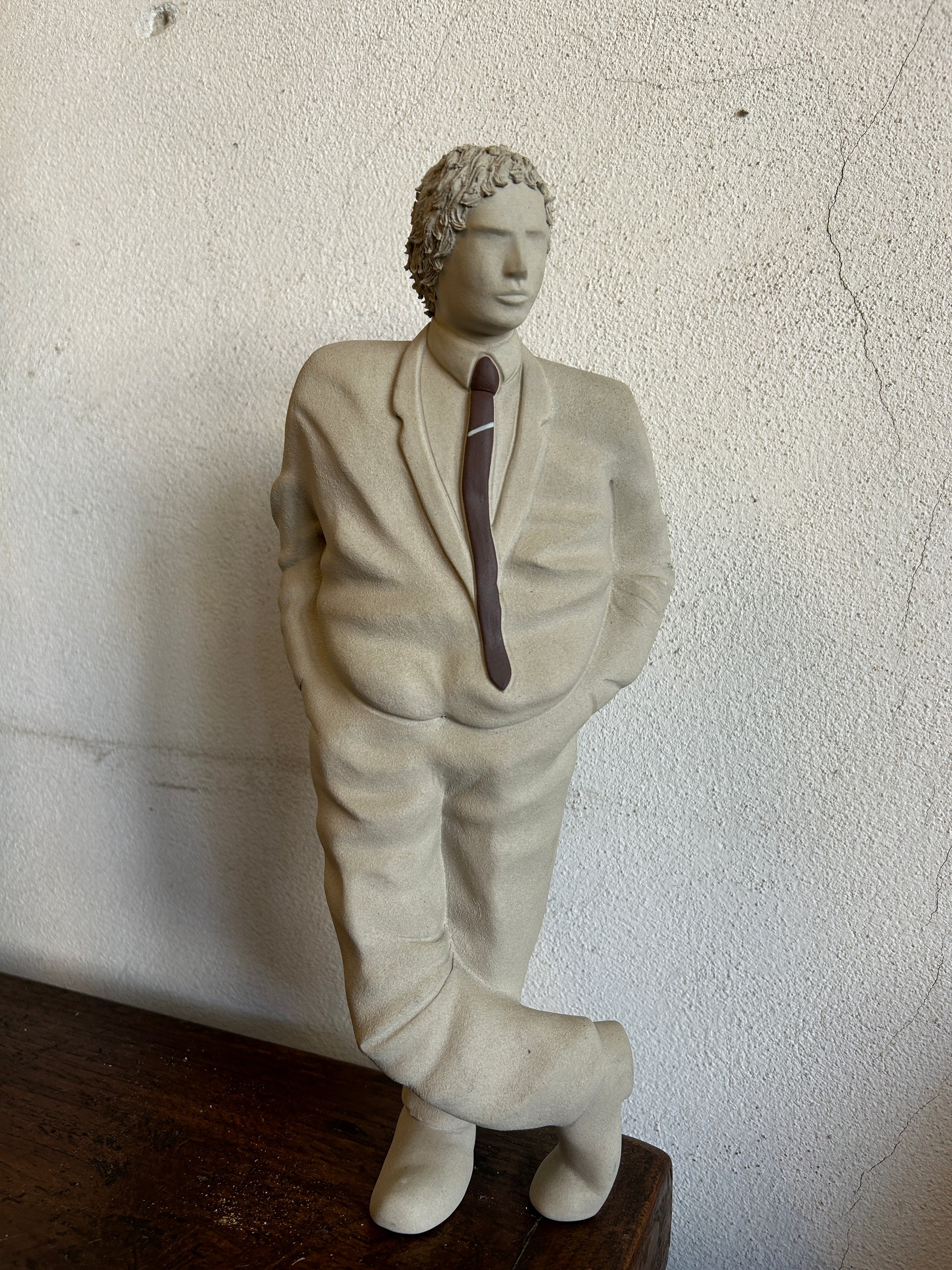 A really interesting unglazed ceramic limited editor sculpture of a gentleman in the heyday of the the office culture of the 1980's