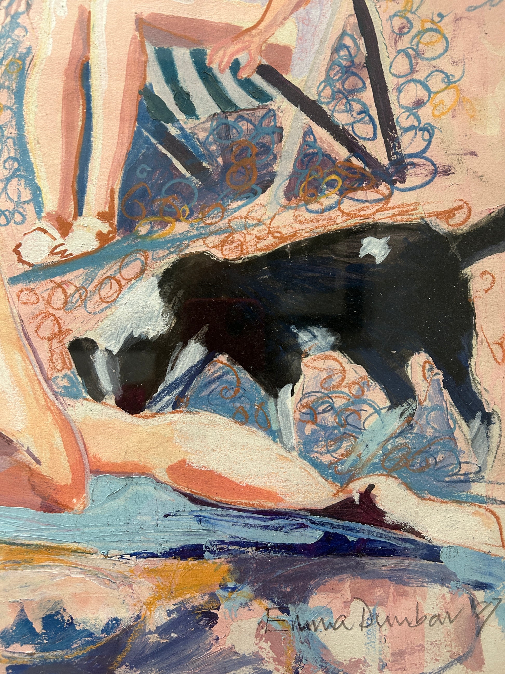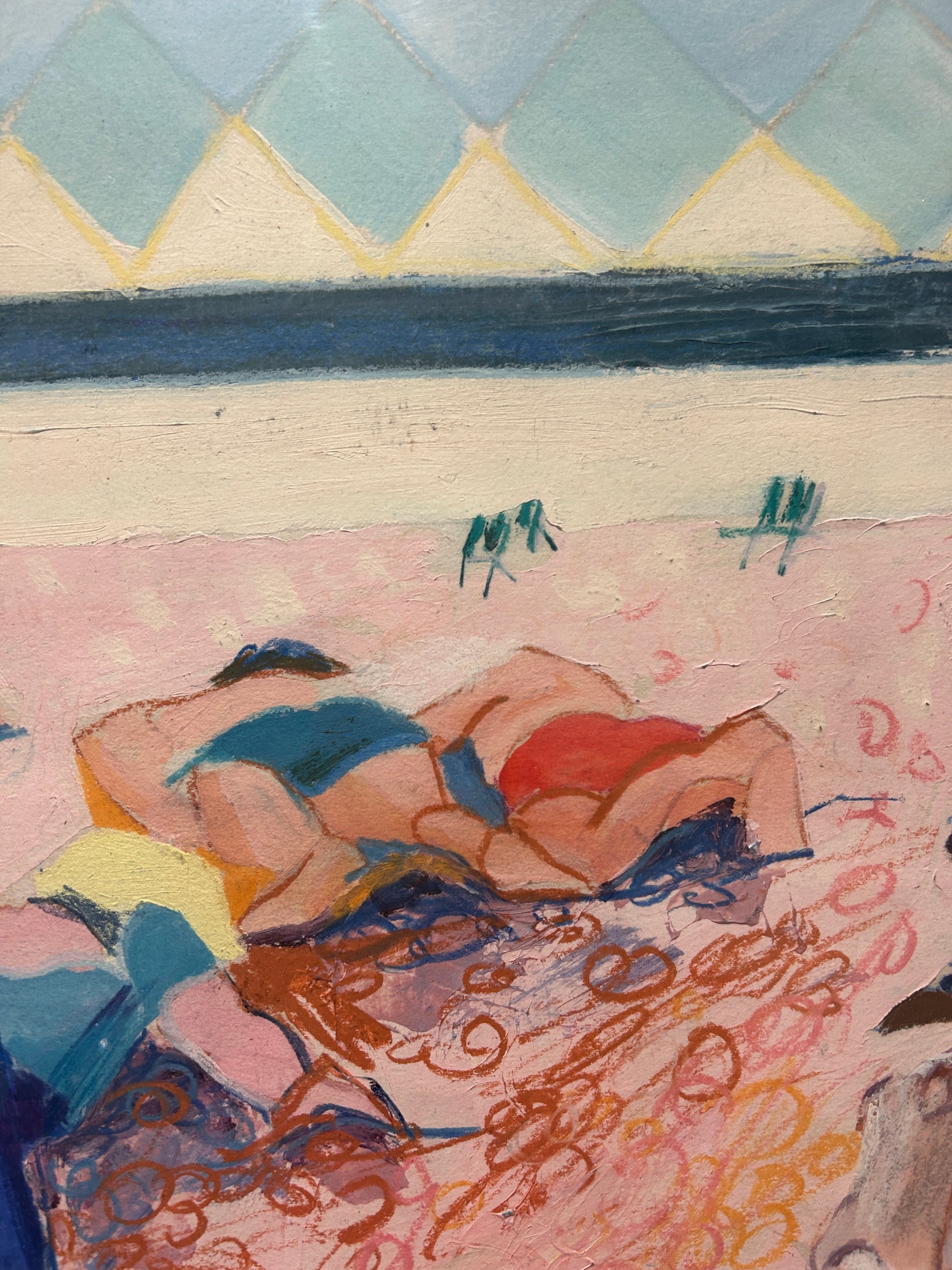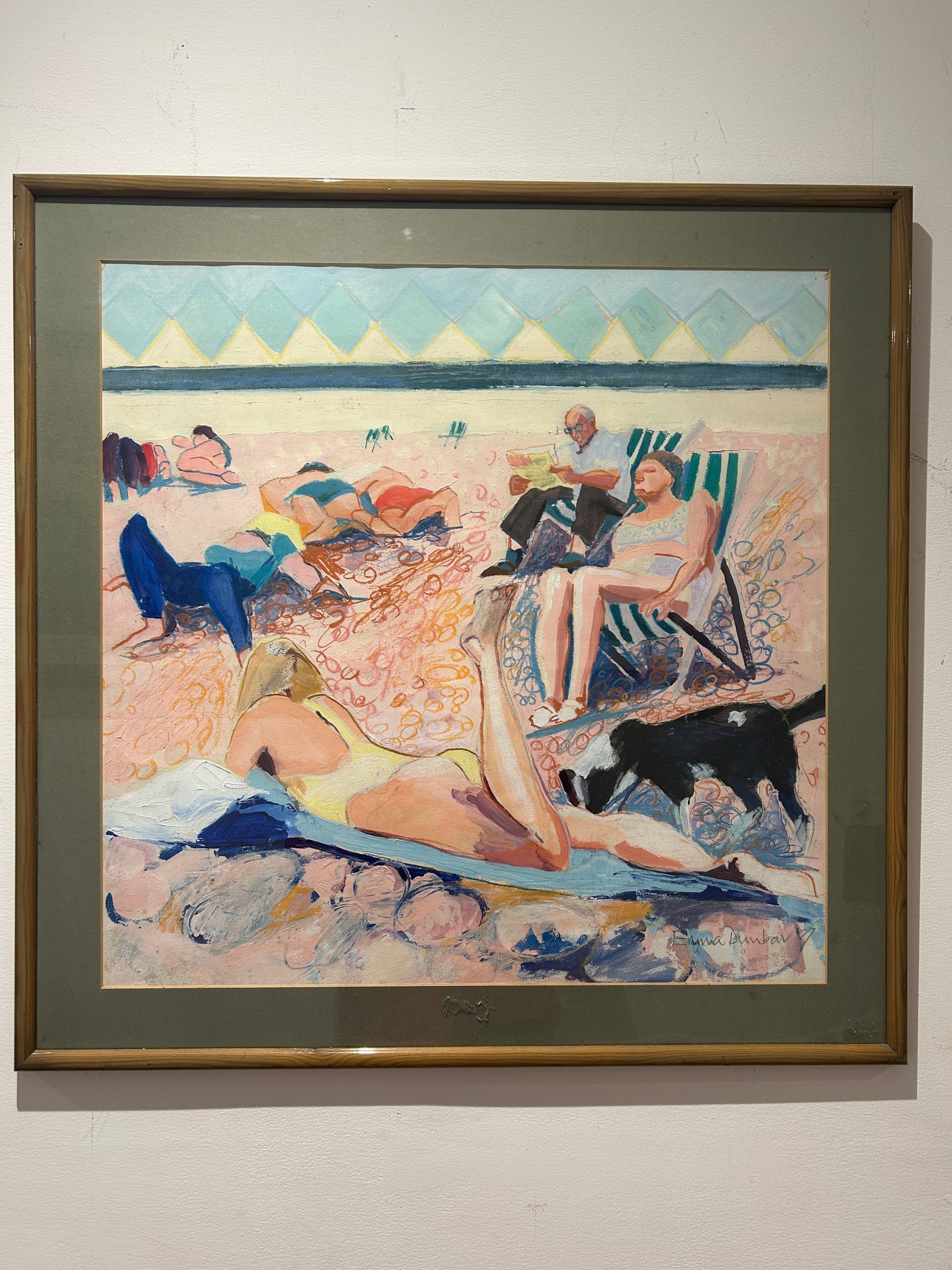 We love this painting depicting sunbathers and a dog on the beach in Brighton by the well listed and sort after British female contemporary artist Emma Dunbar b.1961.